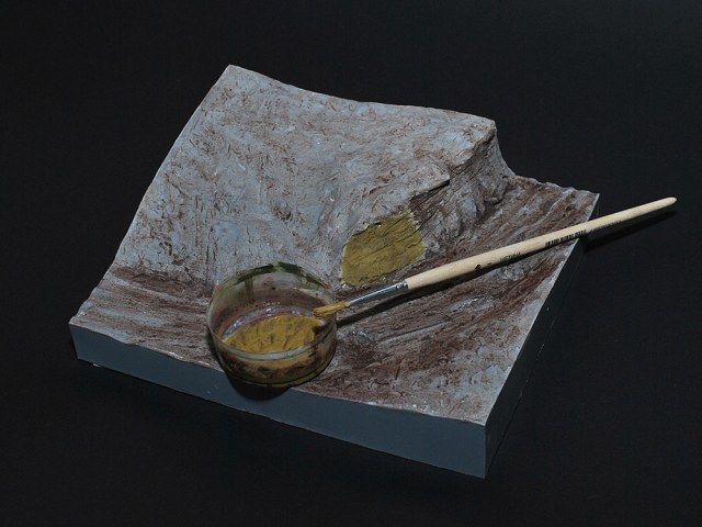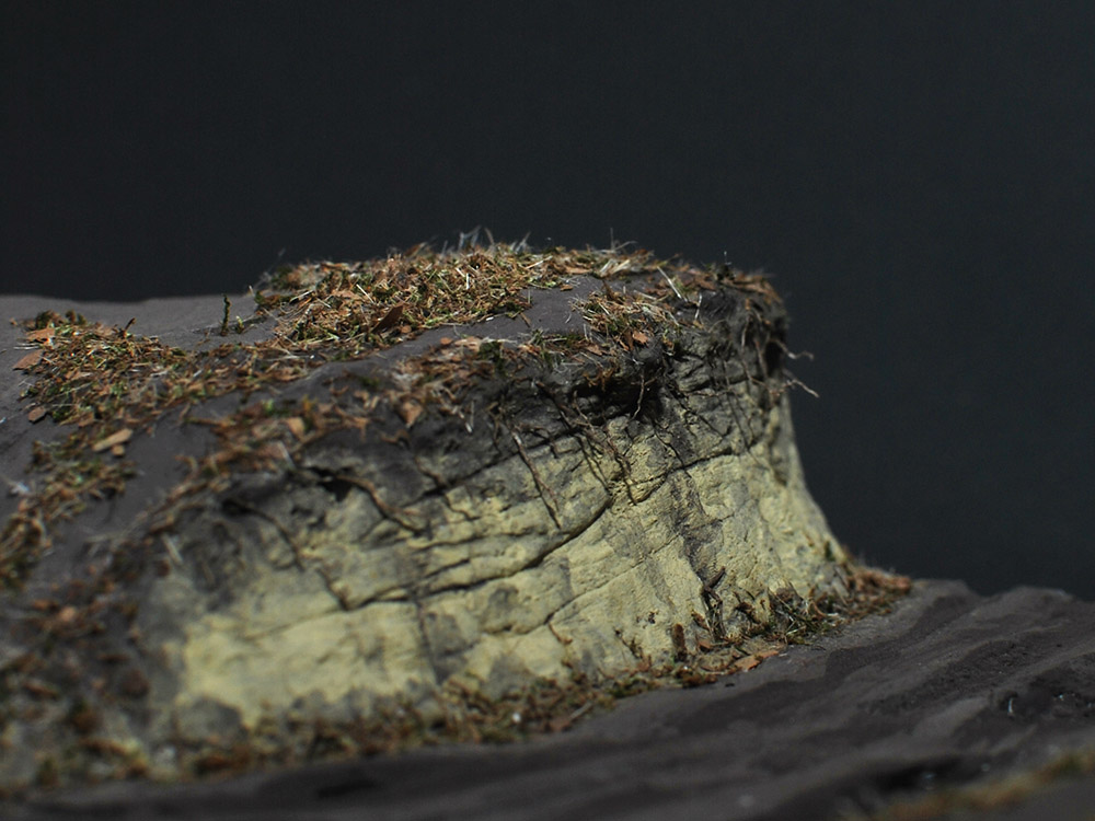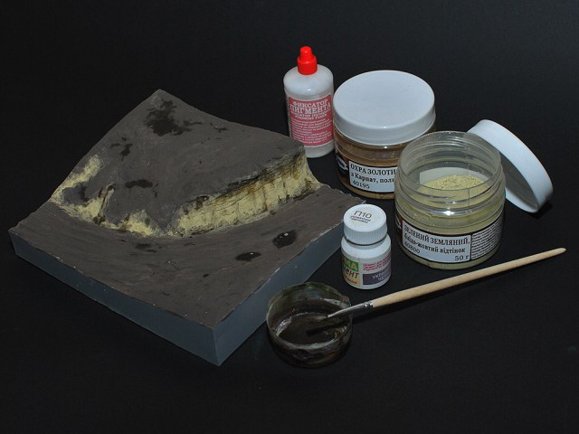 Добавил фото по подставке: опаловка - листовой пластик (он же и остался на гипсе), дно забросал скомканными бумажками, сверху залил гипсом (бумажный наполнитель для уменьшения веса подставки). Рельеф доводил уже загустевающим гипсом. Частично корректировал по сухому ножом. Сперва планировал, что мелко порубленная листва и трава будут местами выглядывать сквозь снежный покров. Но они дали желтизну на снег, пришлось снежный покров (из соды, снежного пигмента, белого акрила и фиксатора) делать в два прохода с промежуточной сушкой сутки. Корни на обрыве и деревья с кусторником - высушенные корни из огородных культур. Из чего мешал цвета почвы и суглинка видно на фото (пигменты покупал в художественном магазине по очень смешным ценам, 100-граммовые банки по 50-80 руб.)