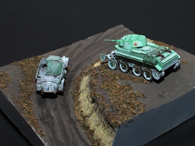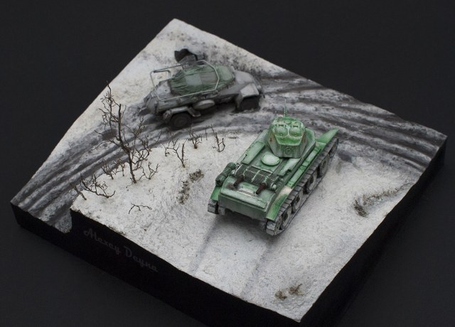 Цвет БТ странный. Ещё броневик как будто подорвался на мине и так его бросили, не похоже что БТ его догнал и подбил. А так отличная диорама, очень понравилась.