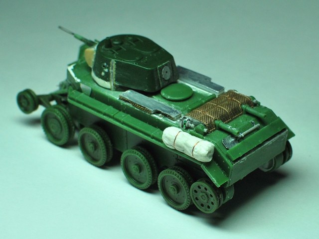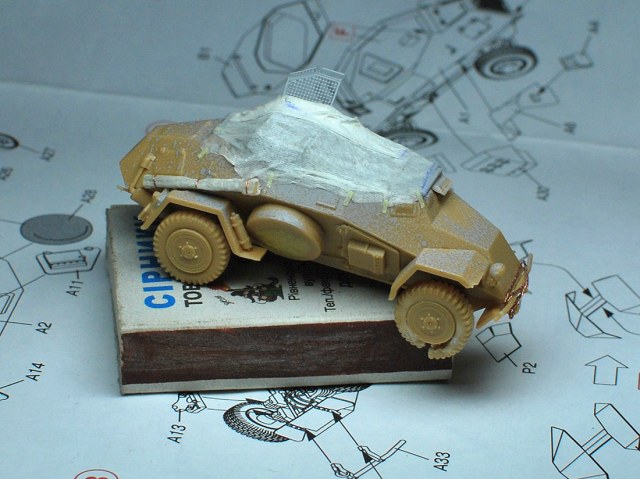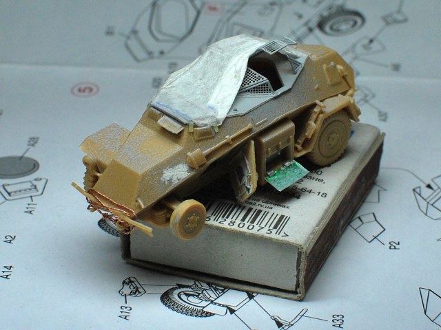 Модели подверг некоторым переделкам как в погоне за копийностью, так и чтоб реализовать сюжет (бронеавтомобиль, подорвавшись на партизанской мине, потерял левые шину переднего колеса и крыло, требовал ремонта). Использовал для этого пивжесть, двухкомпонентку от Тамии, листовой пластик. Ландшафт: гипс, пигменты на фиксаторе, деревья и кустарник - корни огородных культур.