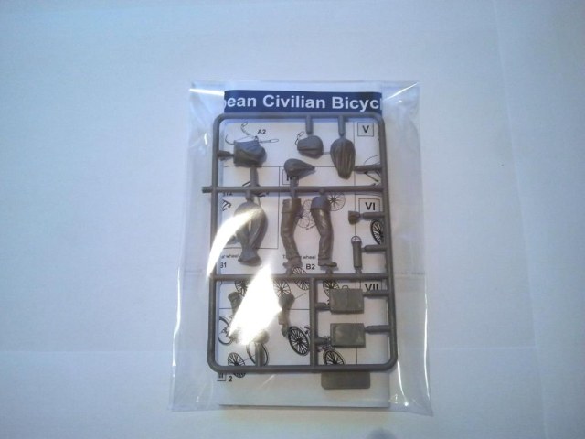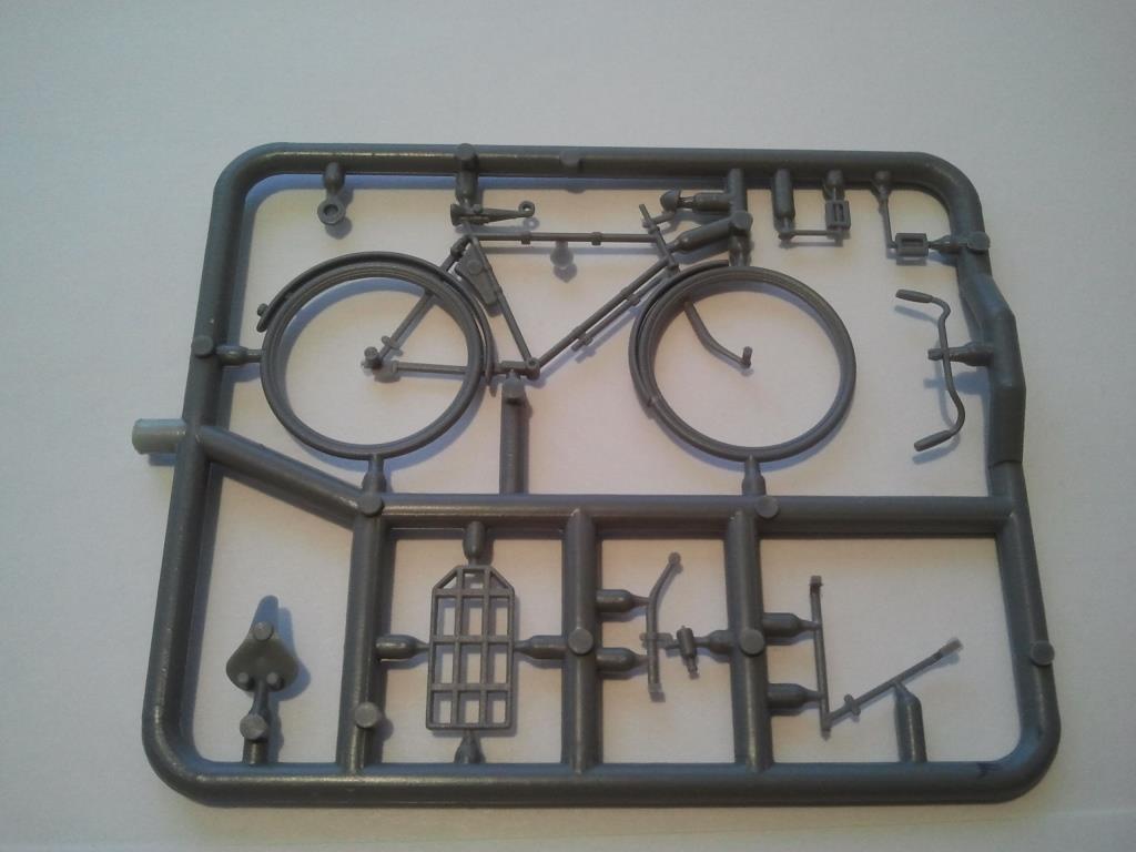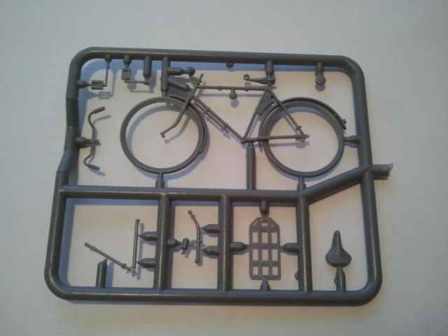 Модель очень миниатюрна и хрупка за счет мелких и очень тонких деталей. Сами отливки достойны для такого тонкого исполнения, но конечно не без греха. Master Box выпустил достойную модель велосипеда, и на мой взгляд велосипед им удался. На литниках присутствует слабый облой. Особенно виден он на теле гражданина. Велосипед выполнен просто идеально. Очень порадовало отсутствие следов толкателей.