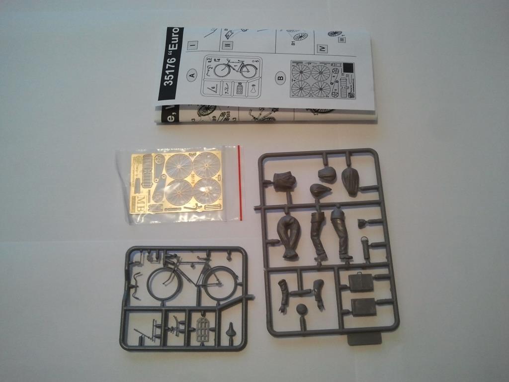 Коробка довольно внушительна, по соотношению ее содержимого. В наборе находиться два литника: велосипед, гражданин и плата травления (что меня очень сильно порадовало), скудная инструкция.