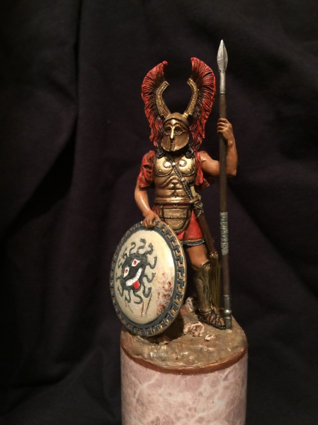 Первая попытка окраски фигурки в размере 54 мм. Акрил "Звезда". Подставка - имитация мрамора, декупаж. Неудачно покрыл лаком, матовый лак при излишнем нанесении дает хорошо видимый блеск.