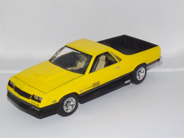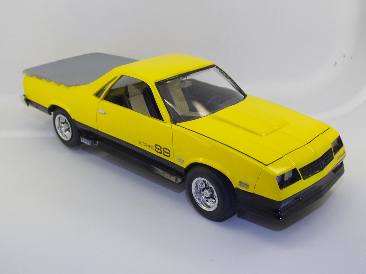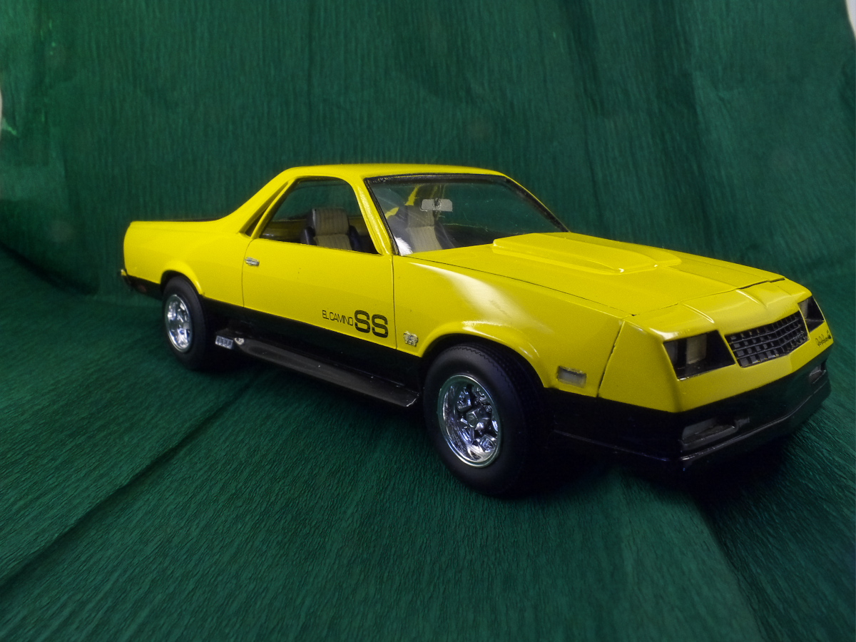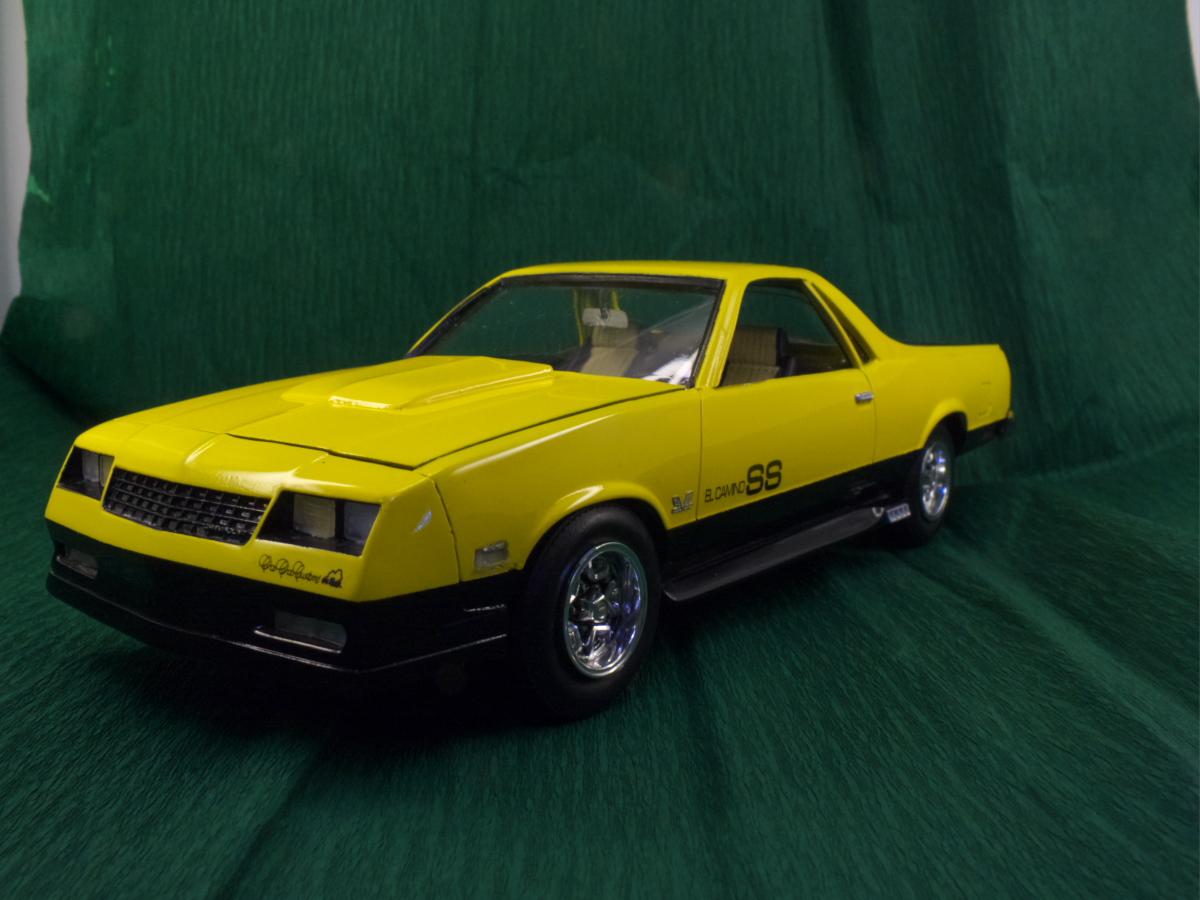 Вот и закончен Chevrolet El Camino 1986 года. Собирался вот из этой коробки. При сборке ориентировался на фотографии Наскаровского пейс кара, конечно люстры и декалей таких у меня не нашлось, но схему окраски постарался соблюсти. Как верно писали в отзывах на Амазоне, носовая часть у этой модели категорически не хотела сходится. Боковые габариты были отлиты на кузове в пластике, возможно слишком оптимистично я их вырезал, и заменил деталями выточенными из прозрачного литника. Но получилось как то не аккуратно, нужно прокачивать скилл точности. У прототипа головная оптика затонирована в желтый цвет, попытался сделать так же, но клир от revell видимо полное г..., т.к. оказался совсем не прозрачным, а каким то мутным. Поэтому на внешних фарах сточил его, внутренние оставил мутно-желтыми. В работе также использовал набор фототравления, правда для более раннего El Camino. Дверные ручки перед обработкой кузова были срезаны, и приклеены уже после финишной полировке. Кузов лакировался и полировался, и по большей части выглядит как зеркало, но фотографии этого почему то не передают.
