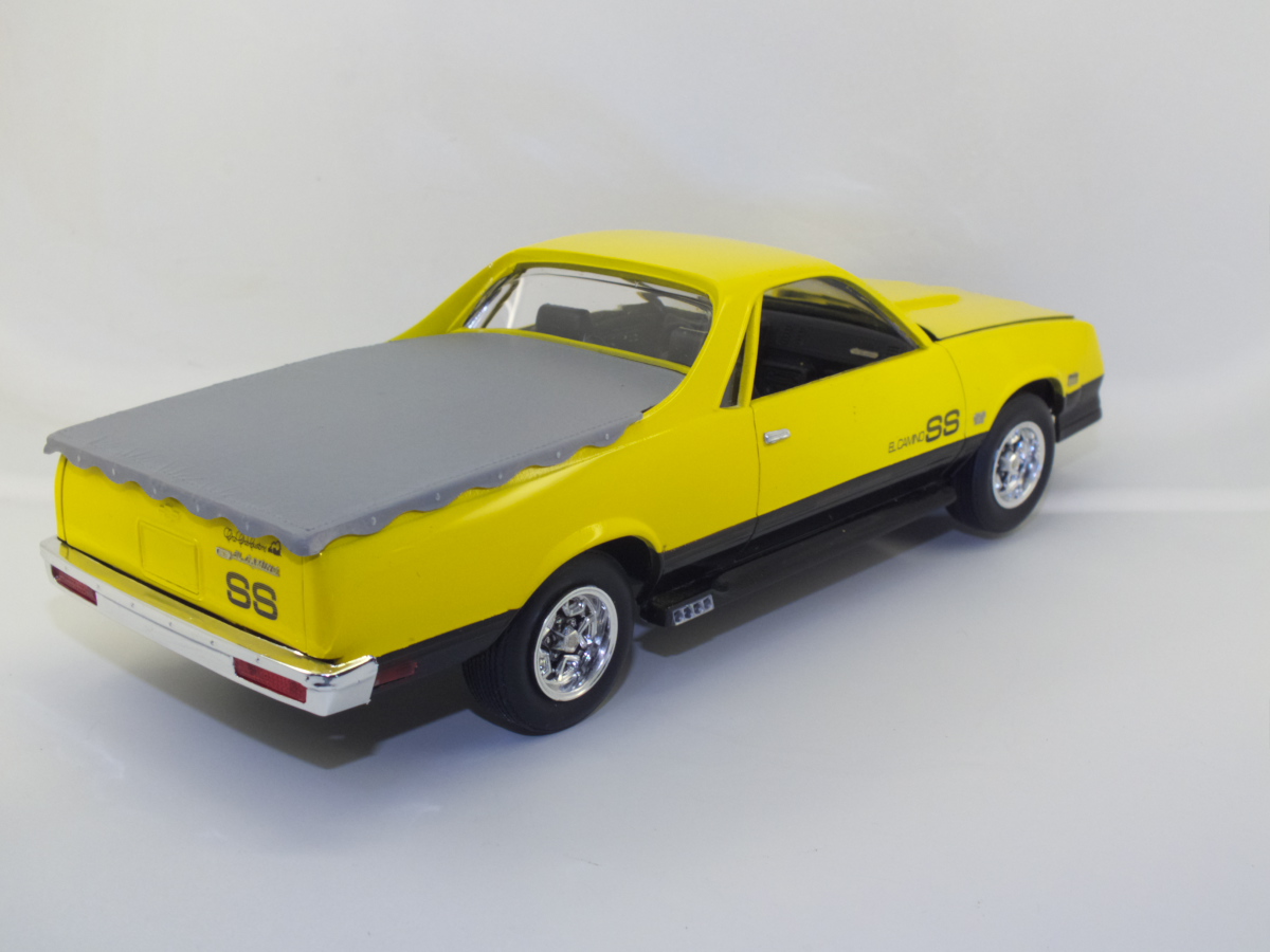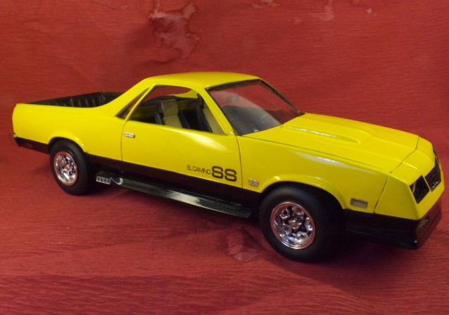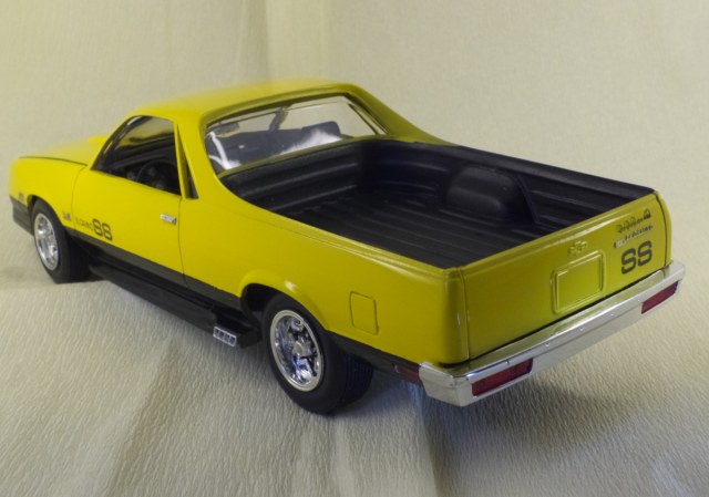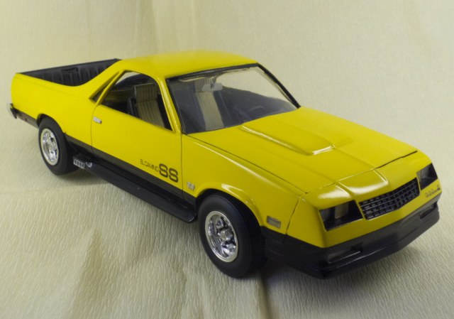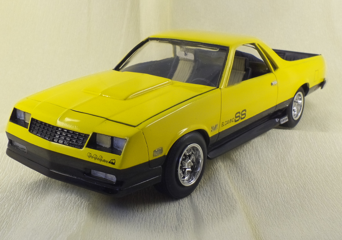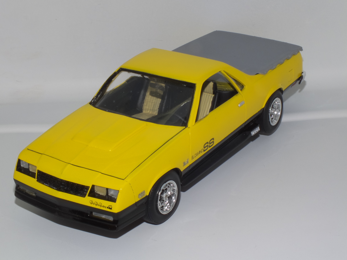 Вот и закончен Chevrolet El Camino 1986 года. Собирался вот из этой коробки. При сборке ориентировался на фотографии Наскаровского пейс кара, конечно люстры и декалей таких у меня не нашлось, но схему окраски постарался соблюсти. Как верно писали в отзывах на Амазоне, носовая часть у этой модели категорически не хотела сходится. Боковые габариты были отлиты на кузове в пластике, возможно слишком оптимистично я их вырезал, и заменил деталями выточенными из прозрачного литника. Но получилось как то не аккуратно, нужно прокачивать скилл точности. У прототипа головная оптика затонирована в желтый цвет, попытался сделать так же, но клир от revell видимо полное г..., т.к. оказался совсем не прозрачным, а каким то мутным. Поэтому на внешних фарах сточил его, внутренние оставил мутно-желтыми. В работе также использовал набор фототравления, правда для более раннего El Camino. Дверные ручки перед обработкой кузова были срезаны, и приклеены уже после финишной полировке. Кузов лакировался и полировался, и по большей части выглядит как зеркало, но фотографии этого почему то не передают.