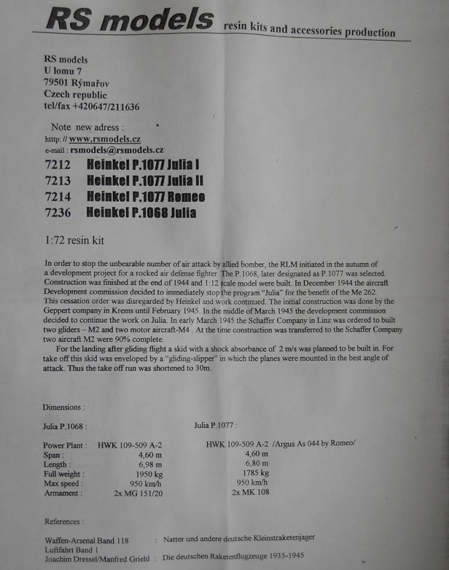 Модель из смолы от фирмы RS models в масштабе 1/72 (номер по каталогу 7212) упакована в картонную коробку с верхним открытием. Данная модель представляет из себя модификацию He P.1077 Julia I. Литьё не самого лучшего качества – присутствуют различные дефекты. Фюзеляж выполнен цельной деталью. Проработка интерьера отсутствует. Ваку-фонарь даётся только на переднюю часть кабины, боковые элементы остекления предполагается изготовить самостоятельно. Декали отсутствуют. Инструкция содержит только историческую информацию и схемы основных модификаций проекта.