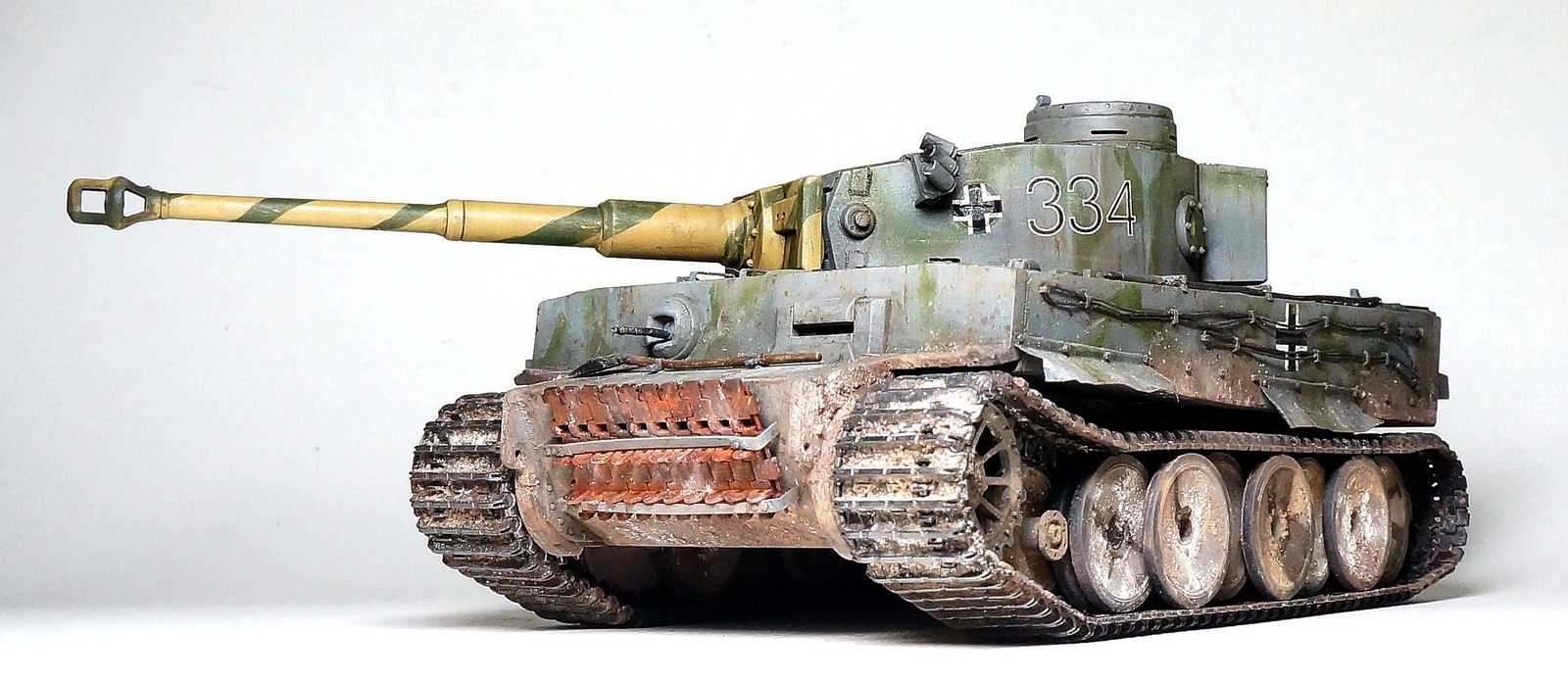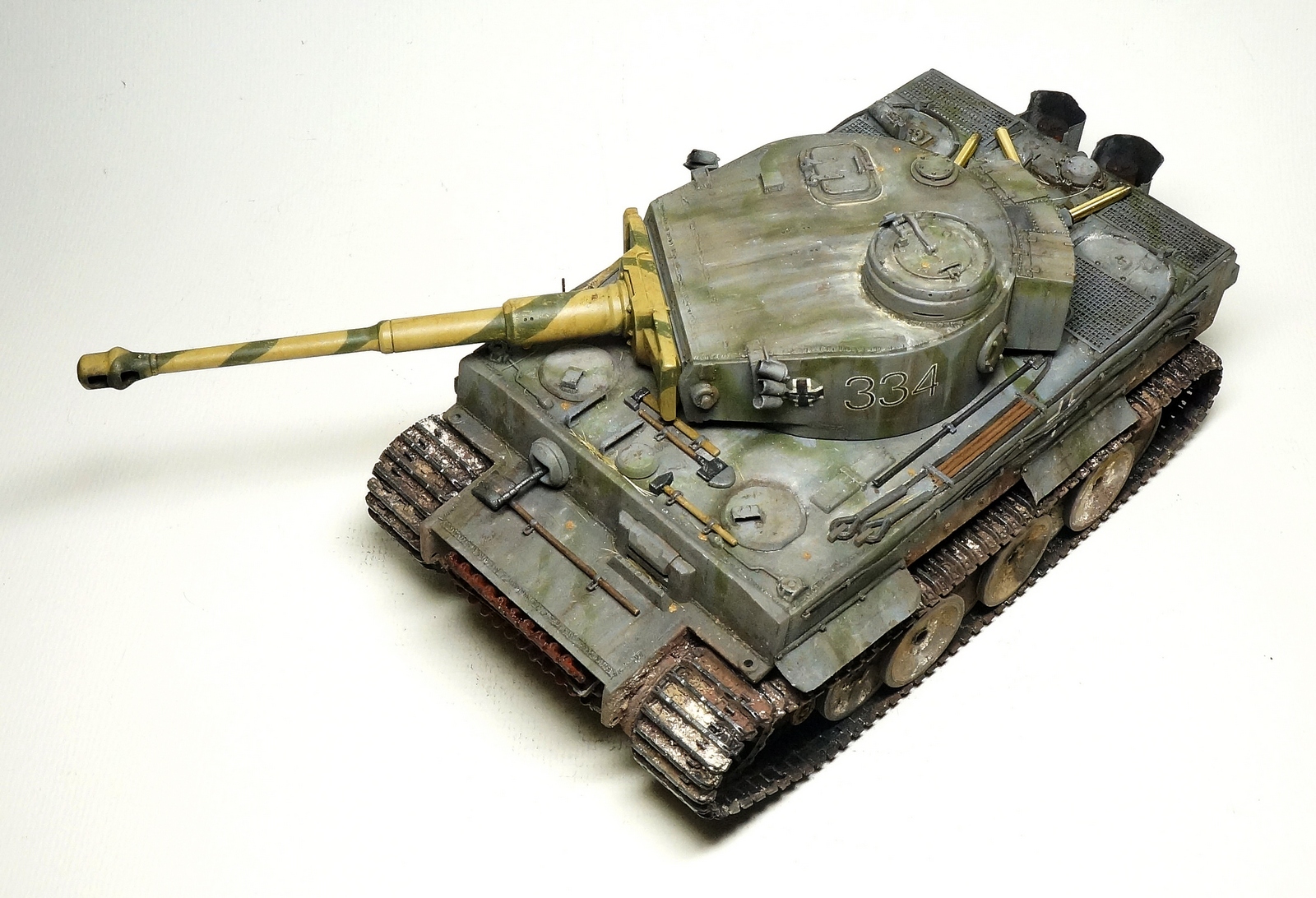 по идее прототип перекрашивался из серого в дюнкель и была замена орудия с маской, которые также позже перекрасили в базу дюнкель с оливковыми полосами, были перенесены крючья для колючей проволоки по правому борту, должны остаться места сварки от старых, хотя и эти у вас не там находятся, кресты на башне вы немного не там поставили, а на забашенном ящике они пляшут, на корме должны быть бонки от креплений фильтров фейфеля, любопытно остались лежать хомуты от бруска под домкрат, хотя самих креплений нет, но если на этом не заостряться, вполне смотрибельная модель, покрашено с душой, только вот дункель приглушить немножко надо было, а то слишком яркий контраст