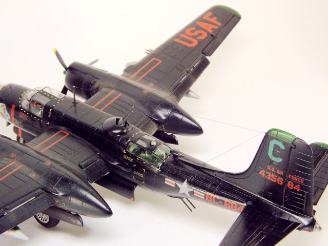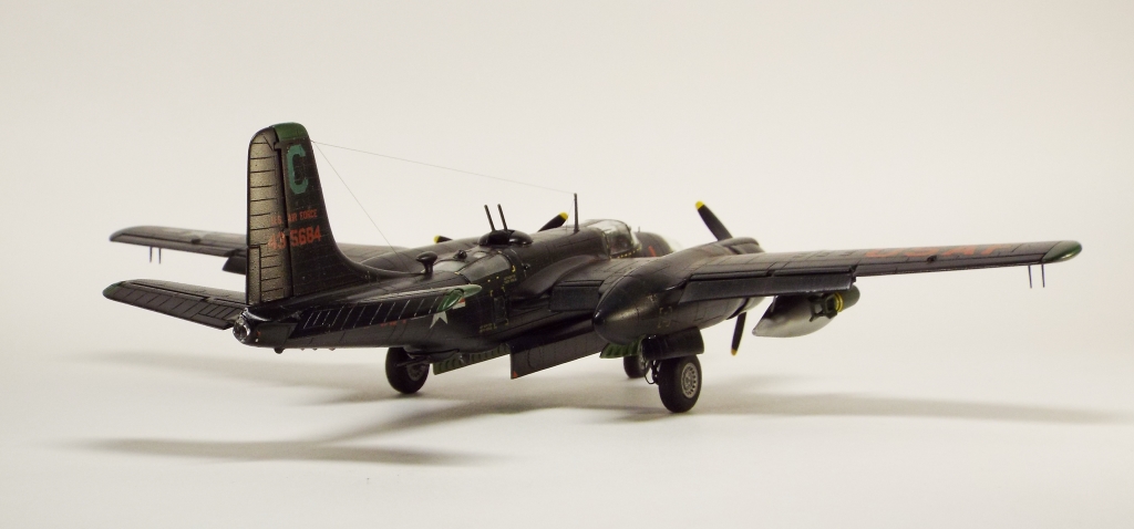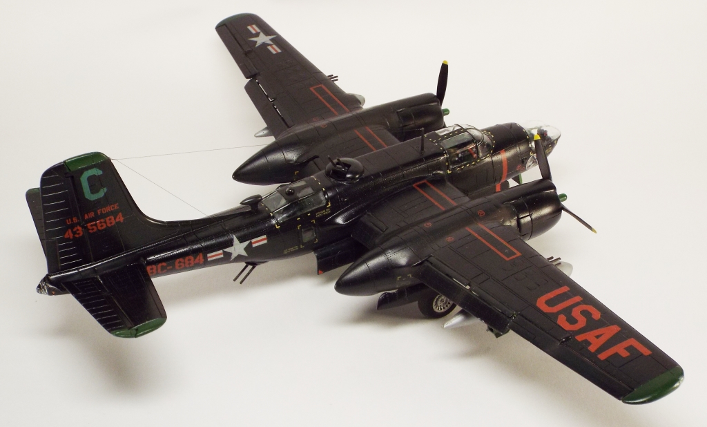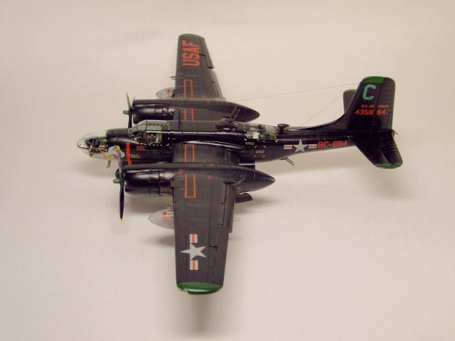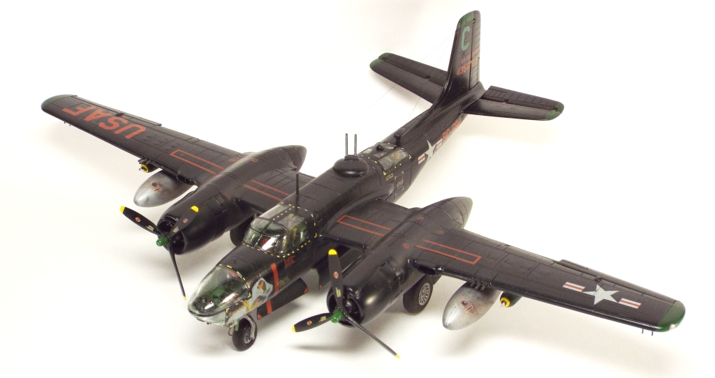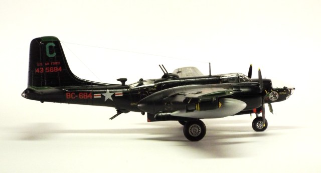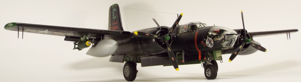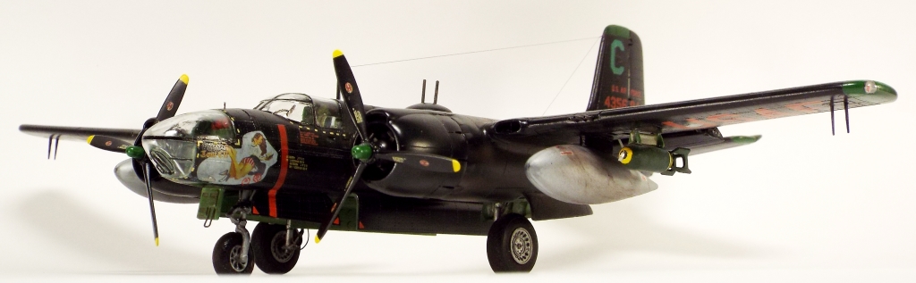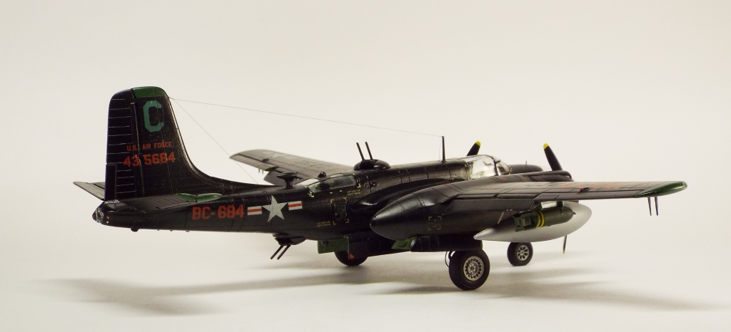 Выбран был прототип модификации «С». Малоизвестный борт A-26C-55-DL 44-35684 «Toni CII», 34-й эскадрильи 17 бомбардировочного авиакрыла .Театр действия - Корея. Декаль (подробная) к нему сделана Алексеем Бацких. Ему спасибо, много раз выручал! В общем, что получилось, то получилось. К нему в скором будущем присоединится младший брат модификации «К» от «итала». Скажу вам по секрету, с ним придётся тоже повозиться, ибо на первый взгляд модель смотрится хорошо, но… В общем, при детальном сравнении надо бы поработать чтобы модель ожила. Приятного просмотра, жду хулу и похвалу.