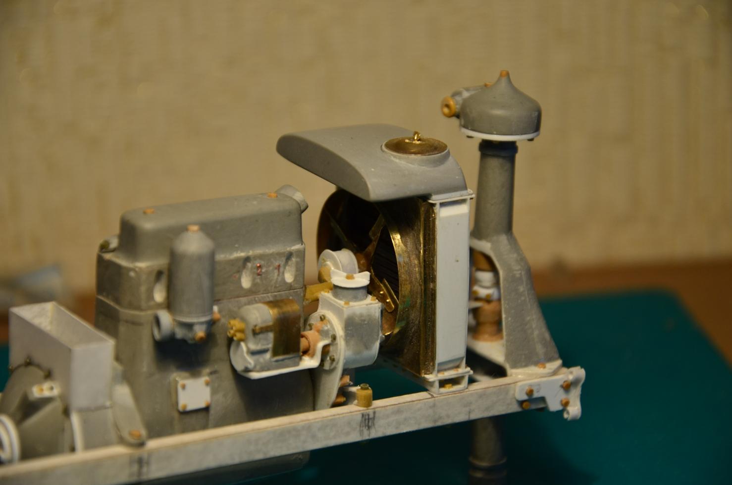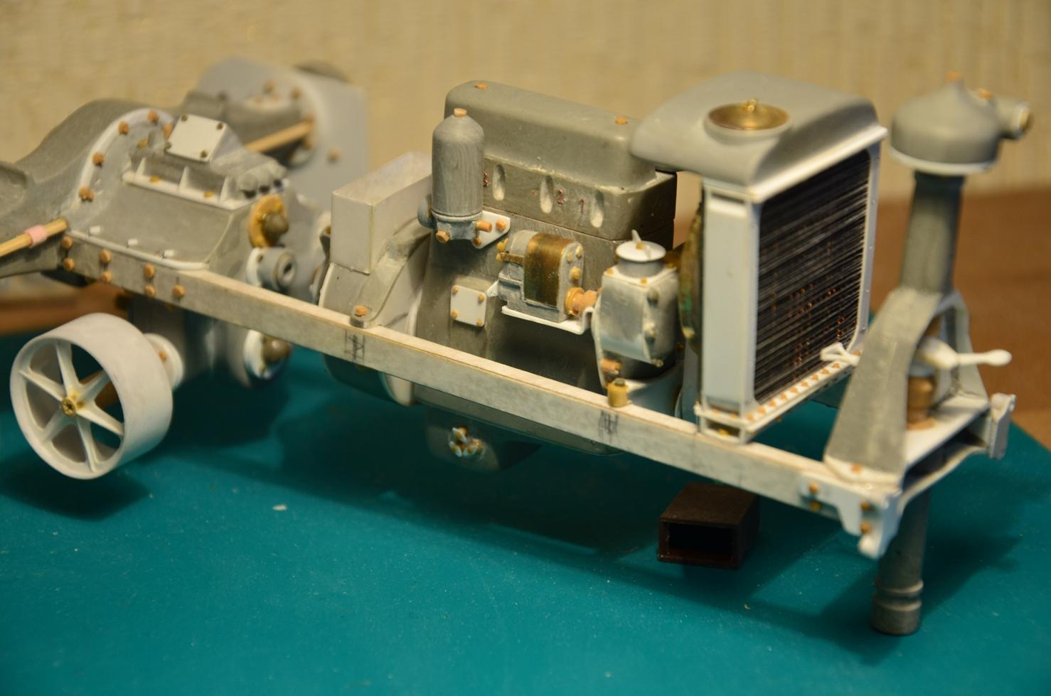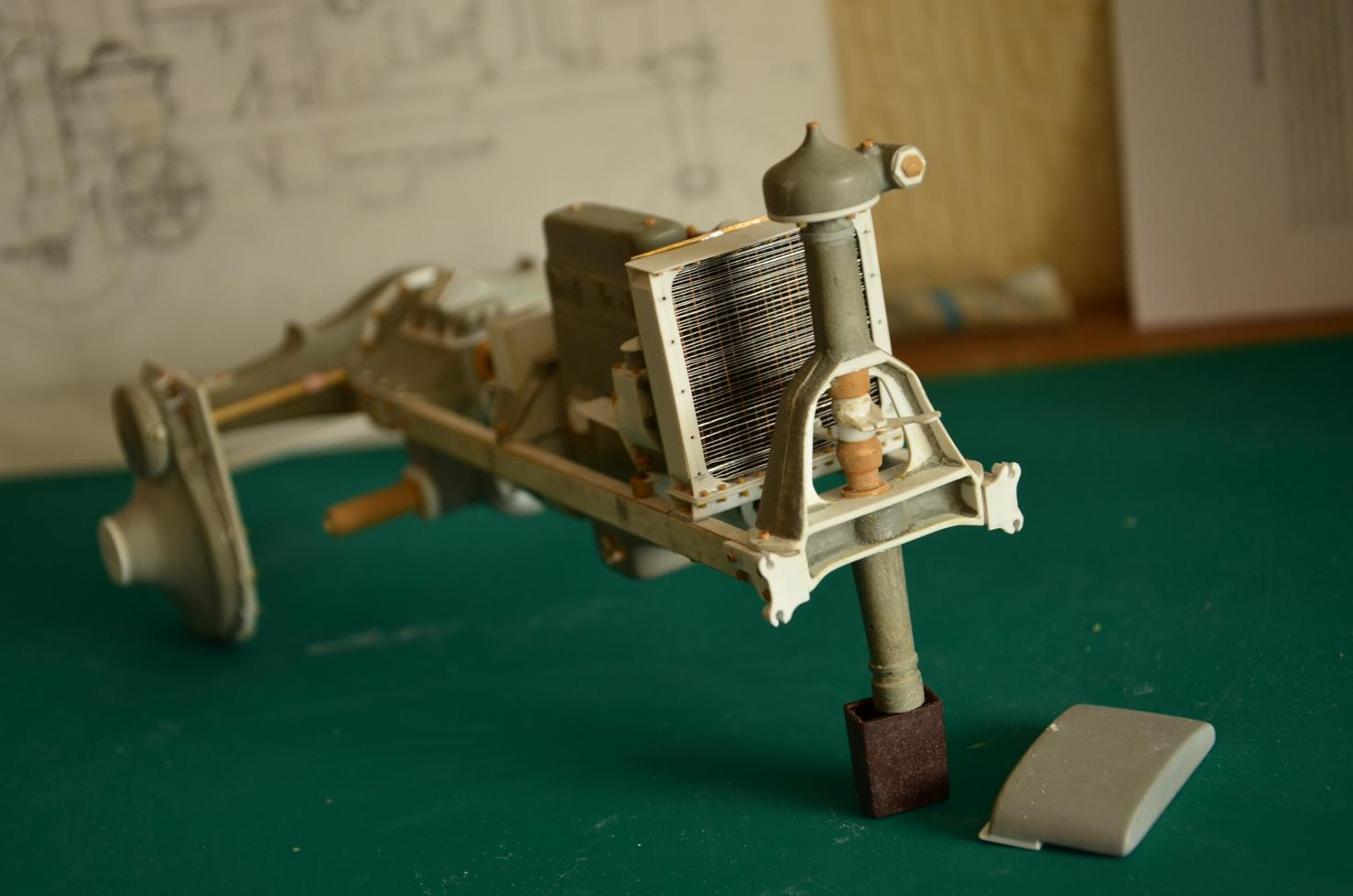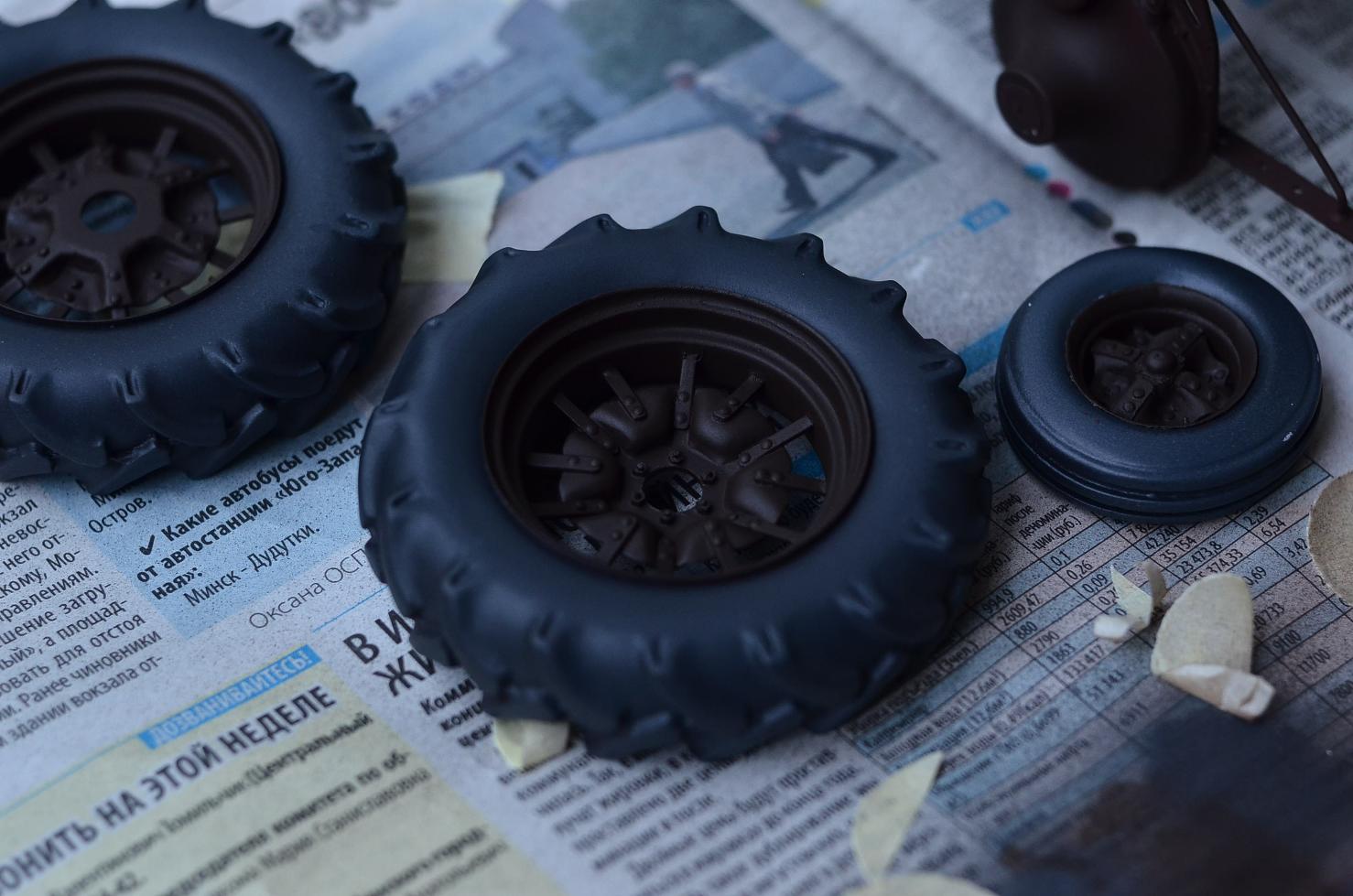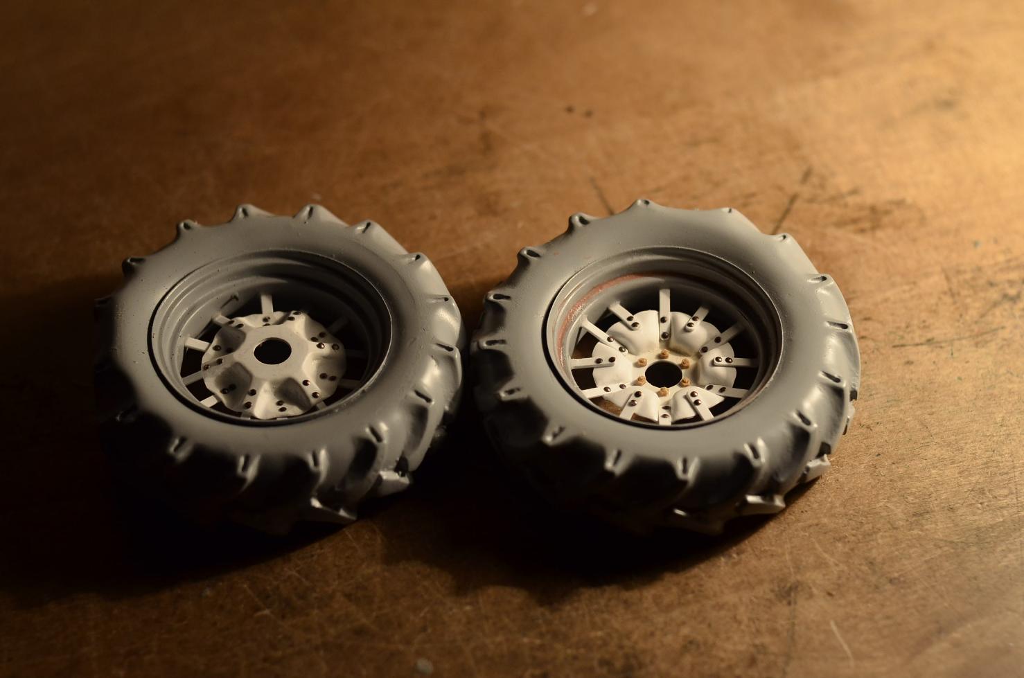 полепить из эпоксилина, подавляющее количество деталей вылеплено из него.Также применялись другие материалы,колёса задние деревянные с бумажным протектором заполненным эпоксилином,передние колёса-картон,диски у обоих видов штамповал и доводил из полистирола.Обода колёс делал из бумаги,закраины ободов из закраин одноразовых пластиковых стаканов .рама и бак из дерева оклеенные бумагой.Радиатор- фольга и проволока.Так же применялась и жесть,для капота,диффузора,