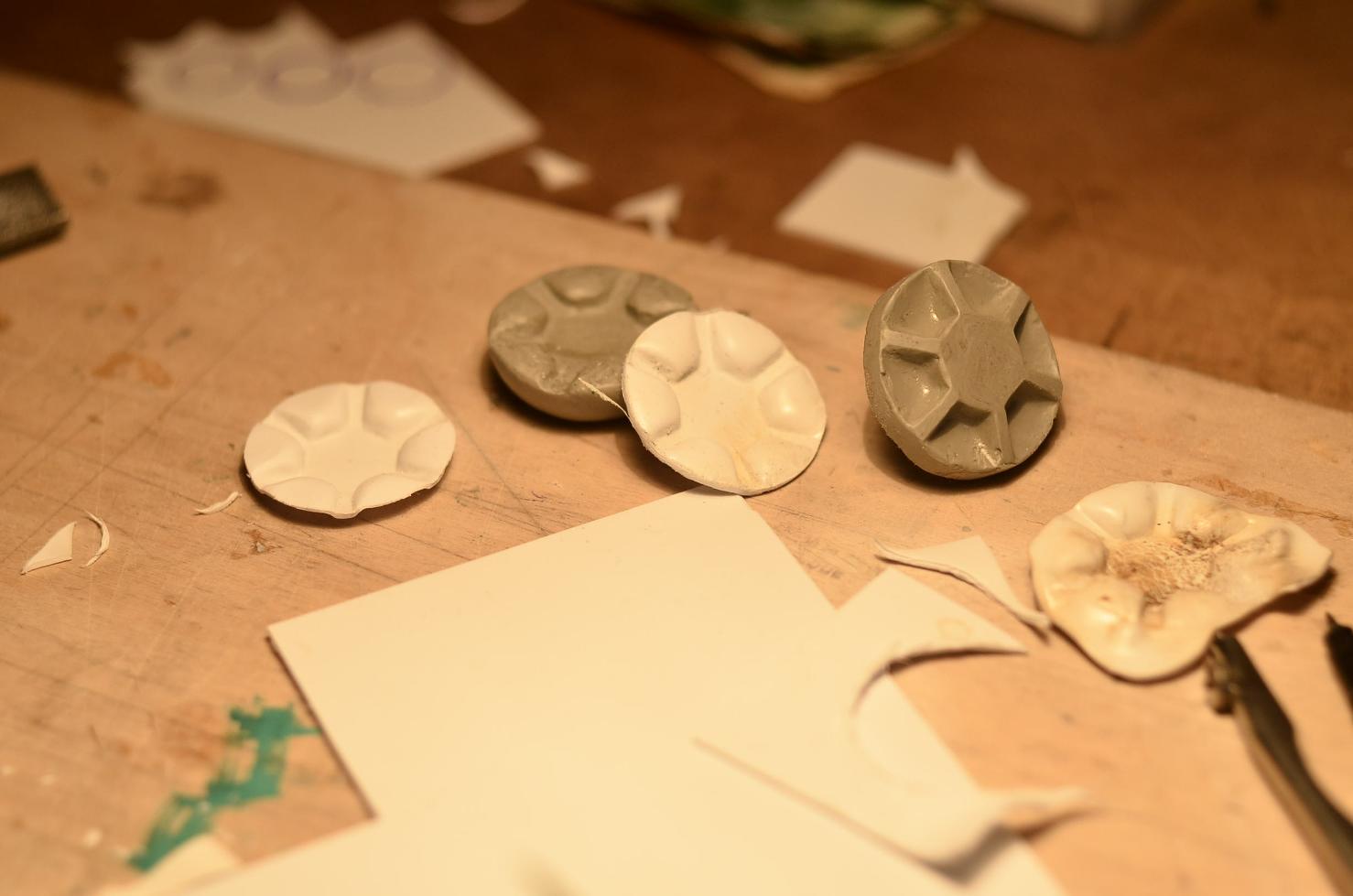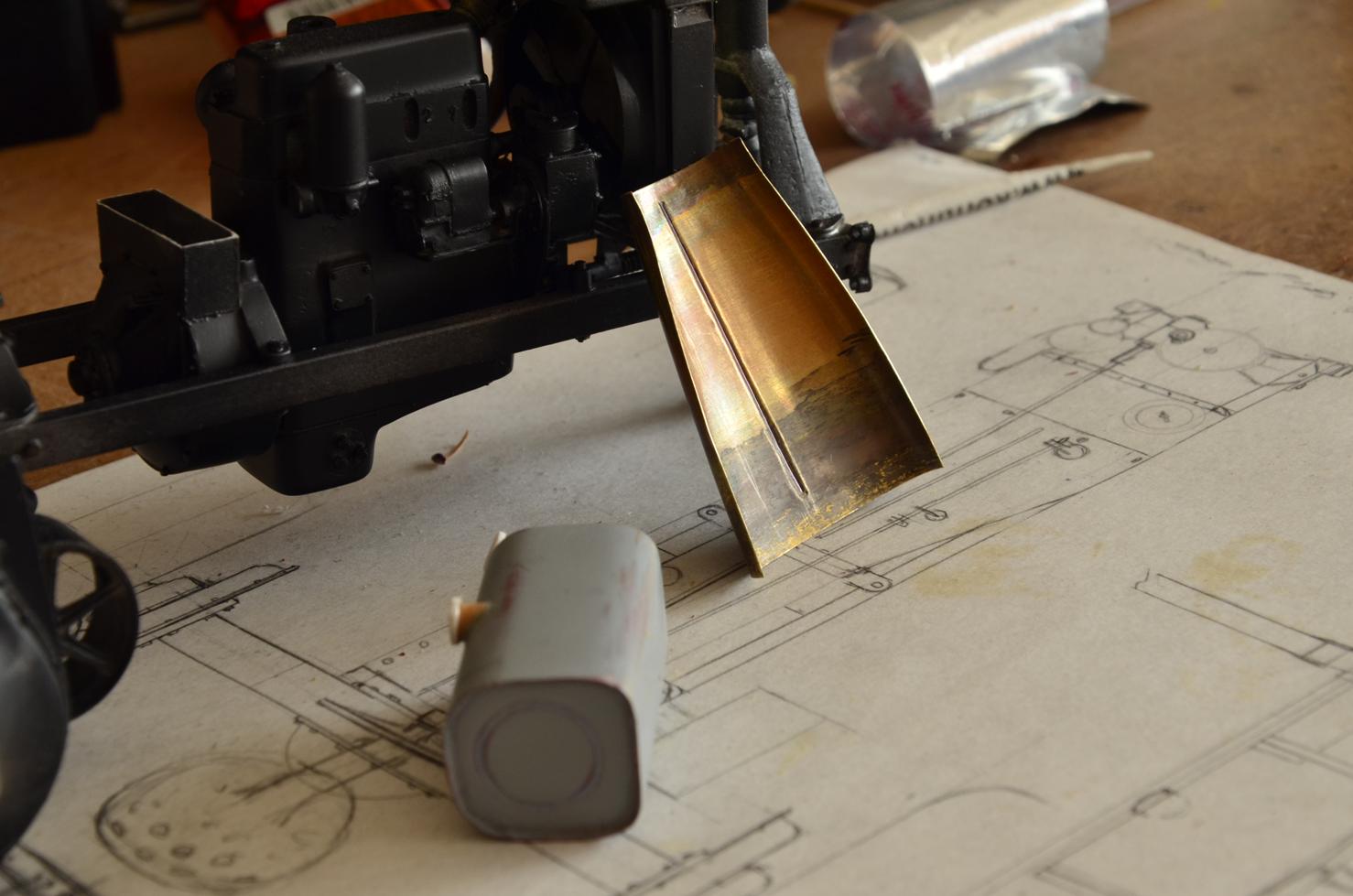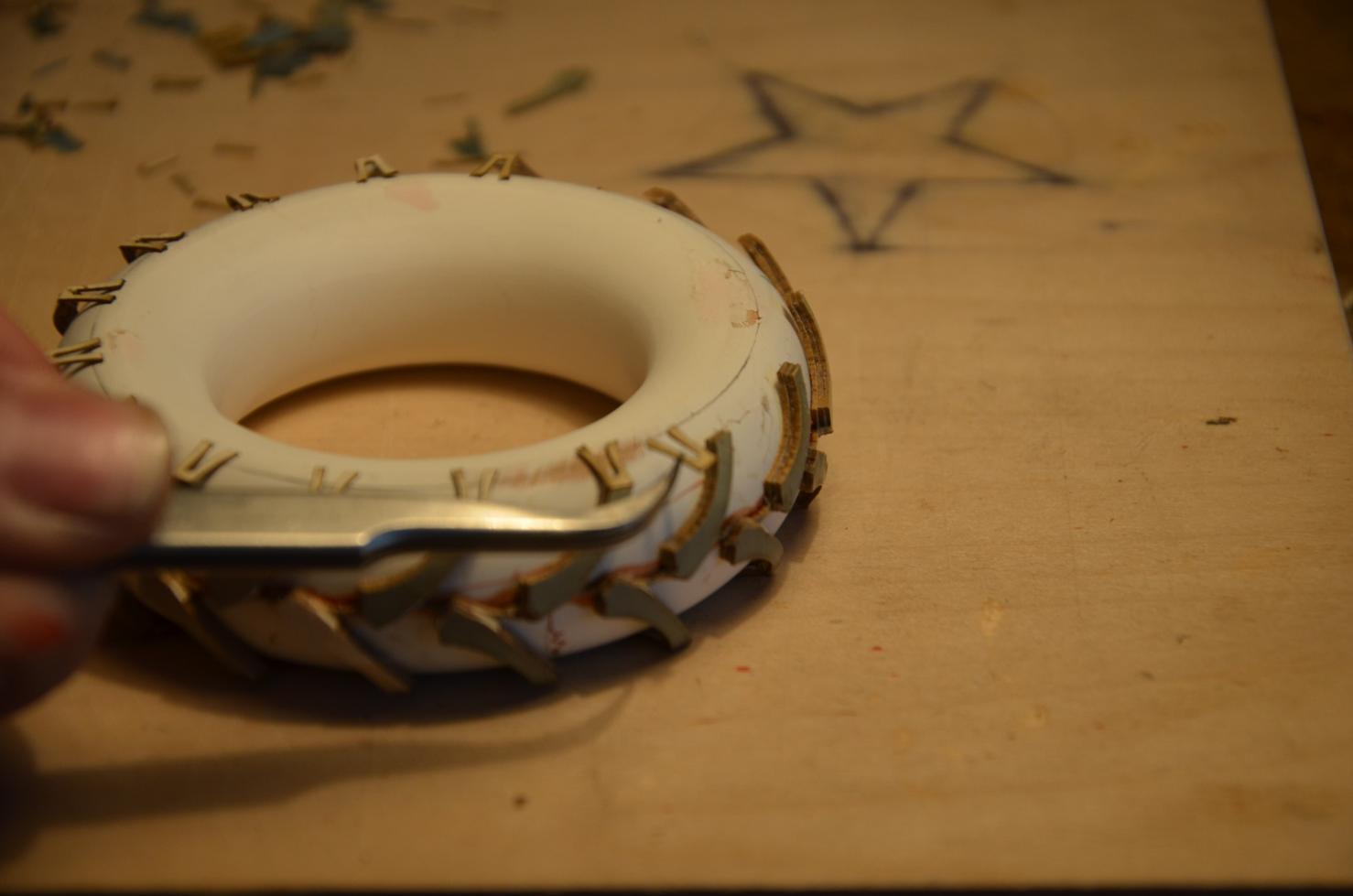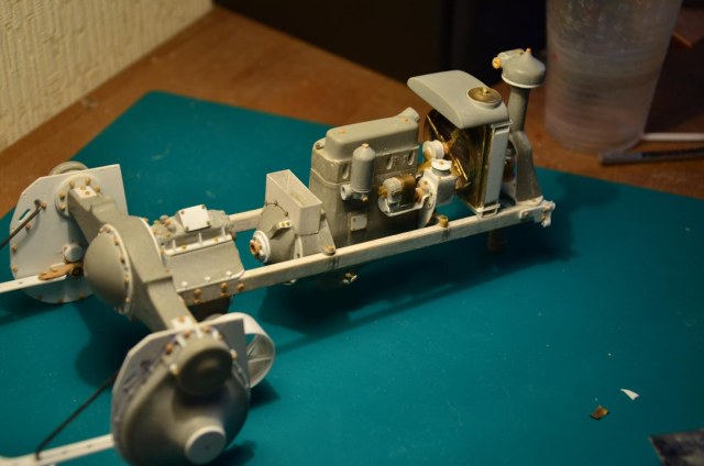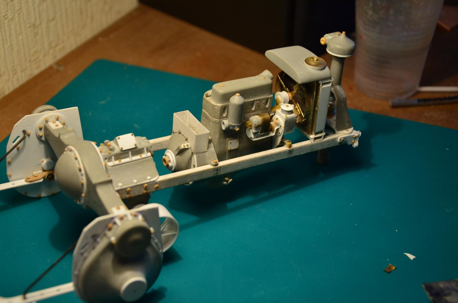 полепить из эпоксилина, подавляющее количество деталей вылеплено из него.Также применялись другие материалы,колёса задние деревянные с бумажным протектором заполненным эпоксилином,передние колёса-картон,диски у обоих видов штамповал и доводил из полистирола.Обода колёс делал из бумаги,закраины ободов из закраин одноразовых пластиковых стаканов .рама и бак из дерева оклеенные бумагой.Радиатор- фольга и проволока.Так же применялась и жесть,для капота,диффузора,