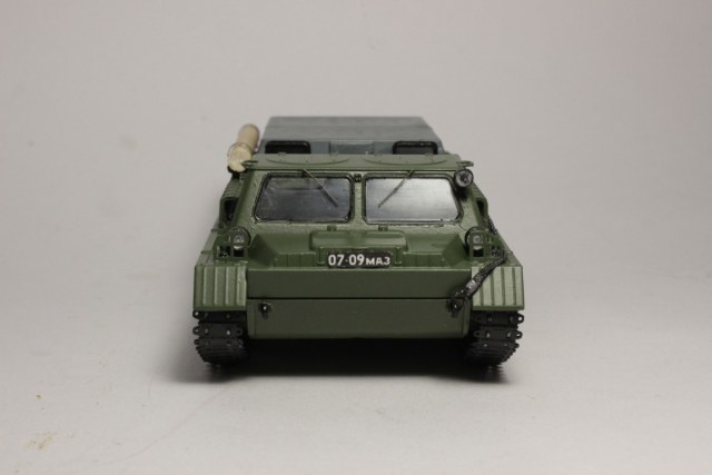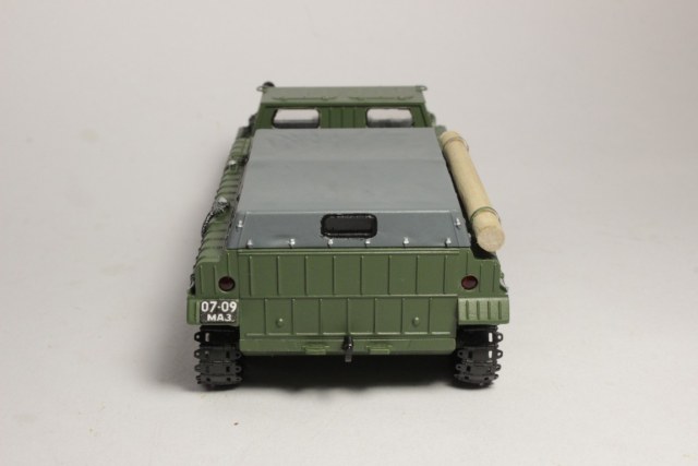 Подобран подходящий по моему мнению цвет для модели. Собственно, покрашены детали, собран, добавлено бревно (на многих фотографиях эта машина таскала его с собой) и трос. Машина магаданская, чаще всего этот снегоболотоход показан с номерами того региона.