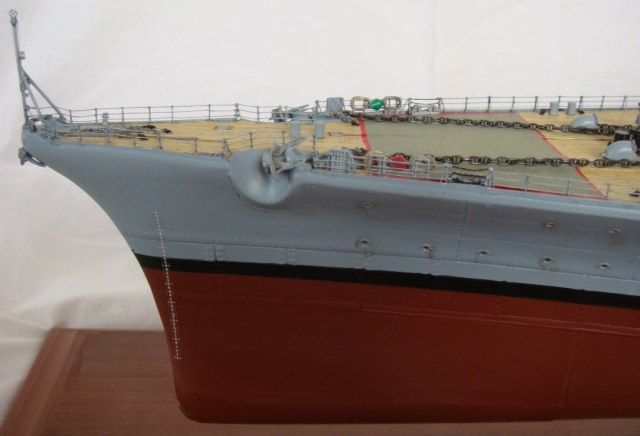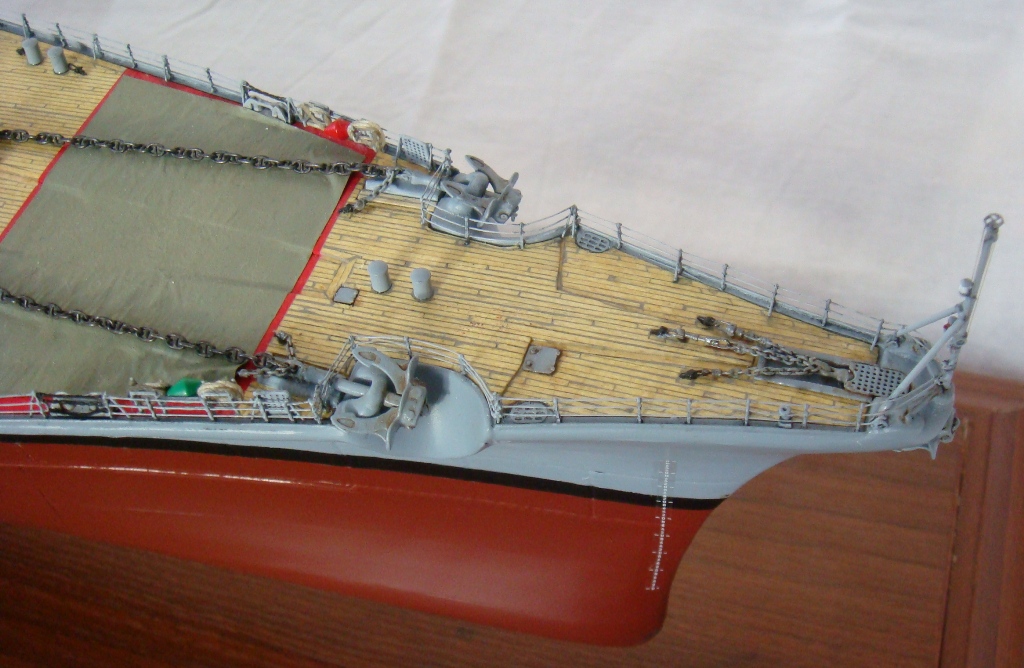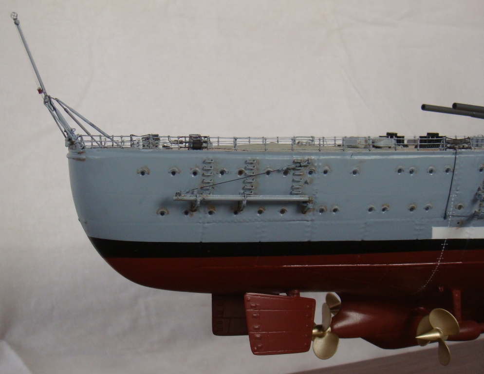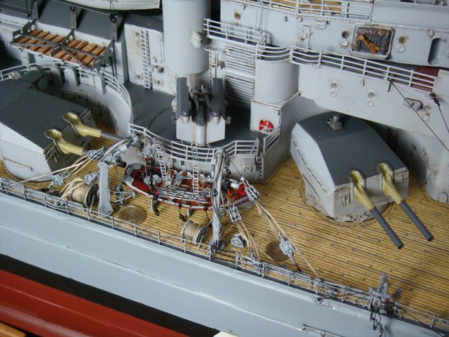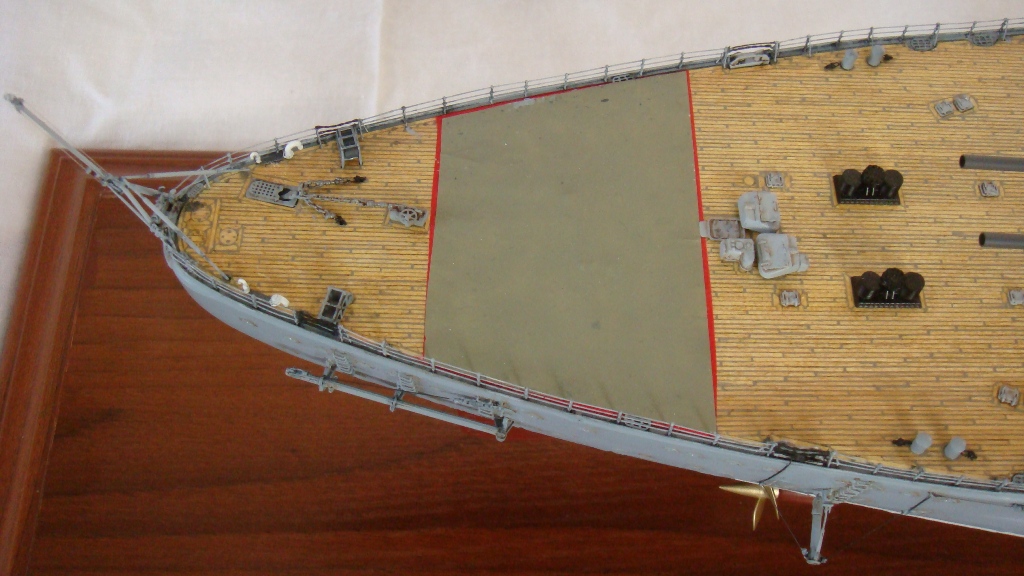 так же травление на заказ. Якорную цепь купил из черненого серебра (подошла в размер). Полностью переделал дымовую трубу, палубное покрытие набирал из отдельных планок. Корпус полностью обшил пластиком с имитацией клепки, сварных швов. Так же воспроизвел технические отверстия и решетки на корпусе ниже ватер-линии.