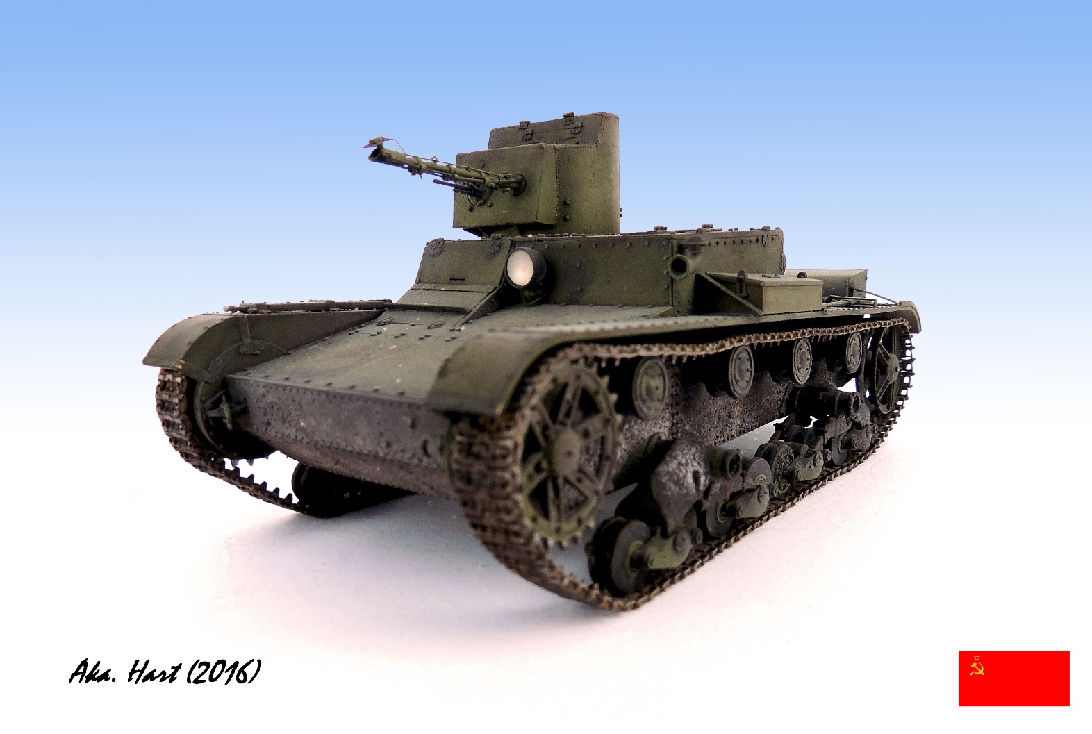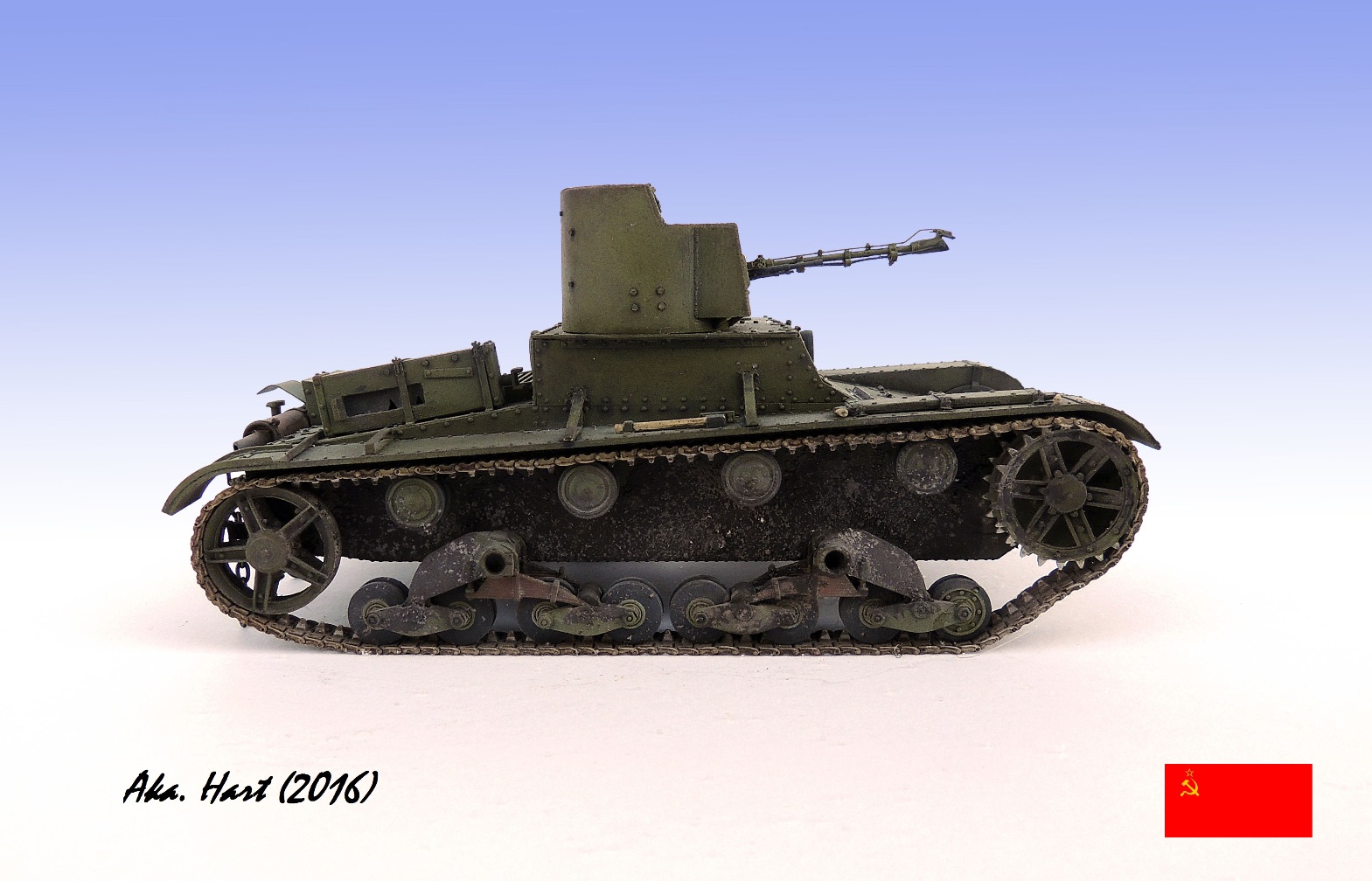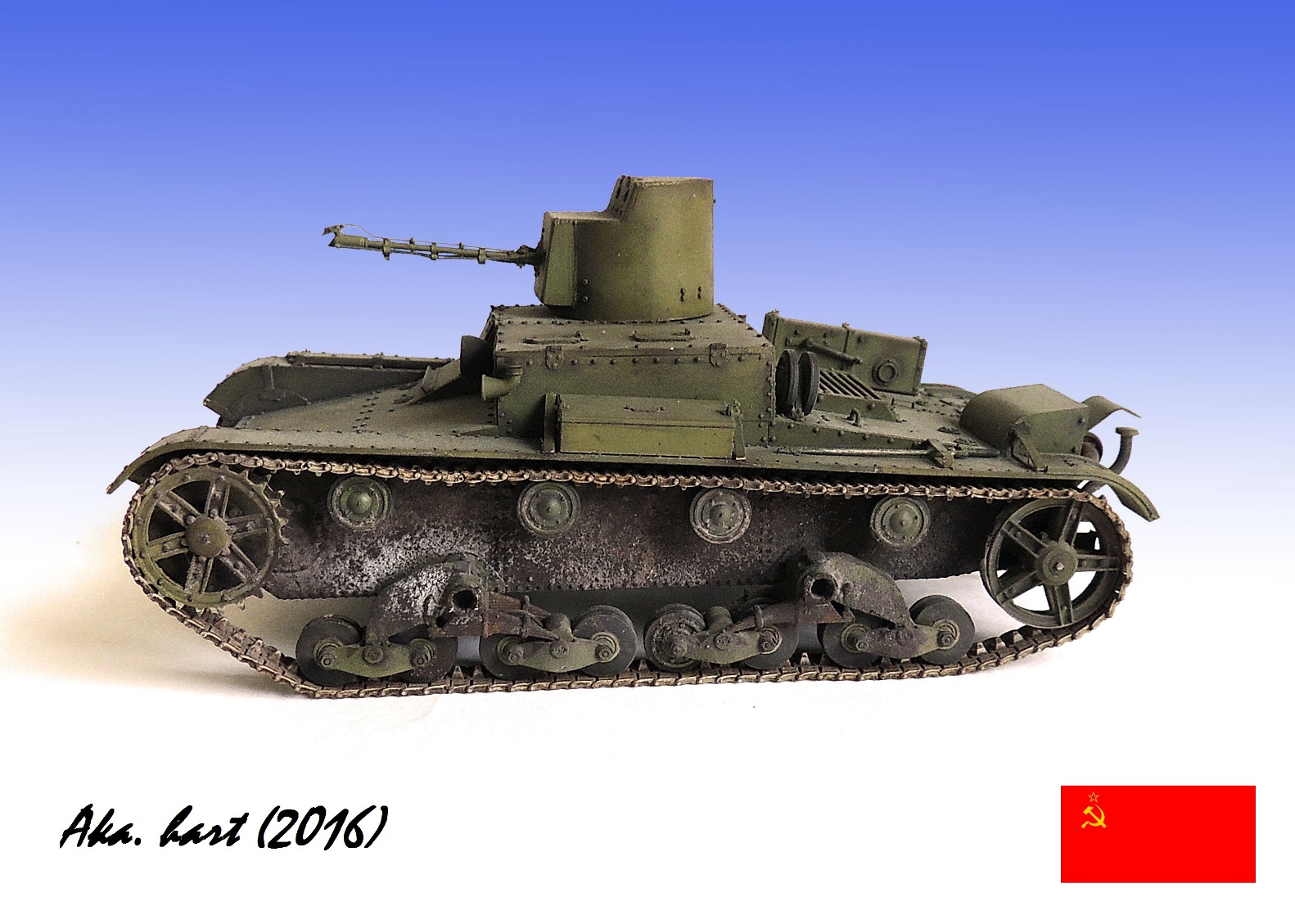 Давно хотел себе в коллекцию данную машину. С другой стороны, "Звезда" давно прекратила выпуск этой модели, а с учетом большого, всем известного косяка с геометрией, постройка тянула только на самодел. В тоже время, решив пойти по стопам Александра Егорова, (всем известного спеца, по танкам Т-26), воспользовавшись его советами, а также не без помощи товарища из ближнего зарубежья, Андрея Алисевича (за что ему отдельное спасибо, ибо без него вряд ли этот проект состоялся) получил то, чем в итоге, хочу поделиться на этом сайте. Собственно: основа - Хобби босс, танк обр. 1931 года. Была изменена левая часть верхнего листа с использованием пластика от "Эвегрин", пластишрака и продукции мастер клаб. Так же были использованы остатки из разных наборов травления от ЕТ и Вояджера для Т-26. Ленивцы заменены на ранние, без ребер усиления, ведущие звездочки тоже, ибо металлические траки, на ХБ одеваться не хотели. Фара - Эльф. (К сожалению запасы тают, а приобрести не где). Цепь- отрезал кусок от цепи неизвестного производителя, давно купил на Арморе 35. Стройка тут: http://panzer35.ru/forum/44-17075-1