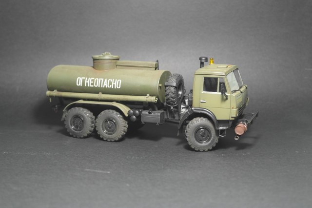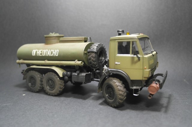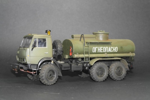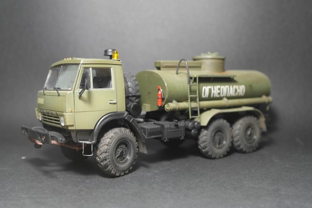 Хорошо всем известный камаз от icm.Сборка данного набора доставила удовольствие,чего не скажу о бочке.Для изготовления цистерны был приобретён набор фирмы customfactory,качество которого меня совсем не обрадовало.Декаль,горловина и глушитель,это всё что я пустил в дело.