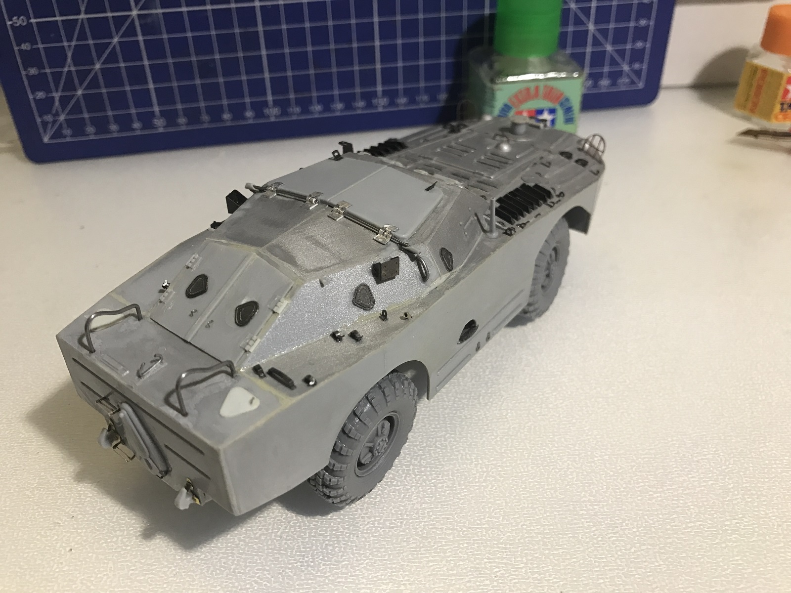 Не люблю описывать доработки, поэтому опишу коротко - в ходе строительства были применены остатки травления Эдуард от другого БРДМ, самодельное травло и подручные материалы, колеса Hobby Planet. В принципе объем доработки виден на последних фото, сделанных перед покраской.