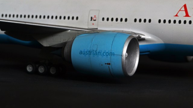 Теперь о модели. Встречается в сети редко, видимо в силу своих огромных размеров и небогатого выбора эксплуатантов для выбора ливреи. Да, химии реально ушло как на два полноценных А320. Набор хороший. Стыкуется не на 5+, а просто на 5. Членение двигателей - реально полный восторг. Это лучшие двигатели, что я собирал, удобство сборки/окраски на первом плане. При постройки руководствовался фотографиями австрийских 777-200, 777-300 других авиакомпаний и, в основном, статьей Дмитрия Колесника из журнала М-Хобби. Самолёт очень приятен в работе. Звезда сделала реально крутую модель.