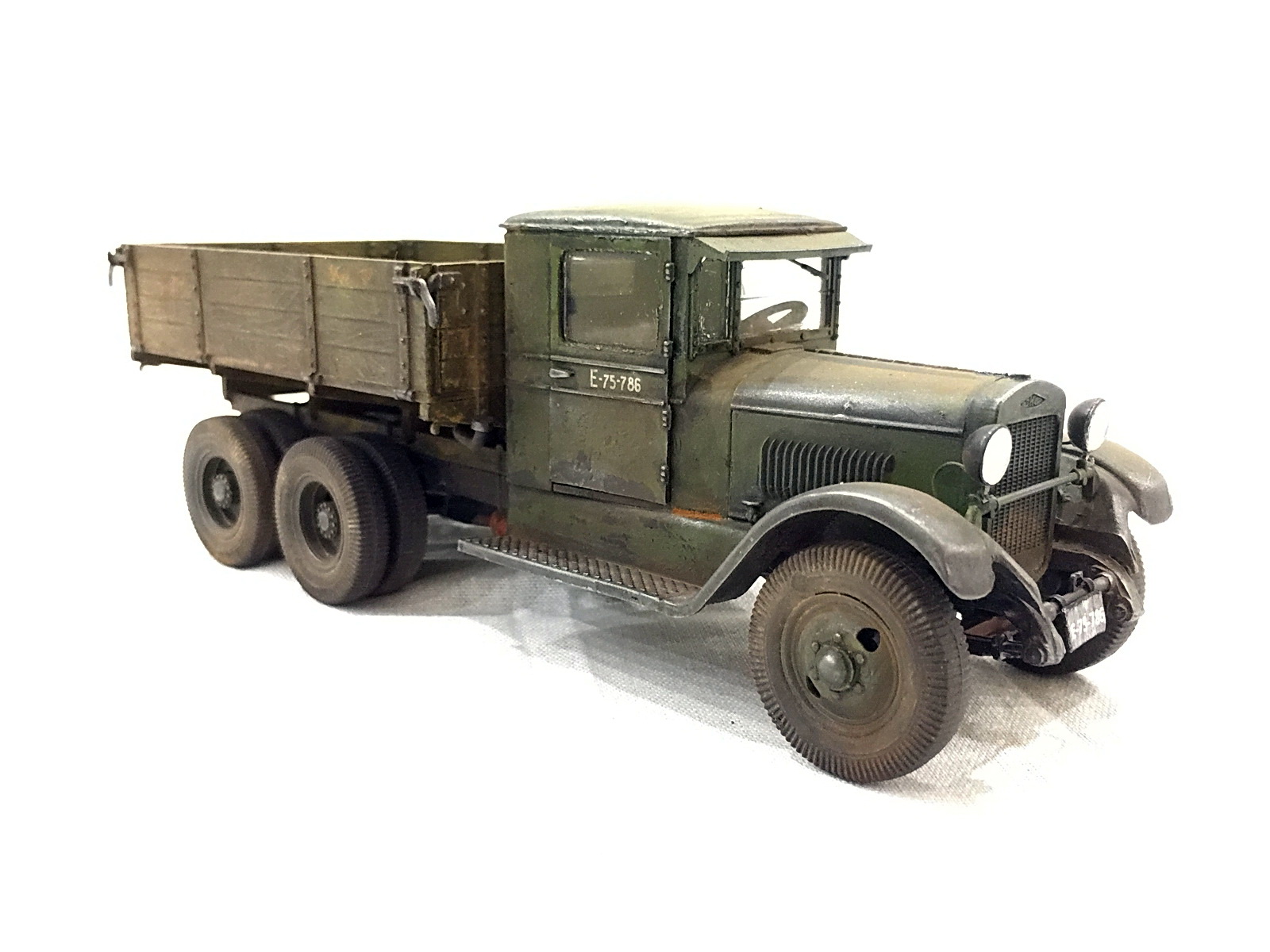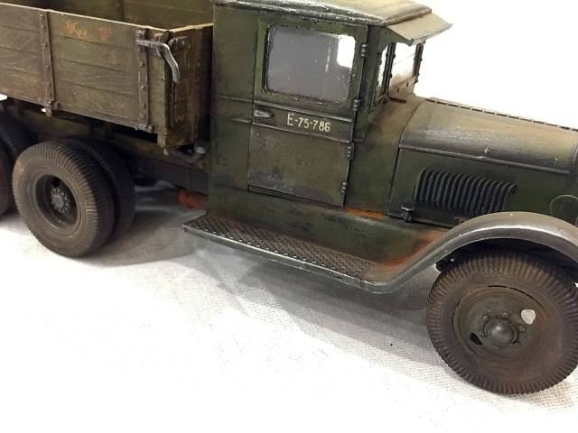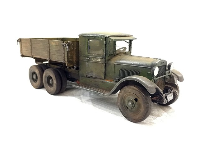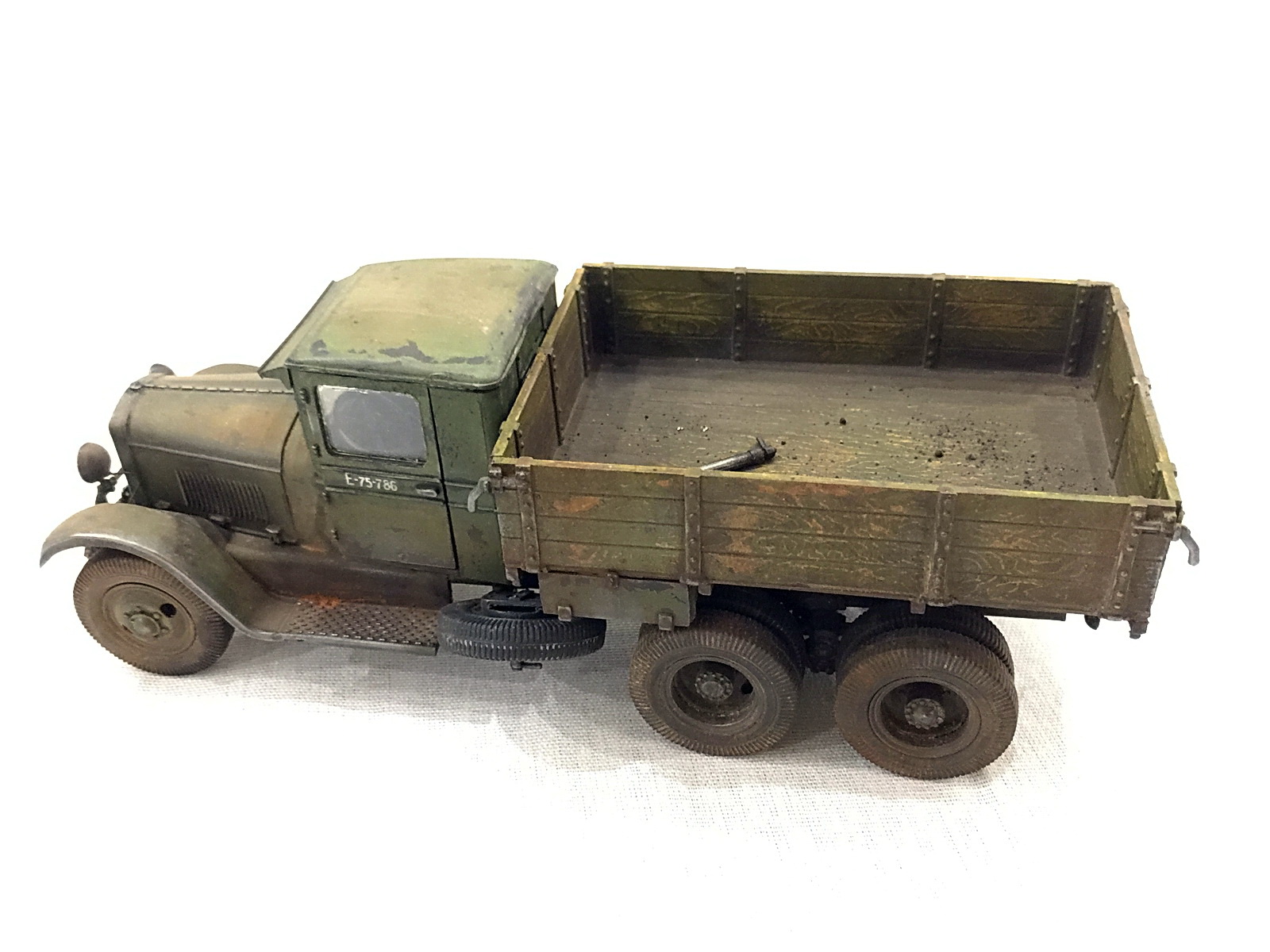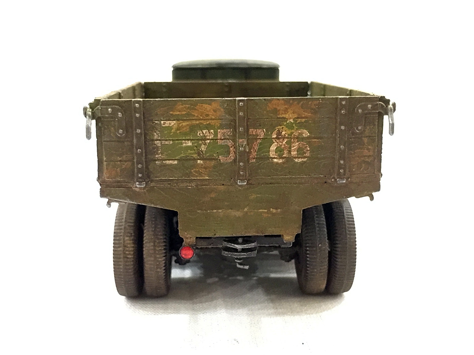 Окраска понравилась, кроме кузова: не поверил в сколы на дереве. И как же трёхосник без картридера(демультиплкатор-раздатка)? Да и на чём он так потрепался-запачкался, на святом воздухе? Бак отсутствует как явление...Боковины капота перепутаны местами,отверстия жабр должны быть направлены назад (что видно на вашем же фото реального образца), а не вперёд...