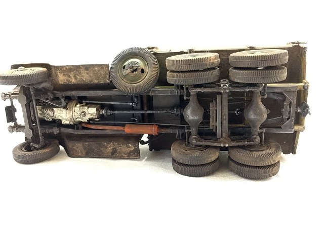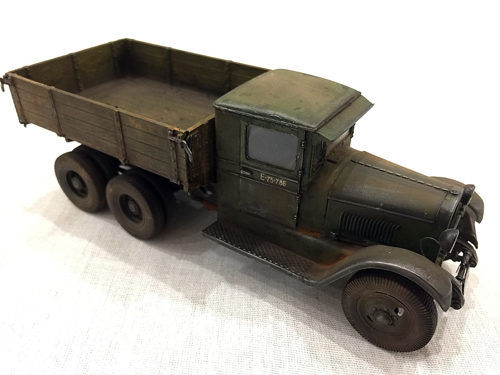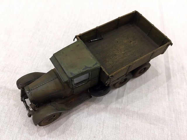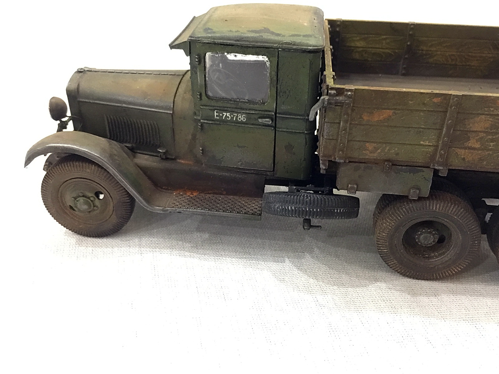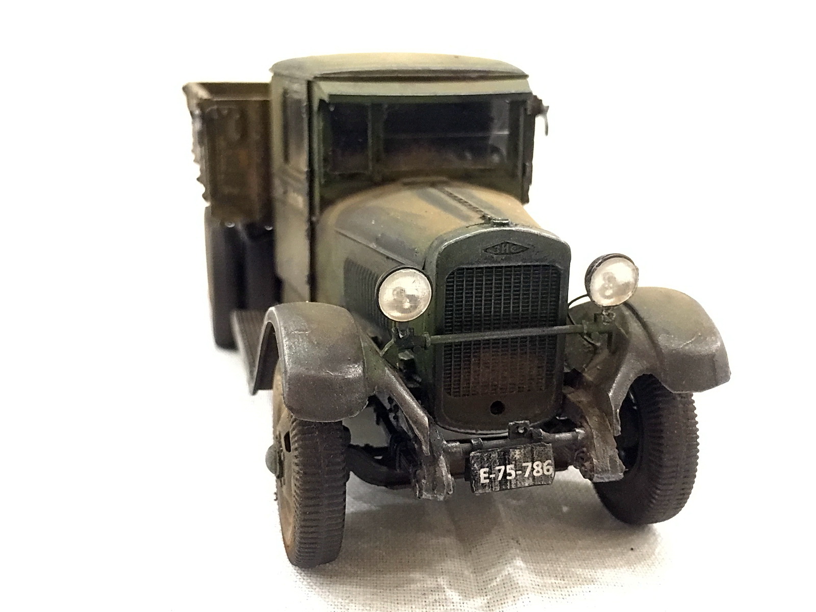 Окраска понравилась, кроме кузова: не поверил в сколы на дереве. И как же трёхосник без картридера(демультиплкатор-раздатка)? Да и на чём он так потрепался-запачкался, на святом воздухе? Бак отсутствует как явление...Боковины капота перепутаны местами,отверстия жабр должны быть направлены назад (что видно на вашем же фото реального образца), а не вперёд...