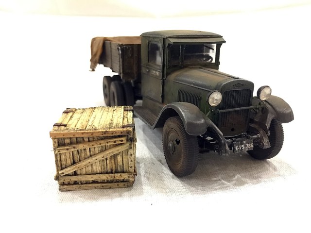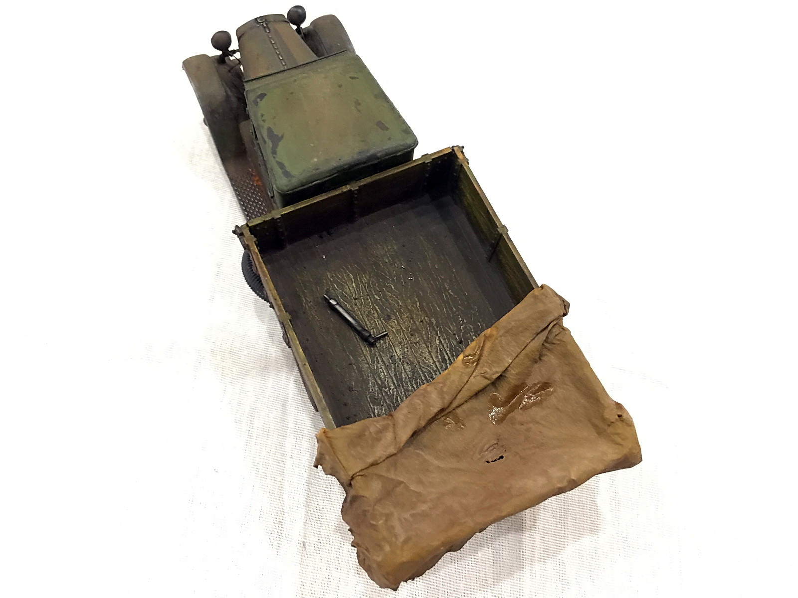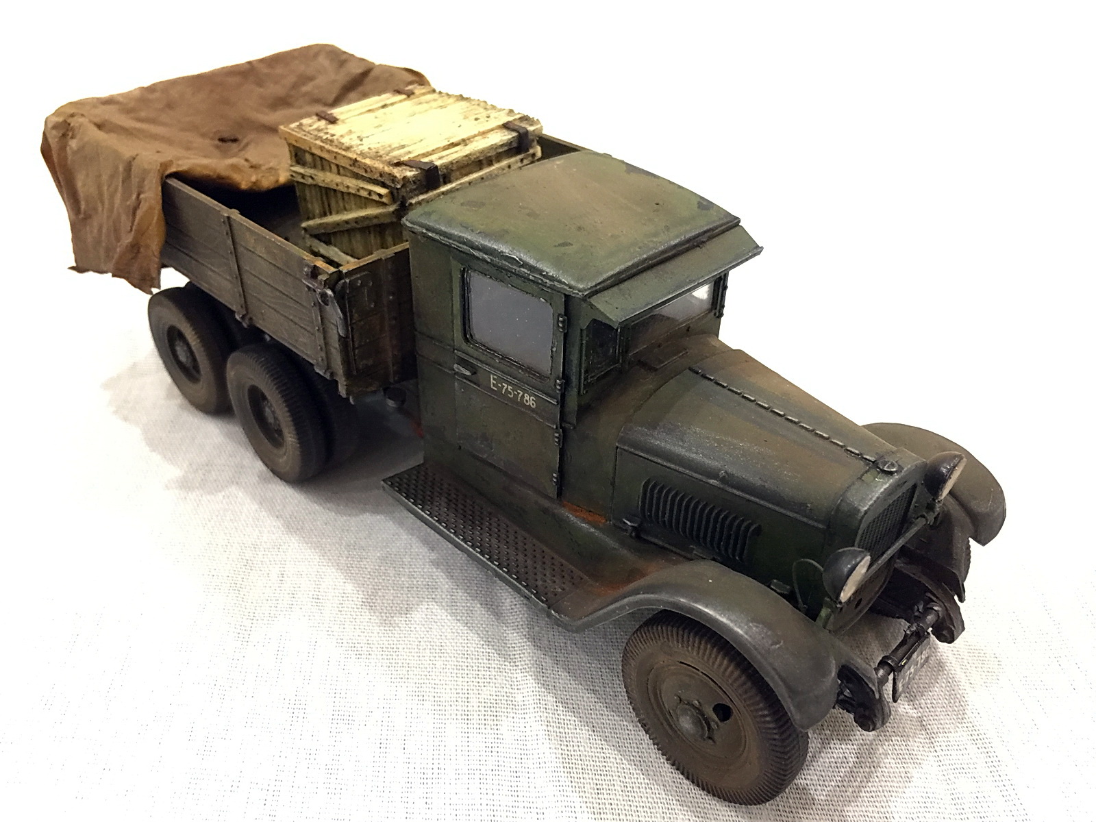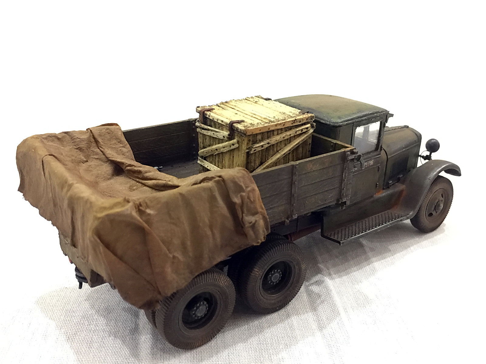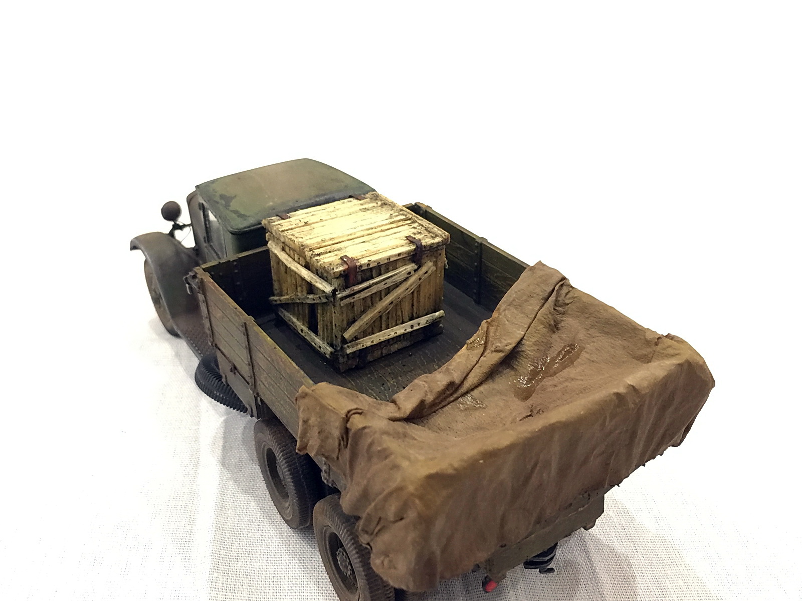 Красил красками от А-модел. Также использовал фильтра от АК-Interactive (для имитации дерева кузова). Смывки , потертости, пигмент – все как обычно. От себя добавил деревянный ящик и тент.