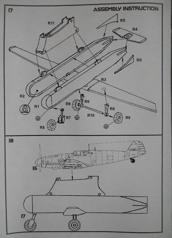 Да уж, монструозная вундервафля. Похоже тевтонский сумеречный гений окончательно забил болт на все понятия об аэродинамике. :-)По идее бы хоть какой то фанерный обтекатель на пиолон. Думаю управляемость у проекта была бы отвратительная. На планере вообще не наблюдается ни каких органов управления. То есть всей этой тяжеленной сцепкой предполагалось управлять лишь весьма миниатюрными рулями Мессера. Пилоты б бились не долетев до цели. Представляете какие там чудовищные завихрения и срывы потока на ТАКОЙ то подпорке. :-) В пилоне видимо предполагался дополнительный топливный бак. А ведь наверное можно собрать модель разьемной - что бы демонстрировать Мессер отдельно. Правда вот с шасси как быть... Либо делать убранным, либо сменно-вставляемым. Судя по приведенной схеме окраски, окраска бомбопланера чертовски условная. Производители модели на этот счет совершенно не заморачивались.