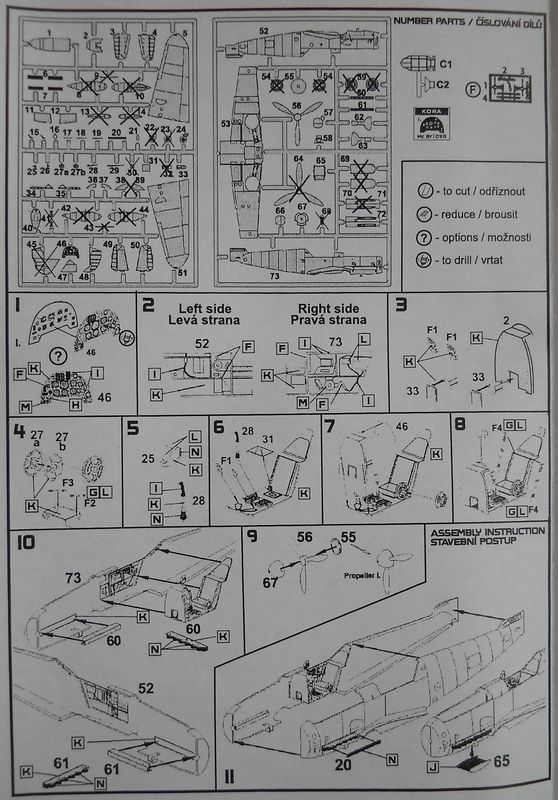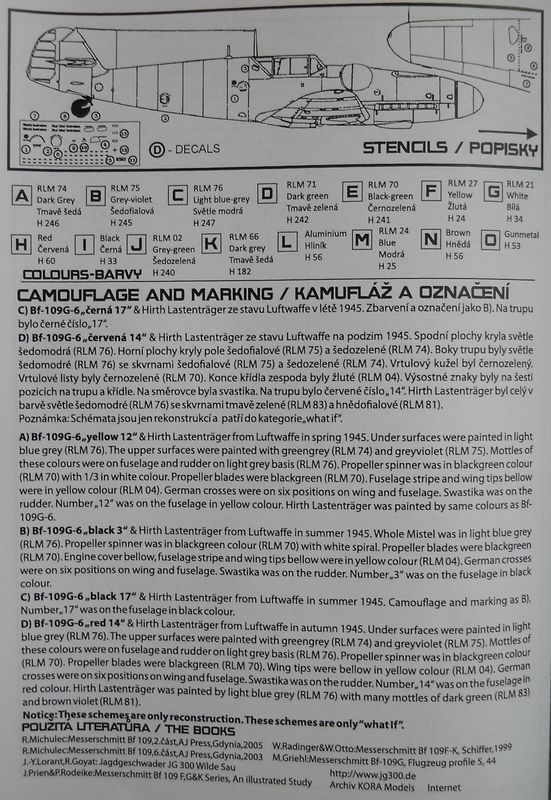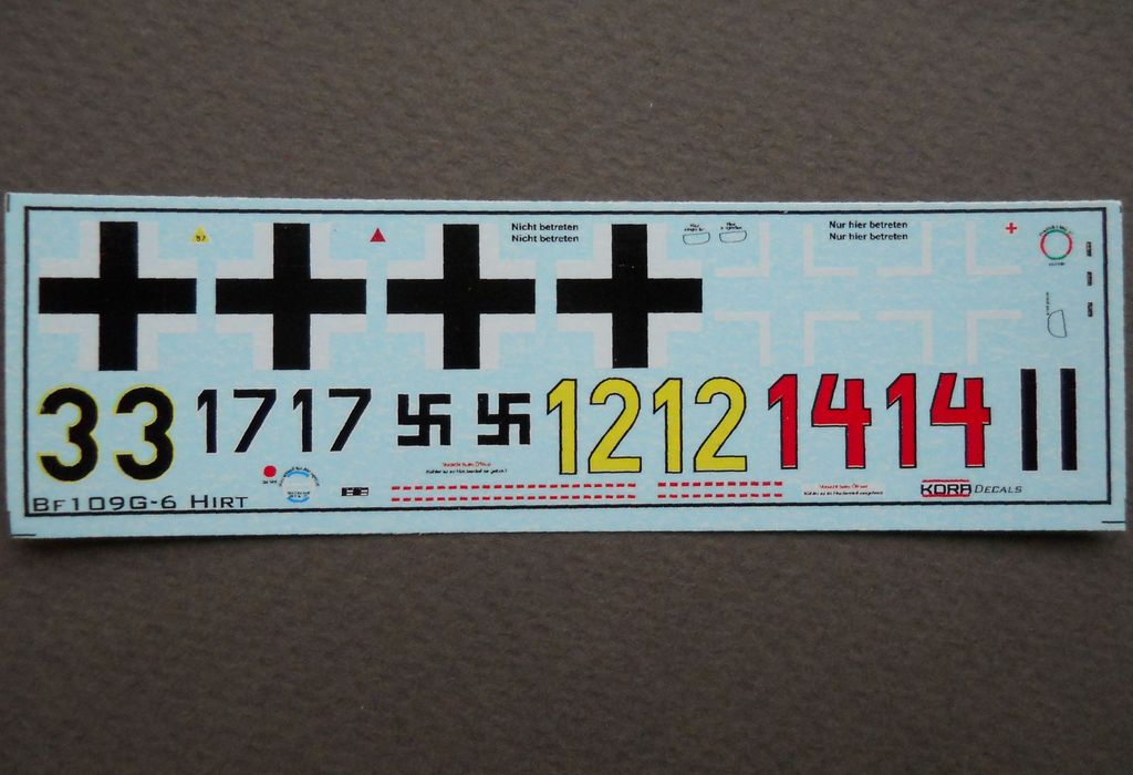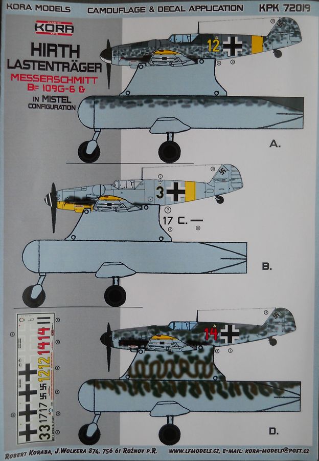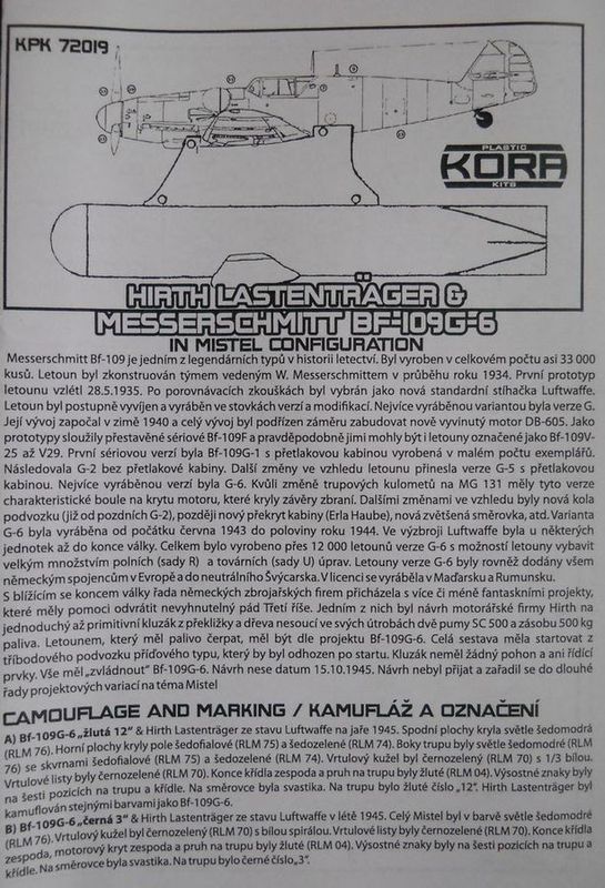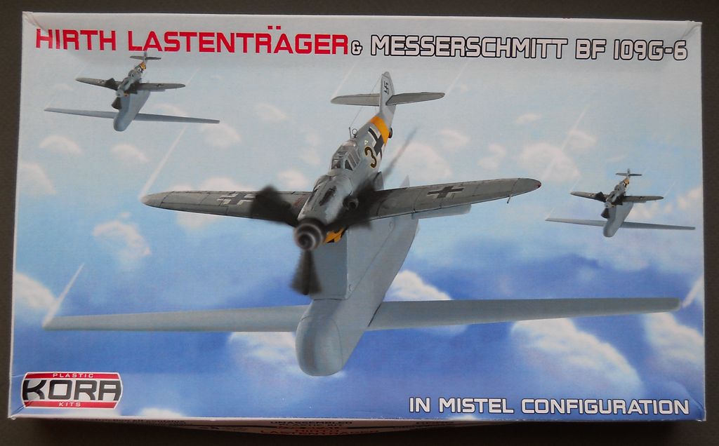 Набор от фирмы Kora упакован в тонкую картонную коробку с верхним открытием и содержит пластиковую модель MesserschmittBf 109G-6 от AZModel, дополненную смоляными деталями, фототравлением, приборной доской напечатанной на бумаге и декалями (номер по каталогу 72019). Базовый пластик от AZModelпредставляет из себя типичное современное ЛНД данной фирмы. HirthLastentrager отлит из смолы. Литьё весьма среднего качества. Декаль на четыре фантазийных варианта самолёта. Инструкция по сборке и окраске достаточно информативна и наглядна.