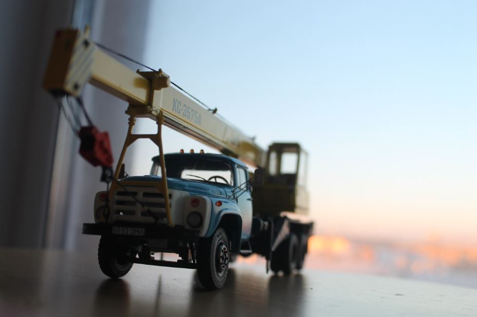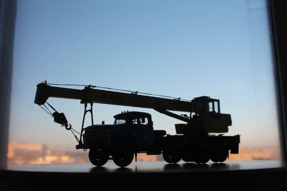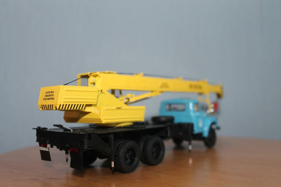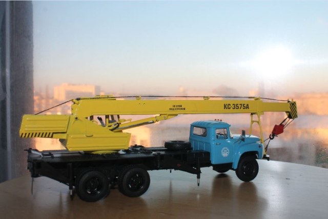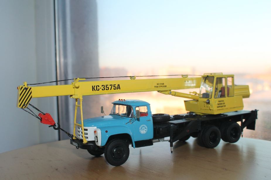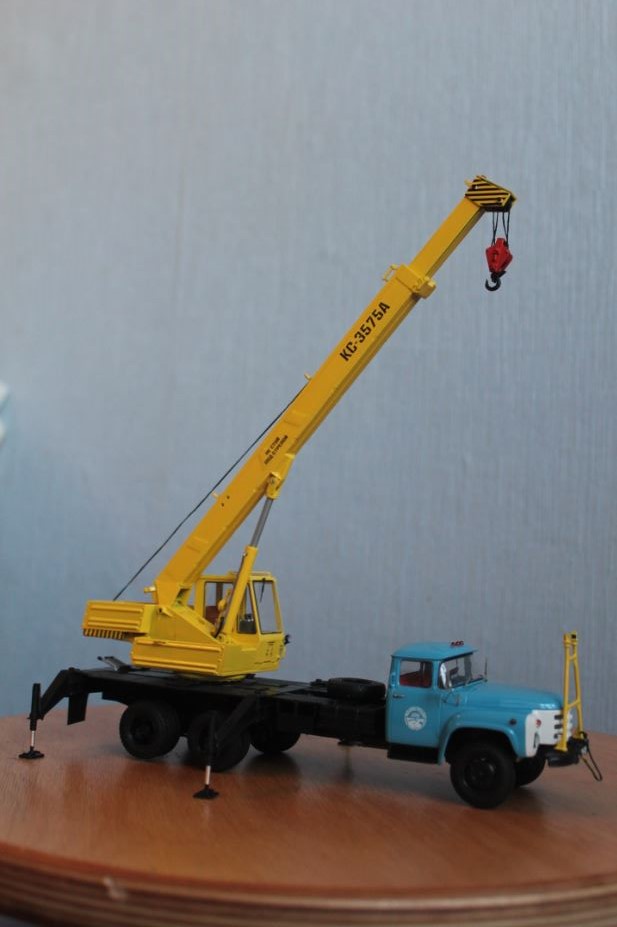 Кит "AVD", фототравление "Петроградъ", частично применил светотехнику от "ТриА", краска Адриатика-425 от "Мобихел". Крановая установка окрашена в желтый цвет от "КУДО". Из-за недоработок производителя пришлось сделать статичный полипласт. Переделана панель приборов на камазовскую, поставлена гитара.