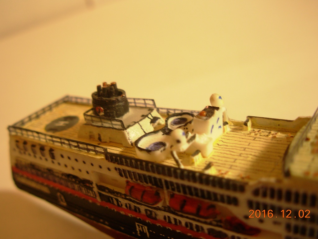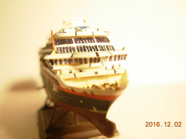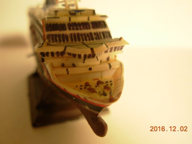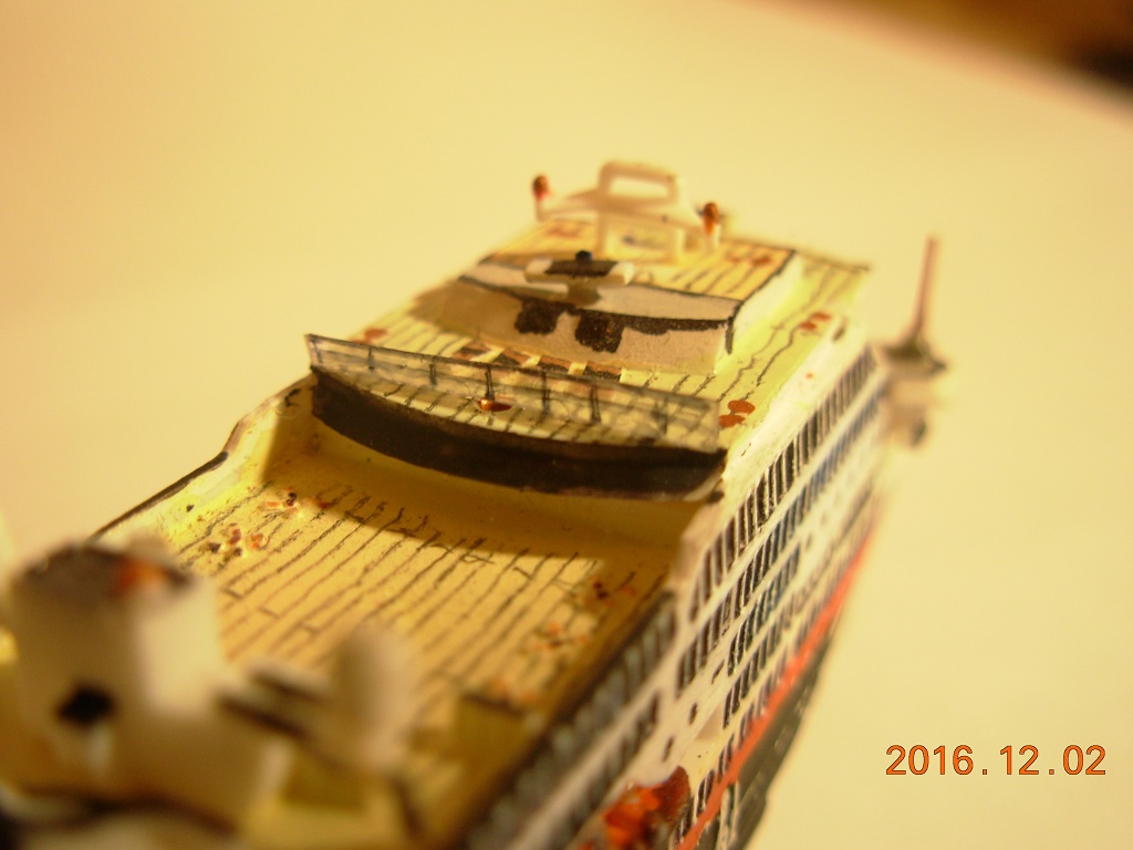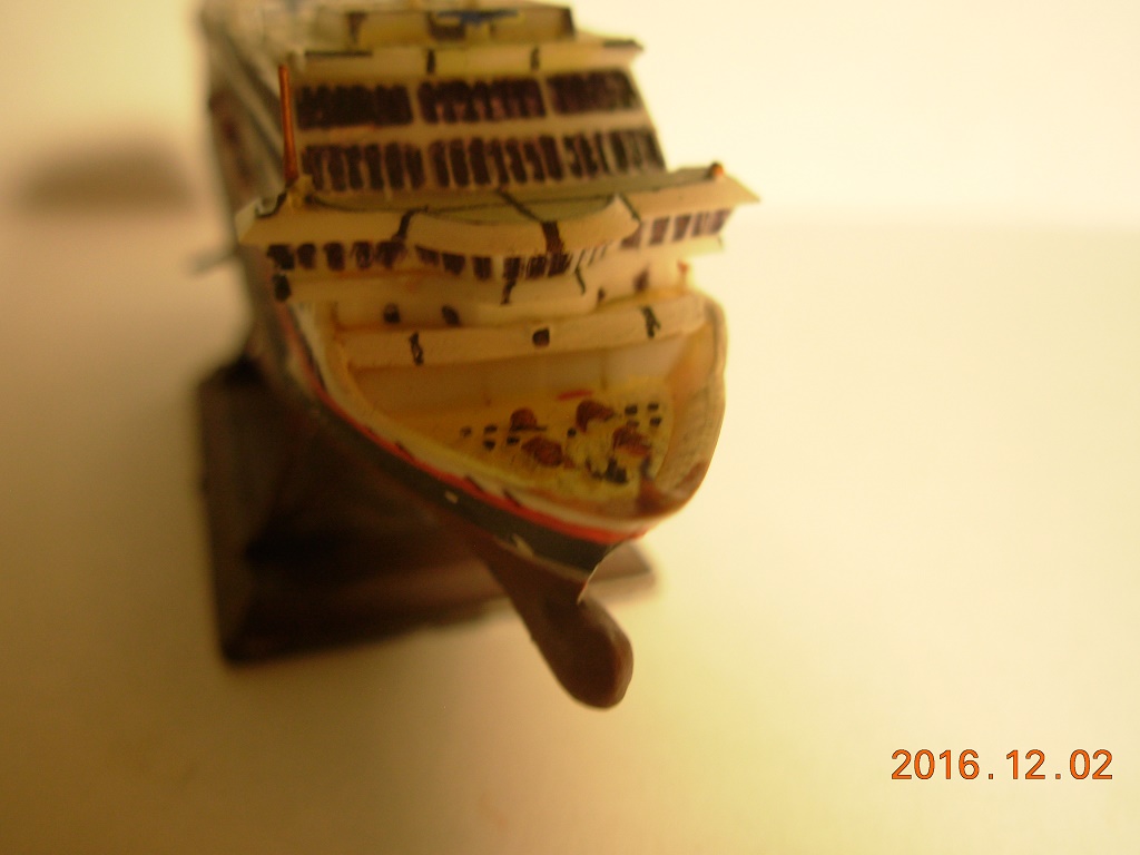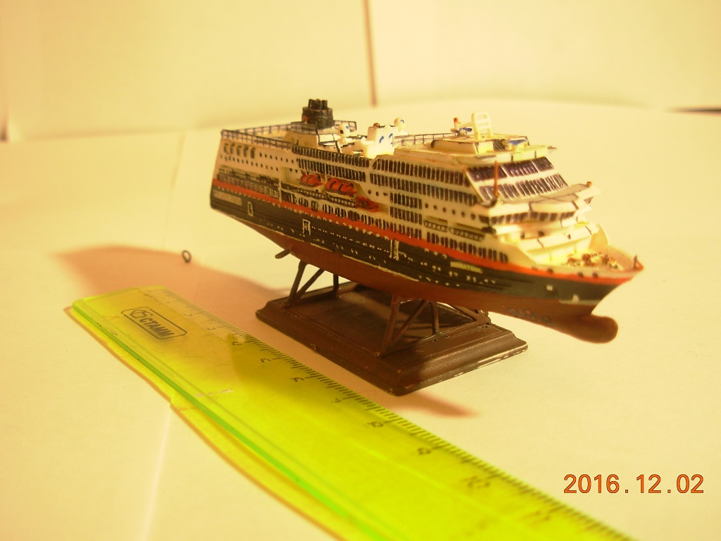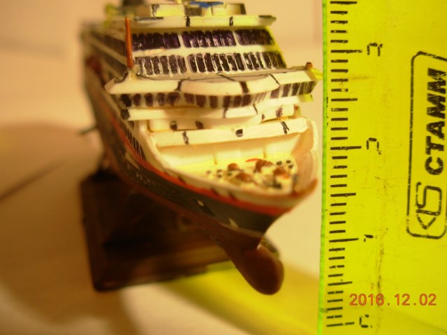 Артур, здравствуй. Понимаю, ты хотел усложнить окраску мелкой модели и получить более выигрышный вид. К сожалению не всегда это удаётся. Самое неправильное решение для данной модели, это палубный настил. Посчитай, какой ширины доски понадобятся для настоящего корабля? Второй крупный минус- белые ободки иллюминаторов. Получились размазанными, а ещё больше не соответствующими окраске прототипа. Ты представил фото с полностью чёрным бортом без белых ободков. И сложная по исполнению красная полоса переменной ширины. В этот раз не получилась.