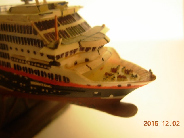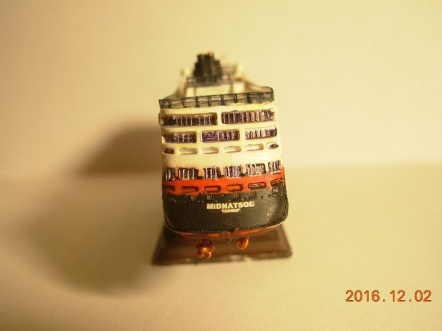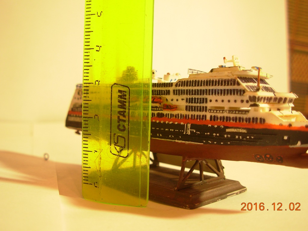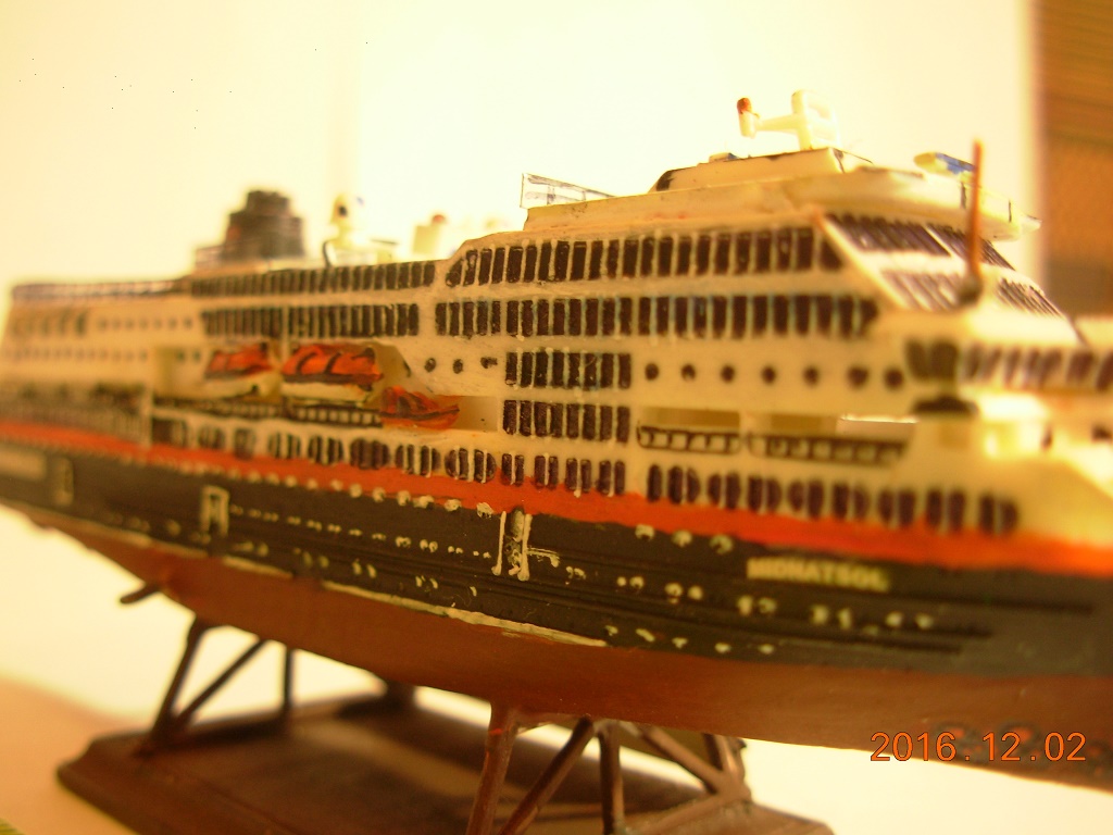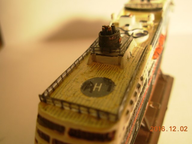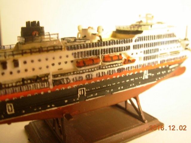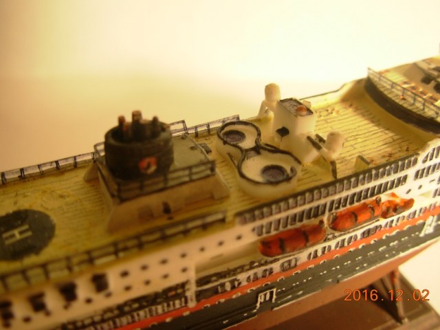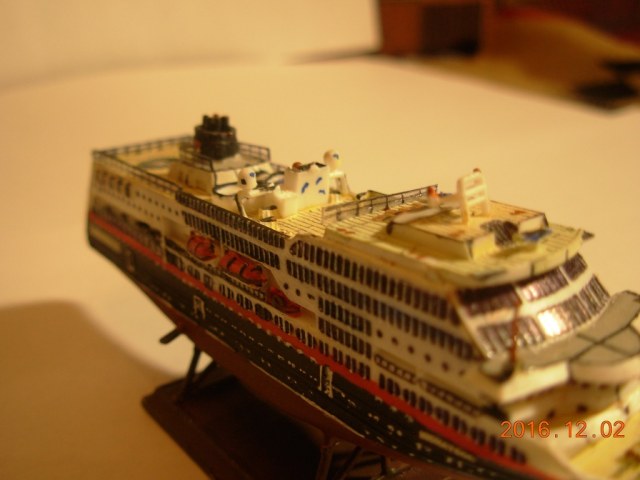 Артур, здравствуй. Понимаю, ты хотел усложнить окраску мелкой модели и получить более выигрышный вид. К сожалению не всегда это удаётся. Самое неправильное решение для данной модели, это палубный настил. Посчитай, какой ширины доски понадобятся для настоящего корабля? Второй крупный минус- белые ободки иллюминаторов. Получились размазанными, а ещё больше не соответствующими окраске прототипа. Ты представил фото с полностью чёрным бортом без белых ободков. И сложная по исполнению красная полоса переменной ширины. В этот раз не получилась.