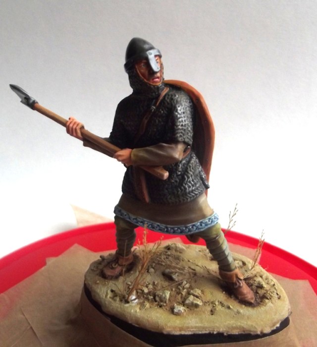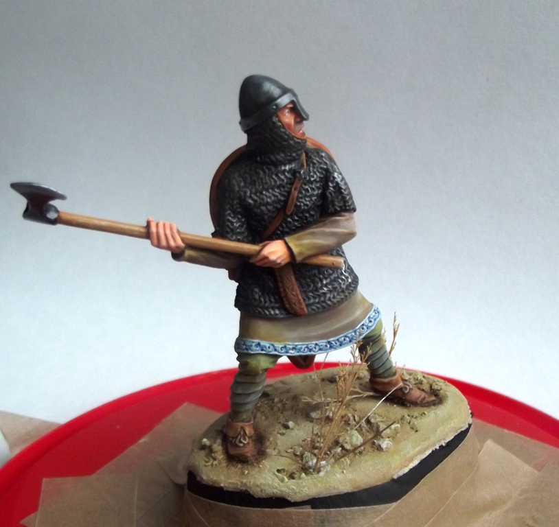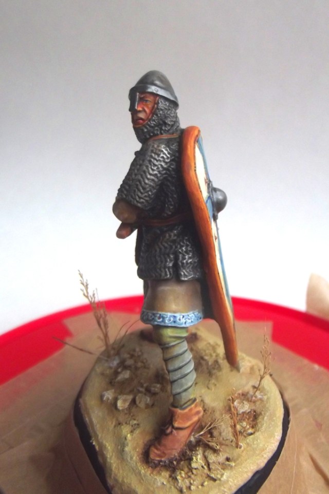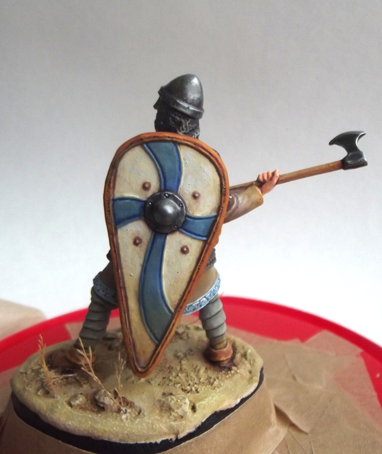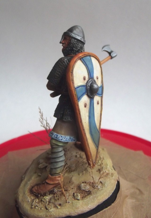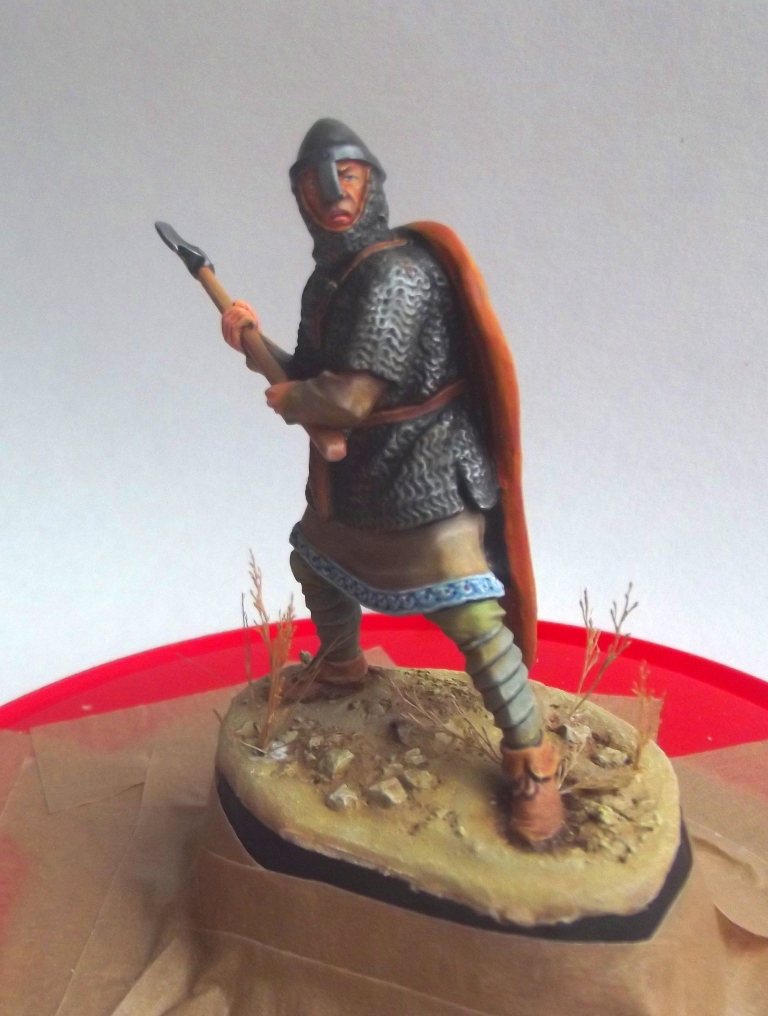 Некоторые аспекты я все равно не смог бы исправить, к примеру "приливы" между рукой и кольчугой. В теории можно сделать все, но я остановился на этой фигуре, какая она есть, выбрав её для своеобразного "отдыха", между рутинной работы на "заказ", и продолжающимся покрасом фигурок финнов для будущей своей диорамы. А то от обилия "белых маскхалатов" я уже перестал воспринимать цвета как должное.)