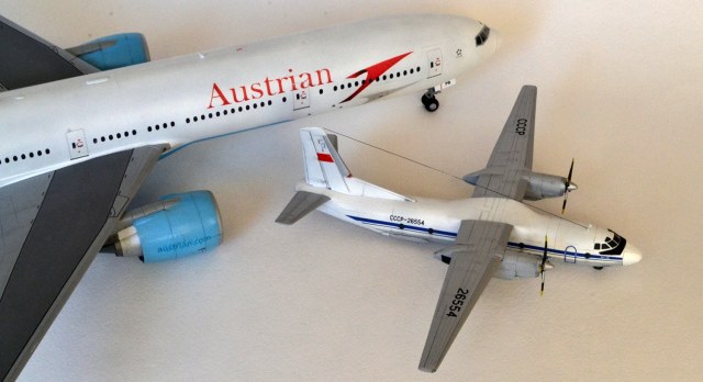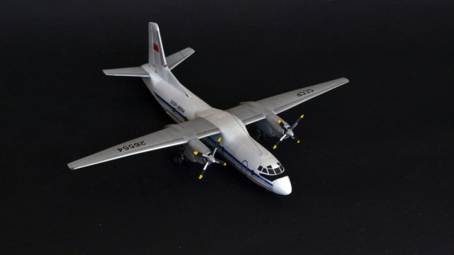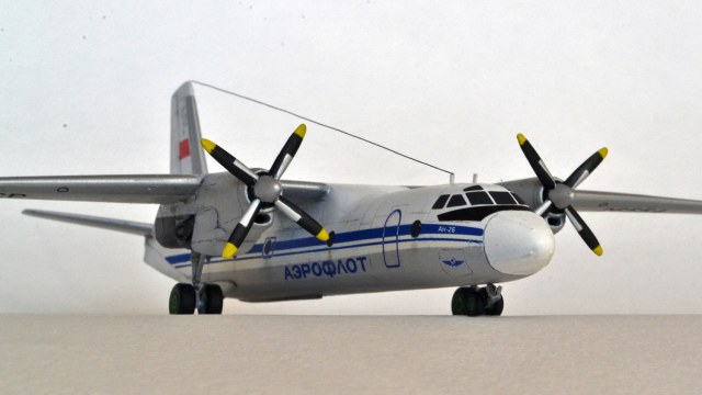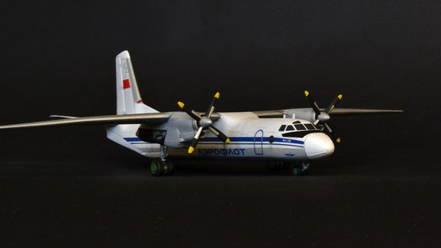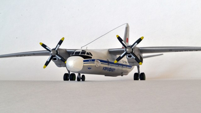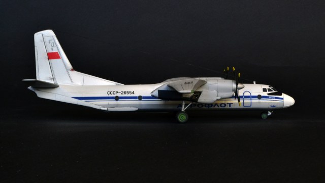 Наверно, стоит обратить внимание автору на геометрию стыковки крыльев к фюзеляжу - присутствует положительное V, которого в принципе быть не должно. Противообледенительная система винтов выглядит тоже нереалистично, лепестки занимают на винте не переднюю кромку, а половину профиля лопасти. Накладки на носовом обтекателе просто нужно было стачивать, они на живой машине еле-еле выступают!Антенна крепится не на киле сверху, а в кромку киля. Посмотрите фотографии внимательно - их много, и тогда удастся избежать очевидных огрехов. О схеме окраски я не буду говорить - откровенно слабо. Нет параллельности в геометрии, не подкрашены законцовки стабилизатора и крыльев.Прикрепил фото Ан-24 - это в принципе ничего не меняет - схемы окраски, винты и прочее одно и то же. Надеюсь, что замечания не обидят, но помогут автору в дальнейшем творчестве. С уважением к коллеге....