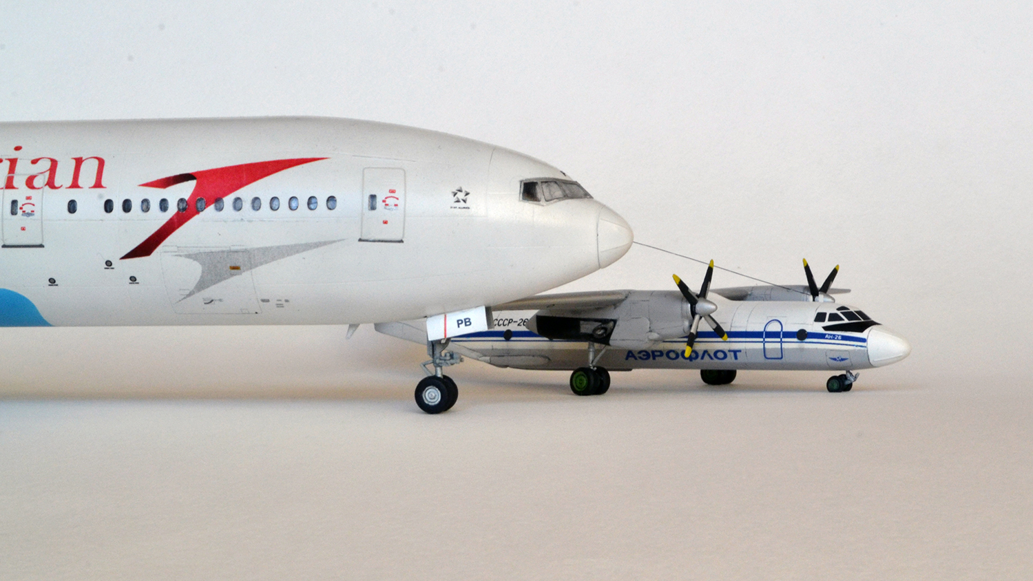 Сергей, поскольку ливрея ( хотя я предпочитаю -схема окраски самолета) "Аэрофлотовска", то она была стандартизована. Не хочу здорово рыться, просто прикреплю фото те, что под рукой. Обратите внимание на линию и схему нанесения черной краски на мотогондолы двигателей - она смотрится параллельной бортовой синей полосе. Я понимаю, что 144 масштаб не простой, сам в нем работаю, и достичь результата там не просто. А лепестки - ПОС винта электрическая и если поближе посмотреть на неё, то она состоит из полосочек, в простонародье авиационном - лепестки, это слэнг.