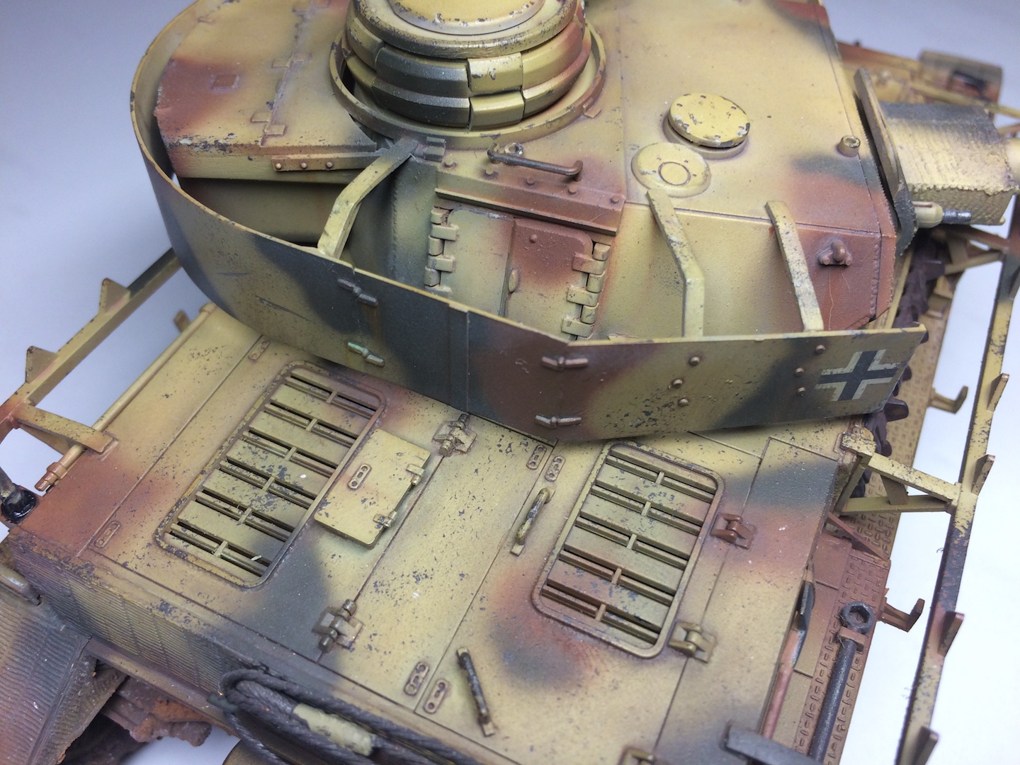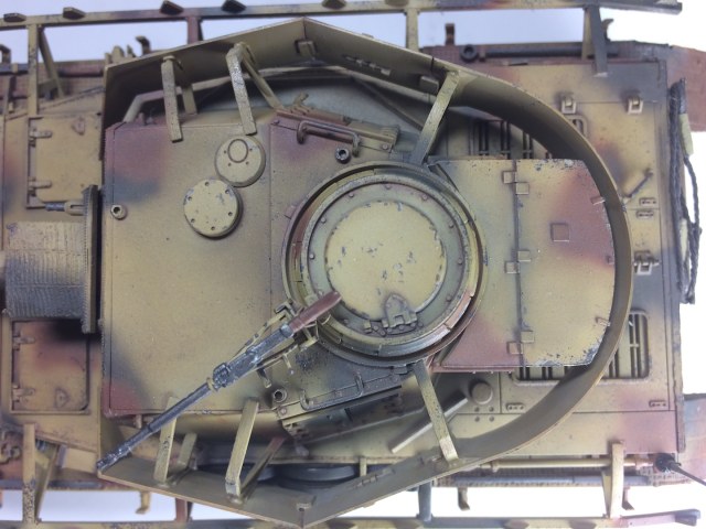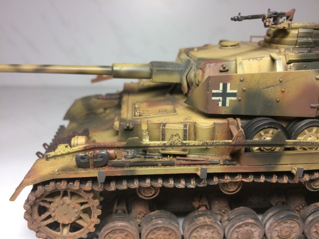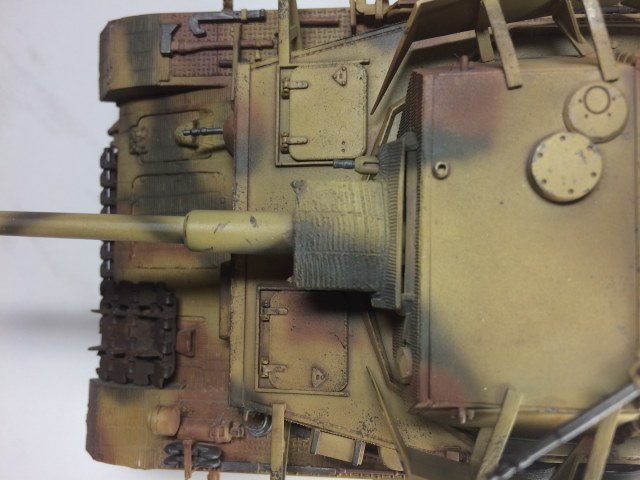 Без доработок эта Тамия выглядит абсолютно деревянной. Толщину башенных экранов можно было хотя бы сточить немного. Места стыков циммерита неплохо бы зашпаклевать было. Трос не смотрится. Гусеницы и элементы ходовой рабочими не выглядят, блеска трущихся деталей нет, зато есть грязь, видимо натолканная кисточкой абы как. Лучше бы совсем без грязи.