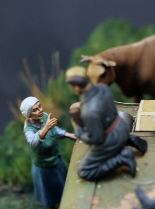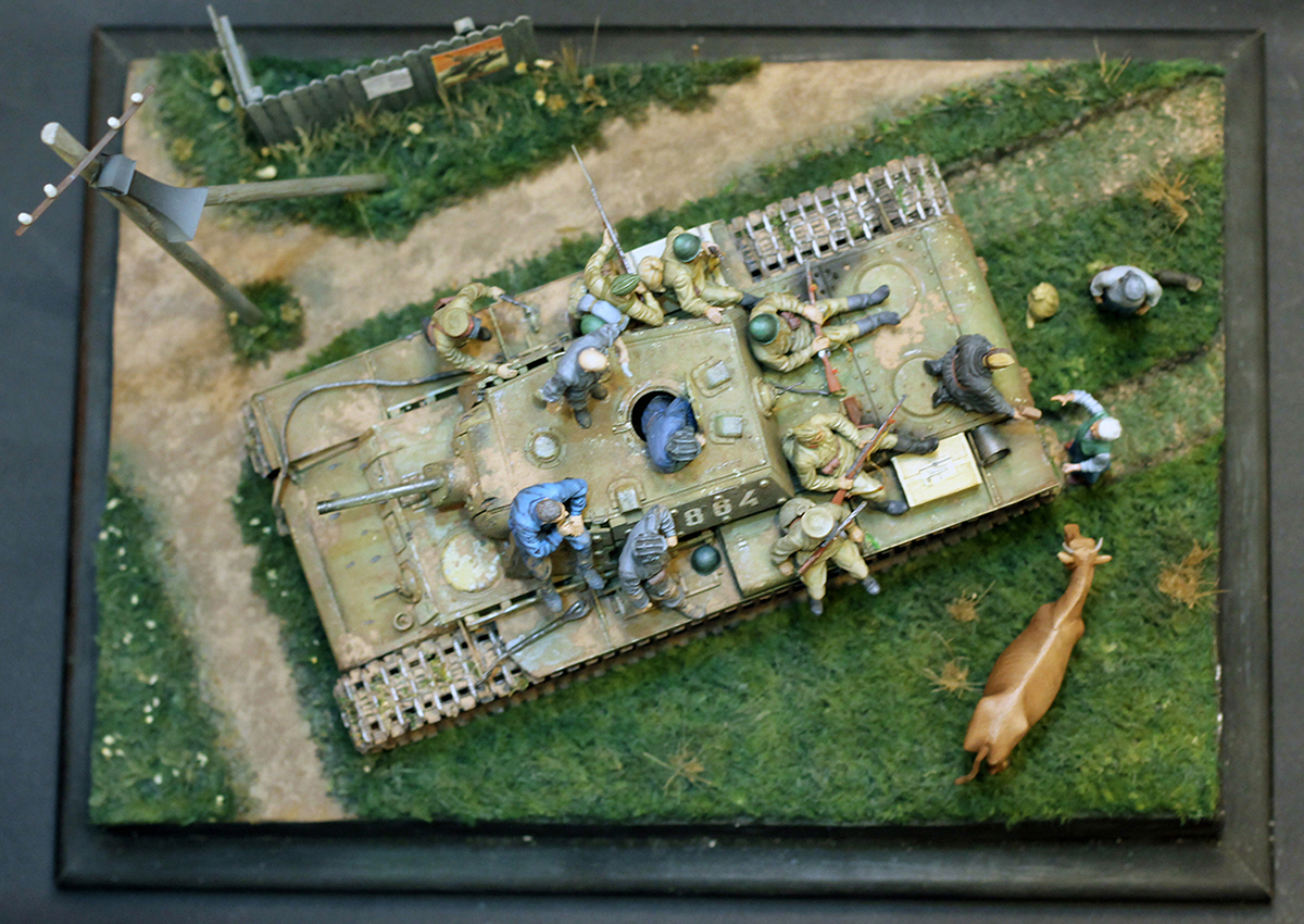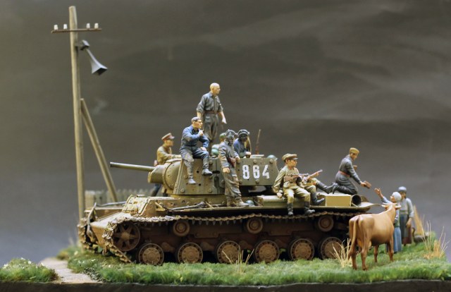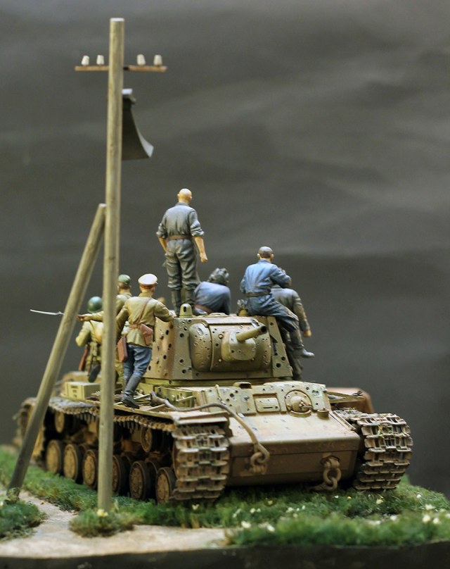 Замечательная идея и исполнение,только кот не очень удался,не надо было его так близко.Слишком бросается в глаза также большое число пробитий на танке,похоже на PAK-38,а она ни в какую не пробивала КВ,а уж тем более экранированный(Отто Кариус писал,что их часто не пробивали даже 88-мм. зенитки!).А вообще зарегистрированный рекорд КВ по количеству попаданий-146 вмятин без пробитий,с детства помню это из книги "Конструктор боевых машин" о Ж.Я.Котине.