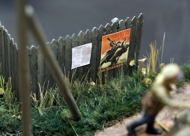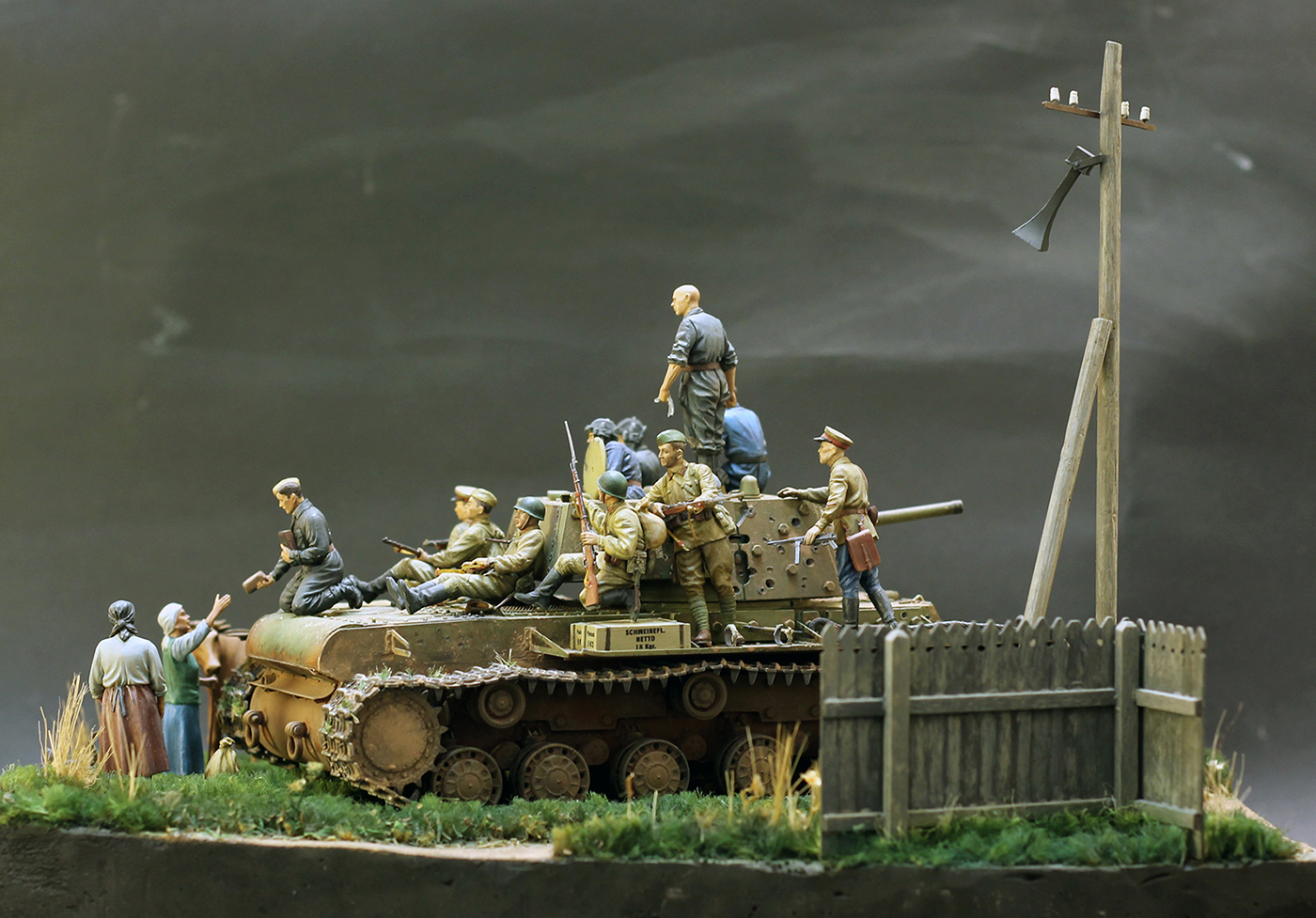 Основание выполнено из гипса. Трава делалась в три этапа – подложка от Tamiya, затем идет распушенная крашенная веревка, а уже после включения отдельных стеблей травы из старой малярной кисти. Забор деревянный. Столб фирмы MiniArt, а динамик на столбе смоляной.