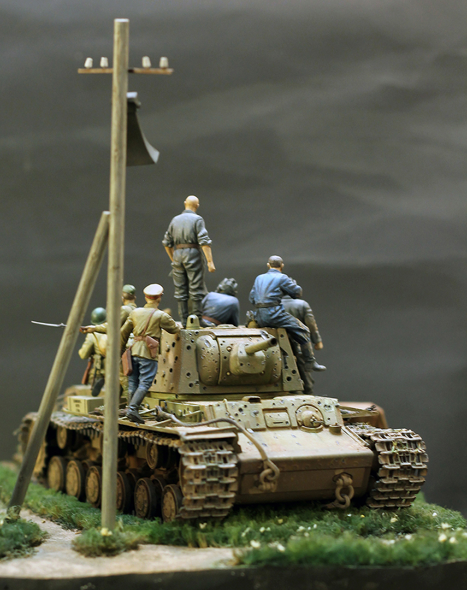 Что касается самой постройки, то КВ-1 был взят от «Моделиста», с добавлением фототравления от «Мира моделей». Ствол из пластика был заменен на точеный. Тросы заменены на стальные. В ходе сборки были воссозданы более 150 попаданий в КВ. Для разнообразия на танке присутствуют трофейные коробки (фирма производитель Stalingrad). Покраска и использование модельный химии представляет собой стандартный набор: 3dмодуряция, фильтры, смывки, сколы, пигменты.