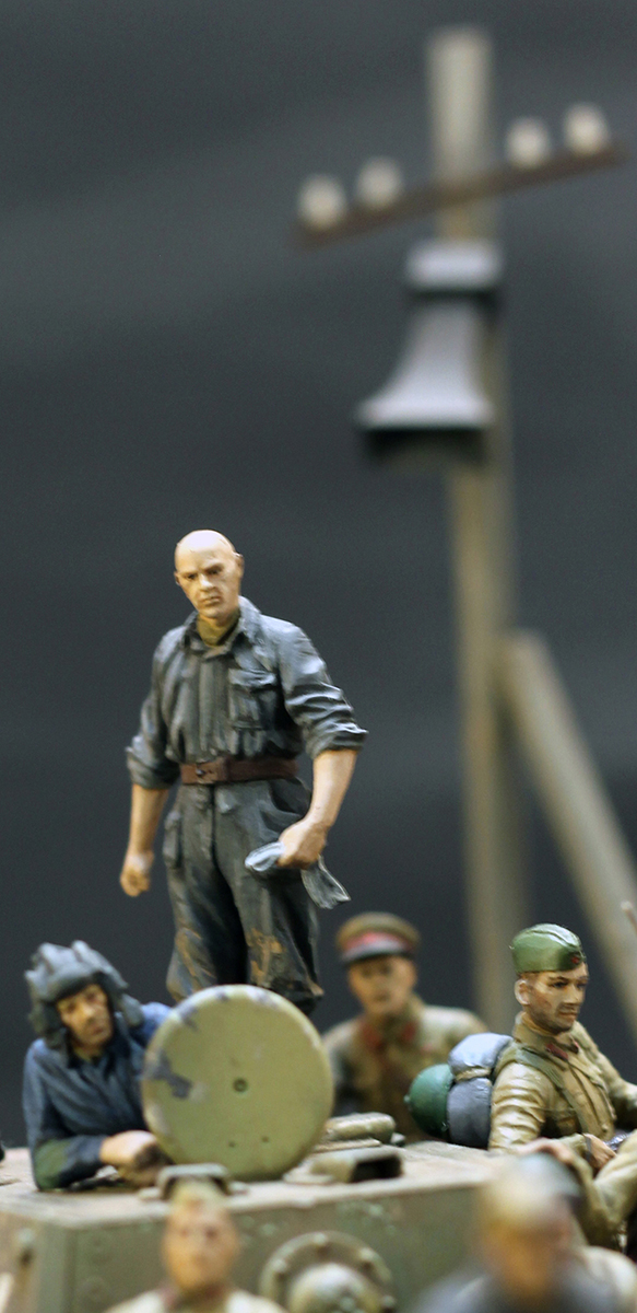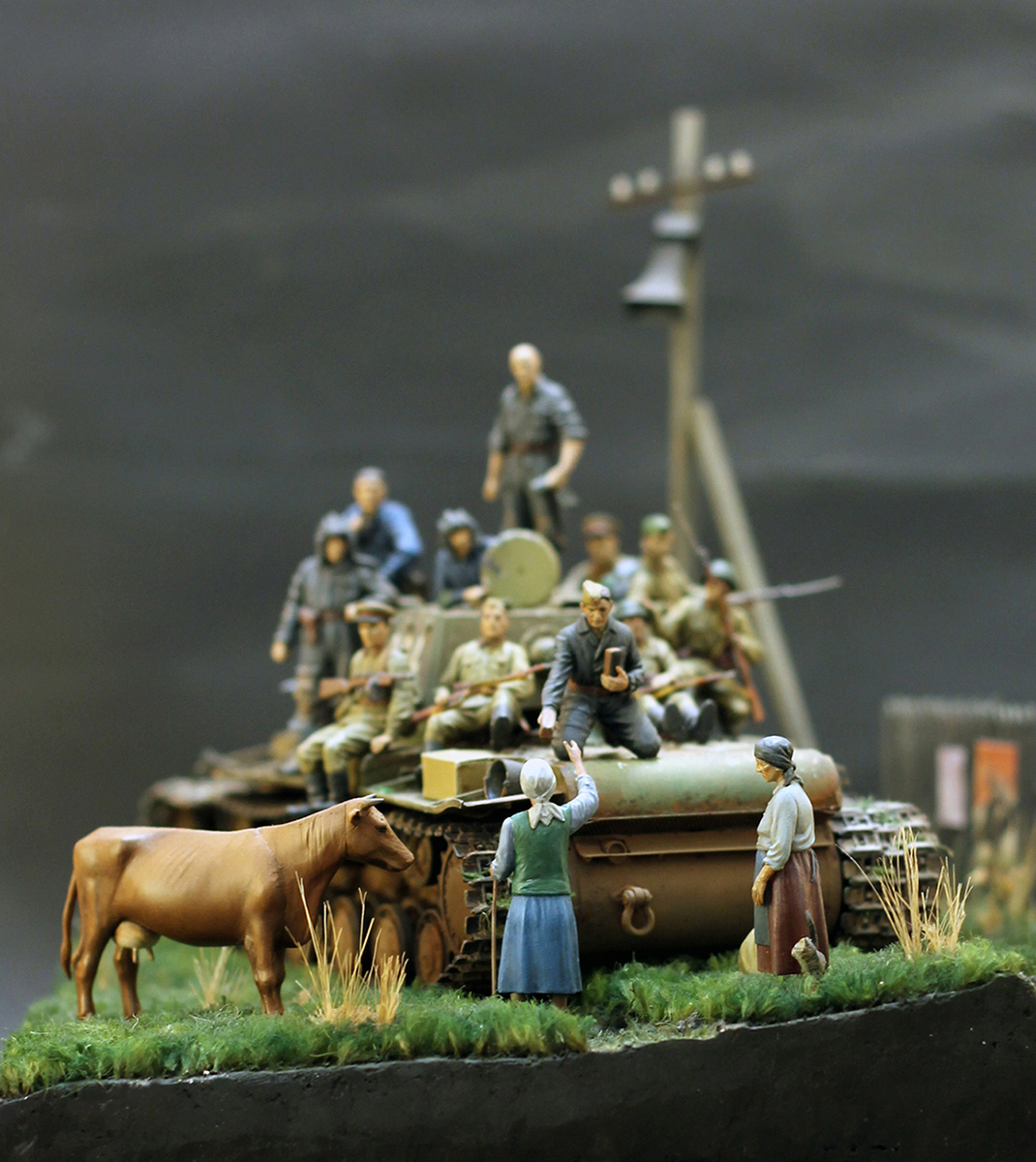 В начале мне хотелось сделать сюжет, связанный с предбоевой обстановкой, но после того, как прочел стих Константина Симонова «Ты помнишь Алеша дороги Смоленщины», решил делать эпизод после боя. Что, мол, воевали танкисты смело, а все равно отступать надо, а женщины вышли их проводить. А танкисты не каменные – поделились с местными жителями, чем могли. И фраза из стиха стала названием работы «Мы вас подождем».