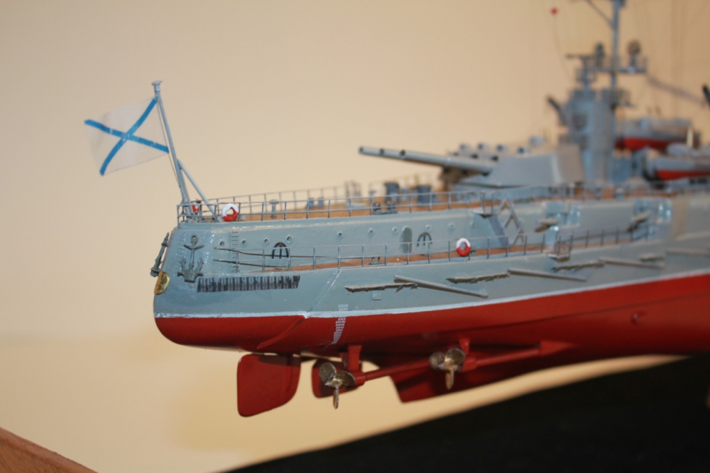 Остались некоторые работы которые я не успел сделать по причине очередного контракта. Планирую сделать кое какую тонировку по корпусу, вооружить оттяжки противоминных выстрелов, установить 4 парадных трапа и заказать табличку как на предыдущих моделях.
