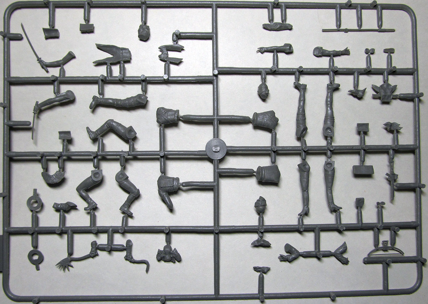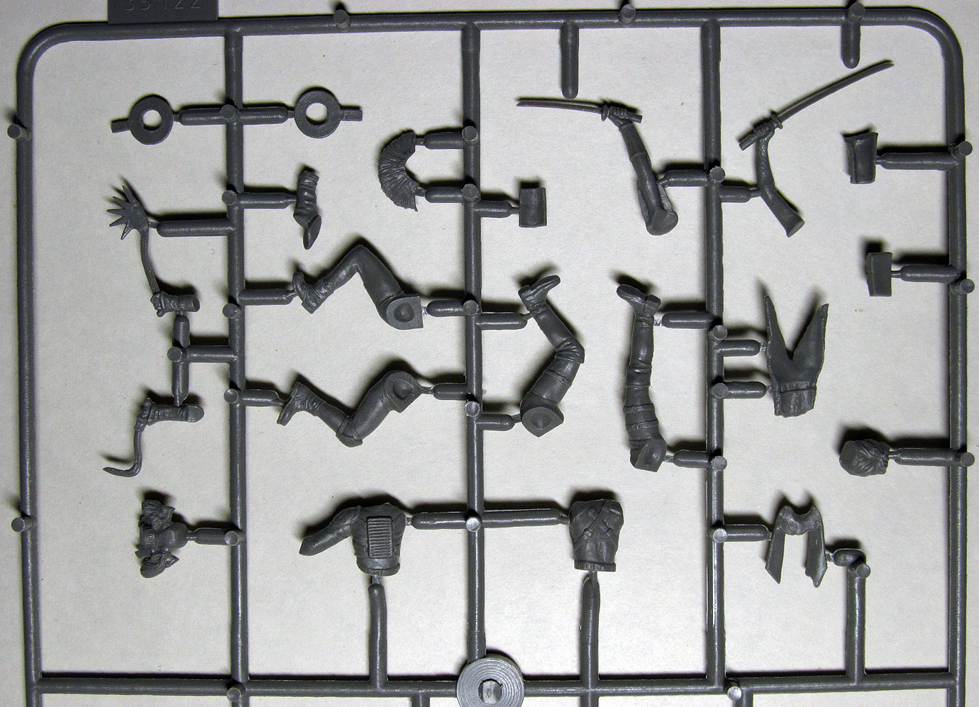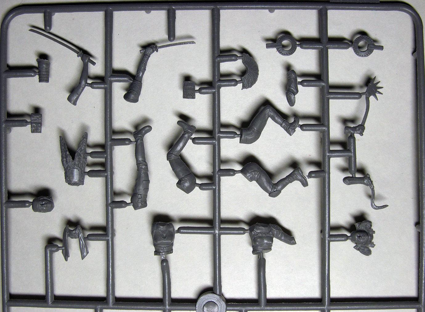 Коробка стандартная, с боковой загрузкой и эффектным, красочным рисунком. Инструкция по сборке и окраске на обороте коробки в стиле "два в одном". Внутри коробки одна литниковая рамка с деталями на четыре фигурки. Проработка, на мой непритязательный вкус, очень неплоха: множество ремешков, шнуровки, куски шкур и кольчужные вставки доспехов - всё пролито очень чётко. Облой присутствует в минимальных количествах, смещений половин пресс-формы нет, но очень заметны следы от их стыков. Немного обманывают ожидания лица - они слегка угловаты.