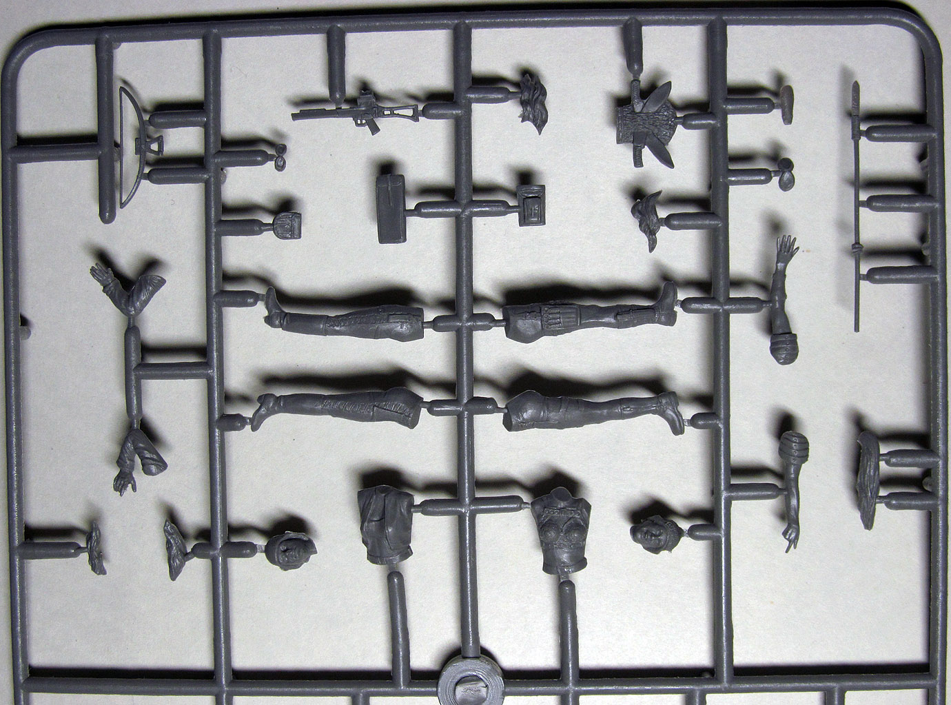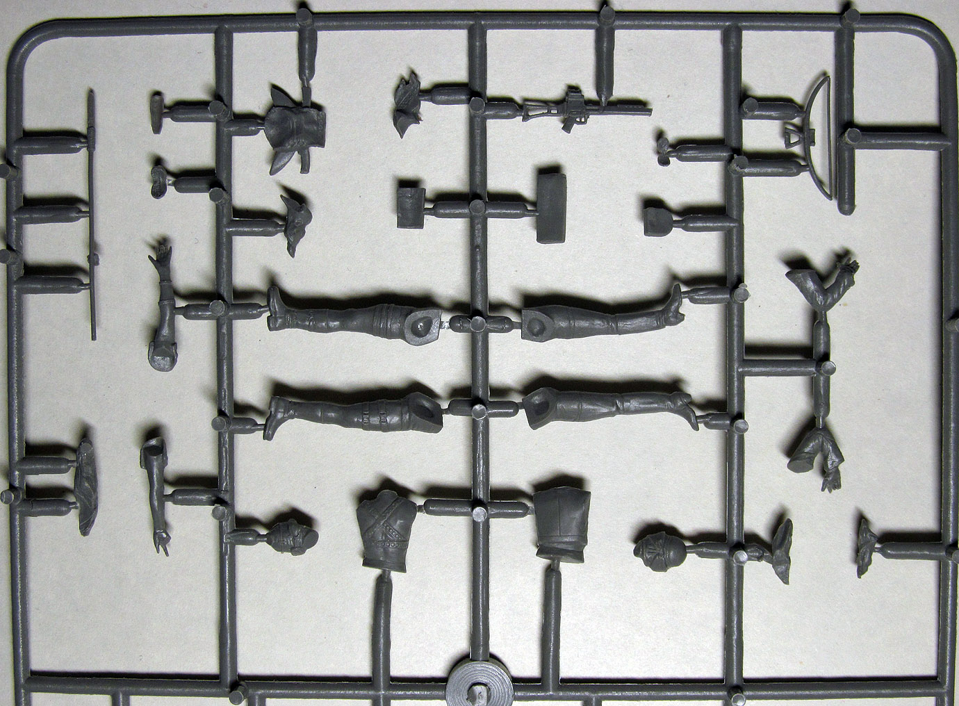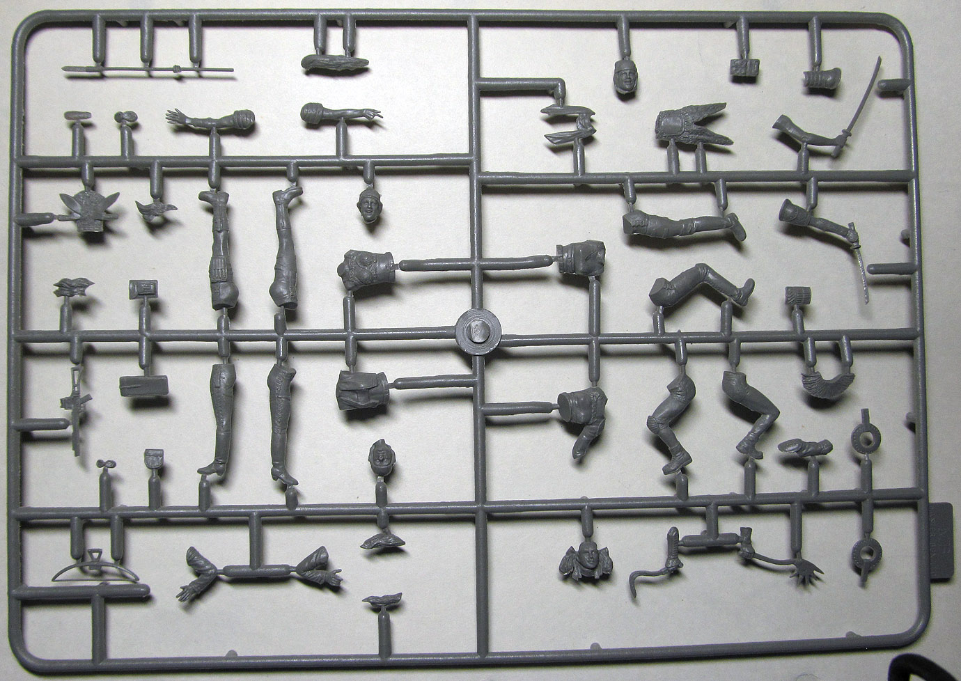Коробка стандартная, с боковой загрузкой и эффектным, красочным рисунком. Инструкция по сборке и окраске на обороте коробки в стиле "два в одном". Внутри коробки одна литниковая рамка с деталями на четыре фигурки. Проработка, на мой непритязательный вкус, очень неплоха: множество ремешков, шнуровки, куски шкур и кольчужные вставки доспехов - всё пролито очень чётко. Облой присутствует в минимальных количествах, смещений половин пресс-формы нет, но очень заметны следы от их стыков. Немного обманывают ожидания лица - они слегка угловаты.