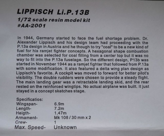 Модель из смолы от фирмы Anigrand Craftswork в масштабе 1/72 (номер по каталогу 2001) упакована в картонную коробку с верхним открытием. Качество литья довольно среднее, присутствуют дефекты. Количество деталей минимально. Расшивка грубая и местами неаккуратная. Бедновато выполнен интерьер кабины. Декали и фонарь смотрятся неплохо. Инструкция проста и наглядна.