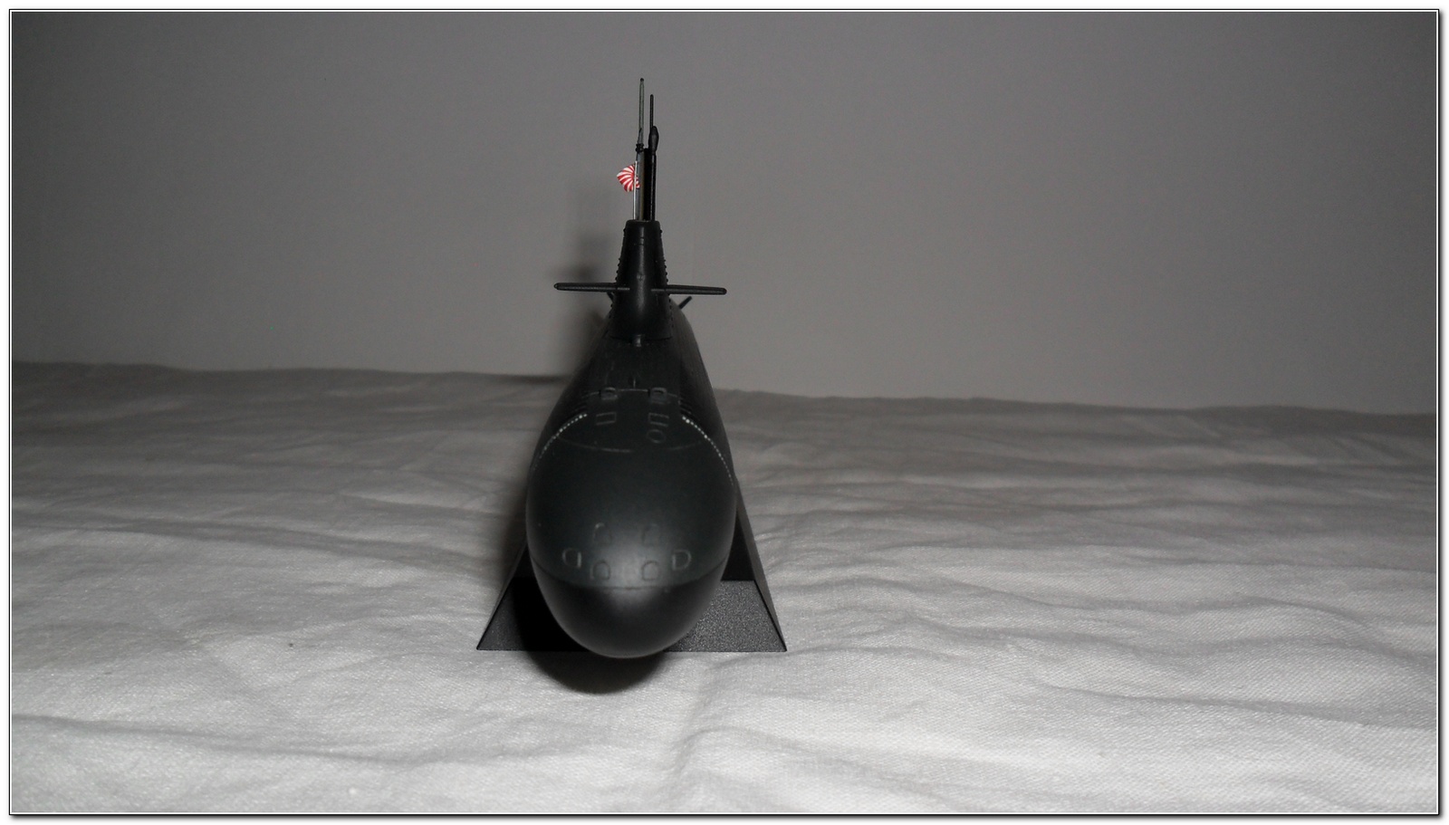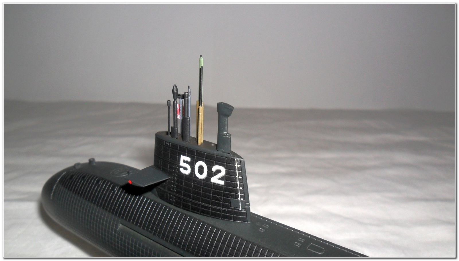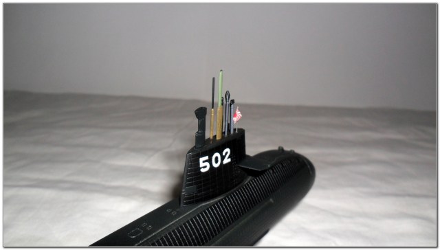 Собрал я ее быстро, дольше шла окраска)) Сама сборка проста до безобразия, "на щелчок" образно выражаясь. Сначала корпус, покуда он сох, все остальное. Доработок никаких не проводил поскольку те немногие фото, что нарыл, не сильно разнятся с набором. Можно сказать, что это чистая изкоробка с минимумом "улучшений". "Улучшения" чисто символические; сверлом d=0,5 мм углубил отверстия вывода дизеля побортно, скрайбером прошелся по кормовым шпигатам, заменил пластиковый рубочный флагшток на обрезок стальной проволоки d=0,1 мм, немного "убил" плиточную расшивку наждачкой, но, как оказалось впоследствии недостаточно, проявила себя зараза как ни крути, хоть и стала менее ярко выраженной чем изначально. Кормовой и носовой флагштоки ставить не стал, посчитал что с ними лодка будет черезчур нарядной. Также, по уму следовало заменить швартовочные рымы, скоб-трапы на рубке, свести "под ноль" расшивку плитки, врезать лобовой рубочный фонарь, но, эти моменты я проигнорировал.