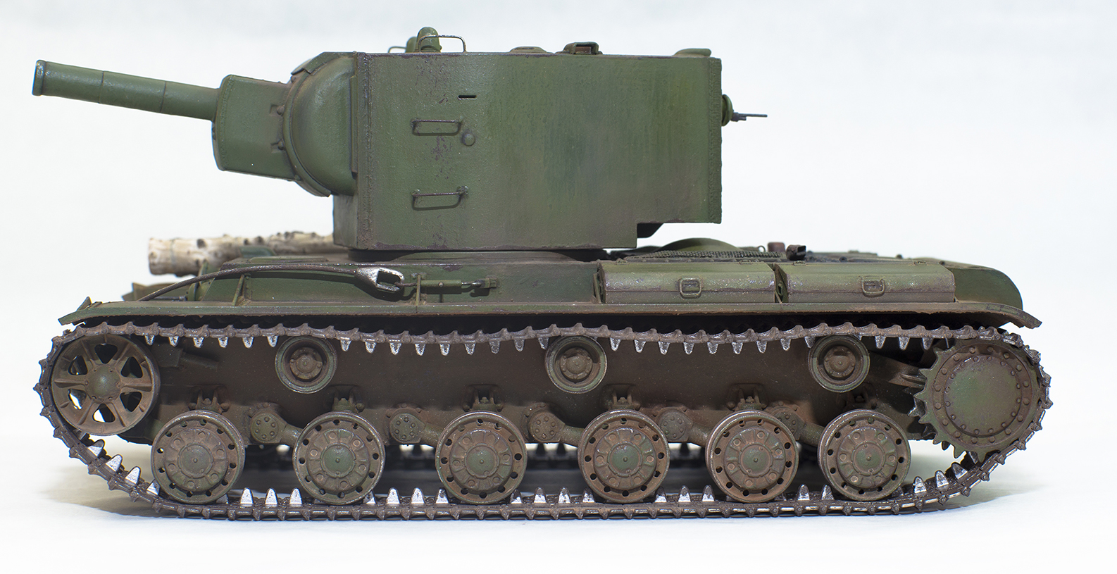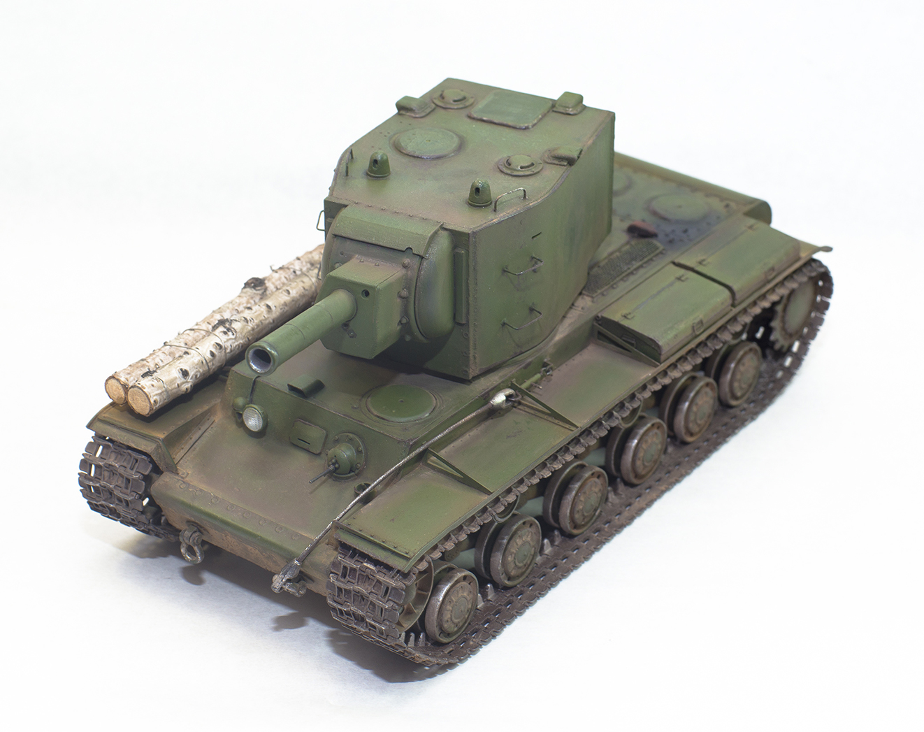 При сборке старался (насколько позволяет пряморукость) соблюдать историческую достоверность. Бревна самовыкапывания на борту, да ещё и березовые, ещё и два сразу, ещё и неотесанные, это, конечно, отсебятина, но мне показалось что это добавит брутальности машине. То же можно сказать о подржавленных выхлопных трубах, и некоторой ободранности по краске для танка, который успел повоевать не так долго. Но теоретически такое вполне могло быть на 1941 год.