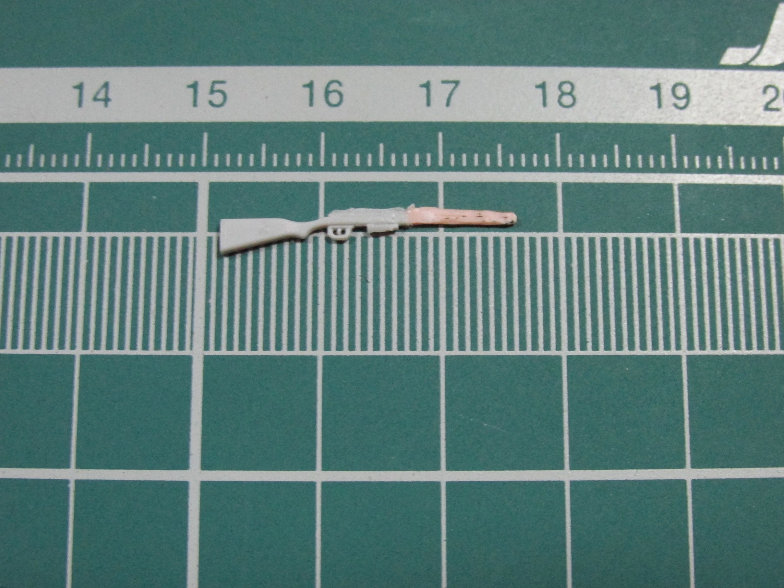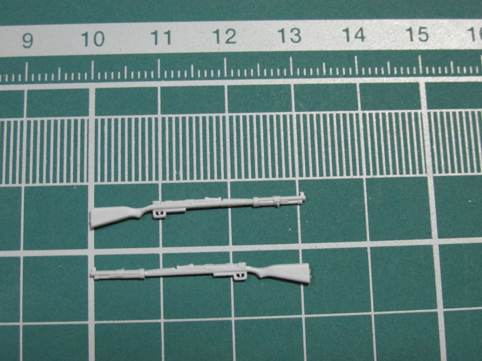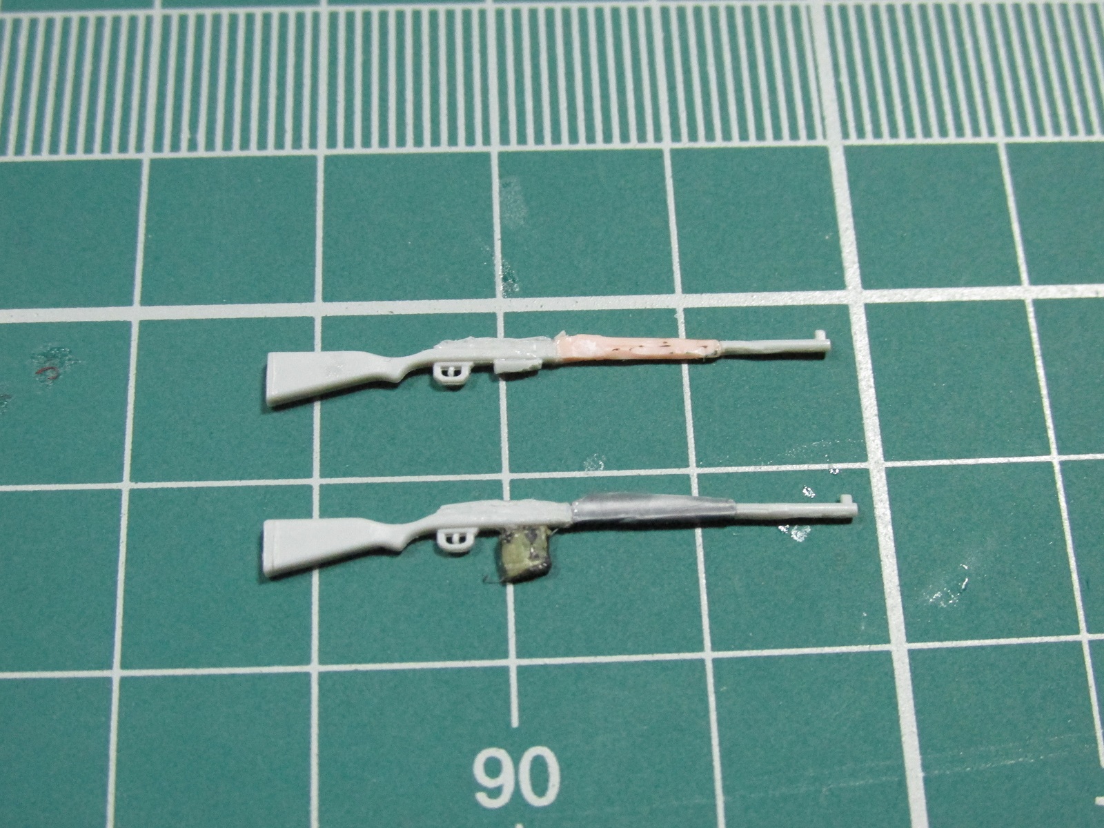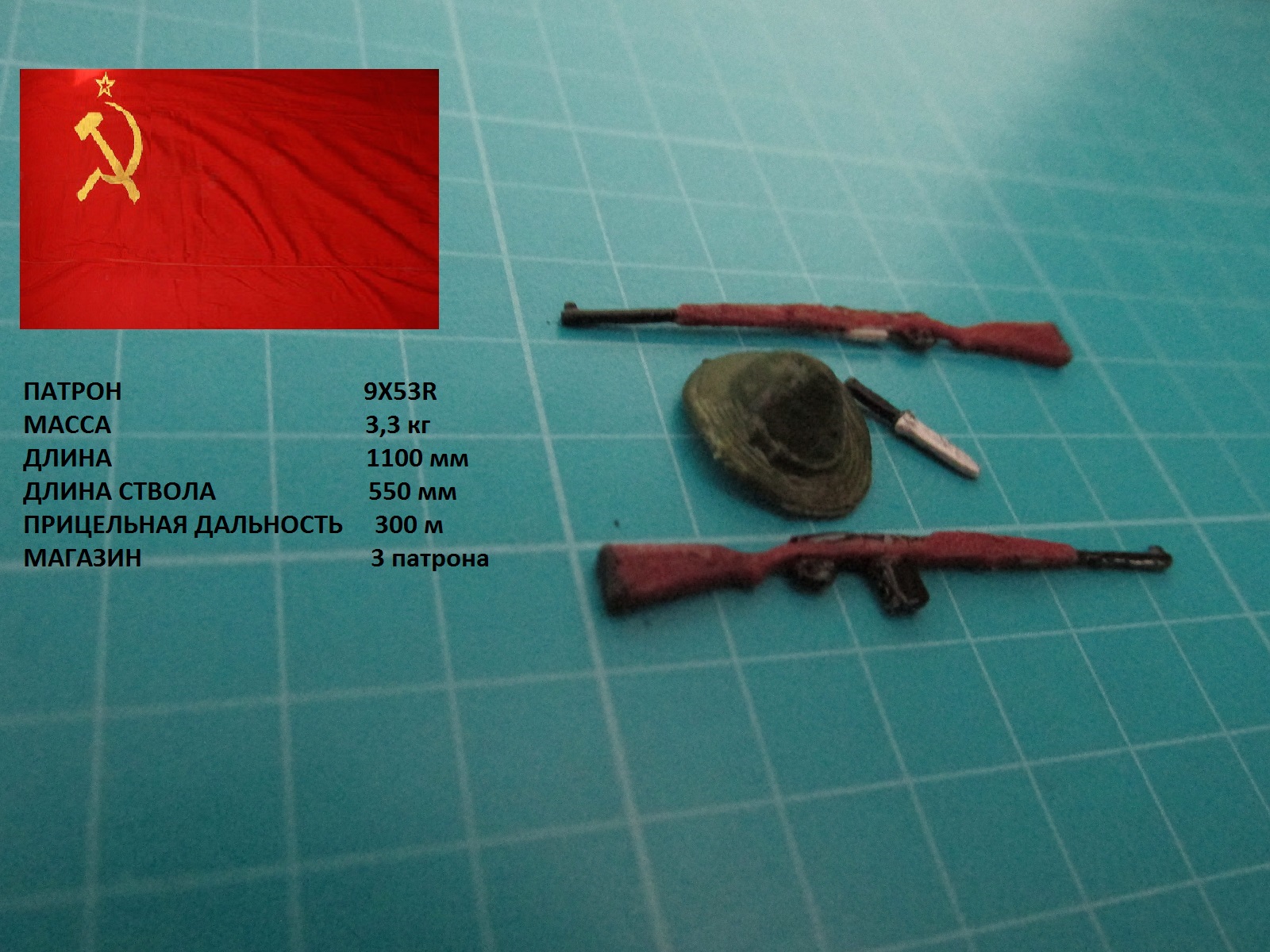 Добрый день, представляю вашему вниманию скромный лайфхак. Немного истории, купил как то очень давно набор “советская пехота в зимних масхалатах 2МВ”, по замыслу производителя две фигуры с ППШ и две с винтовками Мосина, но как видно по фото №2 данным образцам до Мосинок как до луны пешком туда и обратно. В итоге валялись они у меня в запаснике несколько лет, пока я случайно на них не наткнулся, и чисто случайно возникла идея их по переделки в охотничий карабин “Медвед-1”.