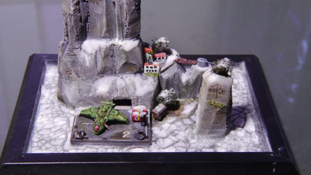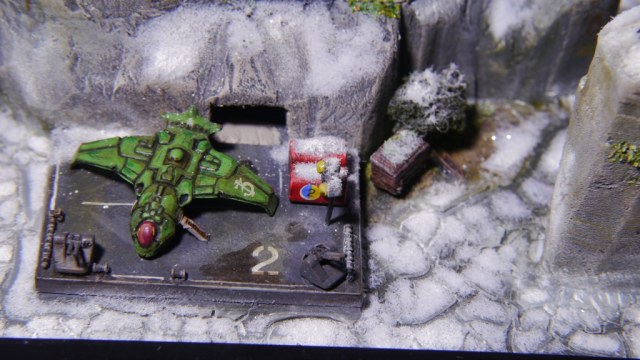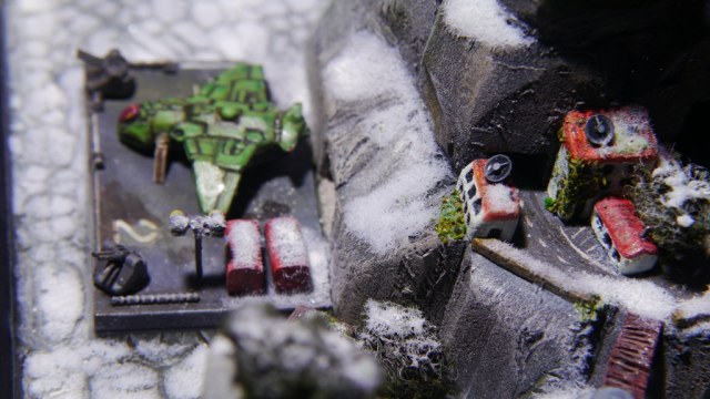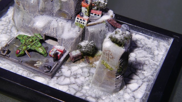 Скалы и домики сделаны из пенополистирола, деревья из ниток и чая, снег - молотая вата, ПВА и белый пигмент, а космический кораблик из какого-то старого шоколадного яйца. Прочая мелочевка от разных кораблей в 700 масштабе. Покрашено было акрилом от GW, Звезды и Tamia.
