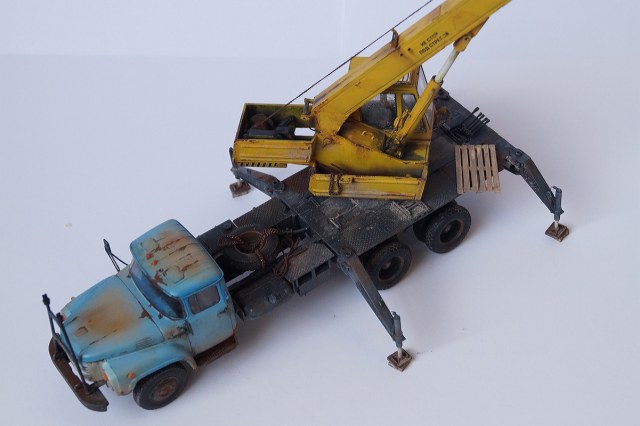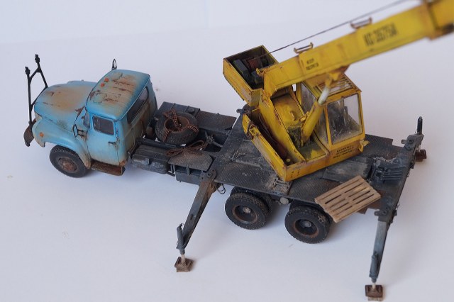 Хорошая работа. Кабина крановщика и стрела очень понравились, весьма натурально. По ржавчине на кабине согласен с коллегами. Еще резина очень темная, прямо теряется на фоне запыленности и остального"визеринга". Надо пигментом хотя бы протектор получше выделить. Модель сразу "миниатюрнее" будет смотреться.