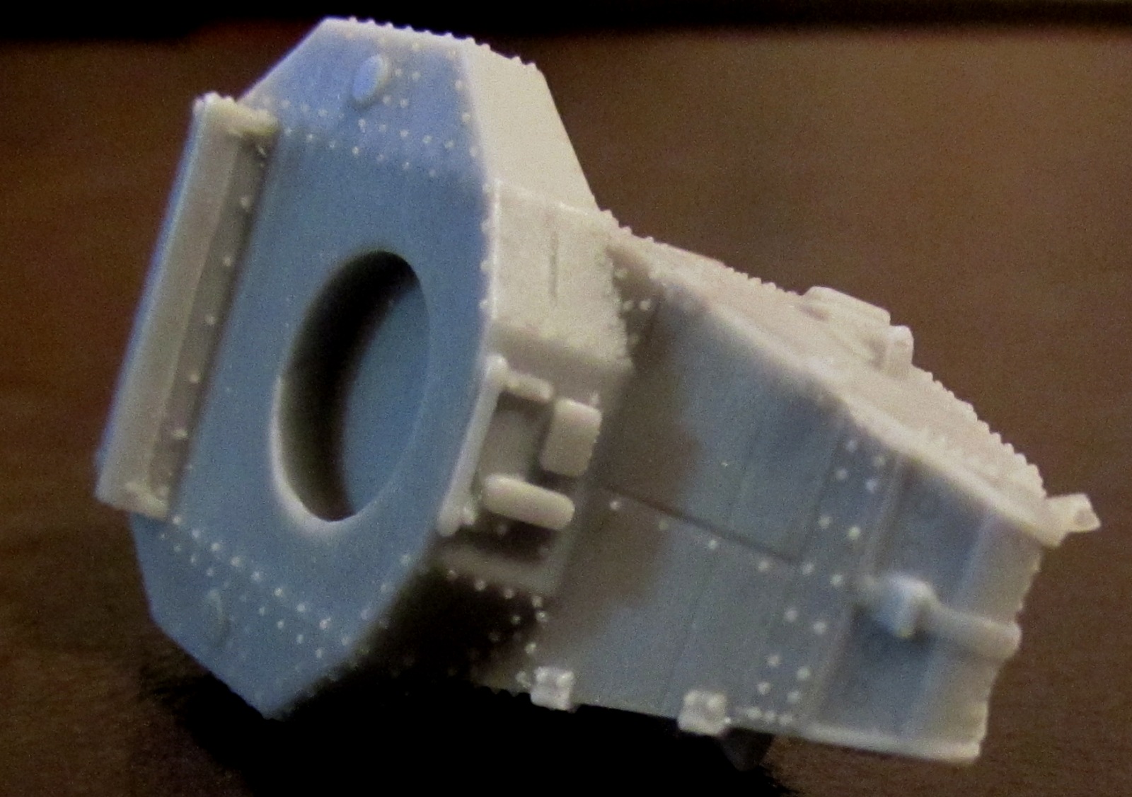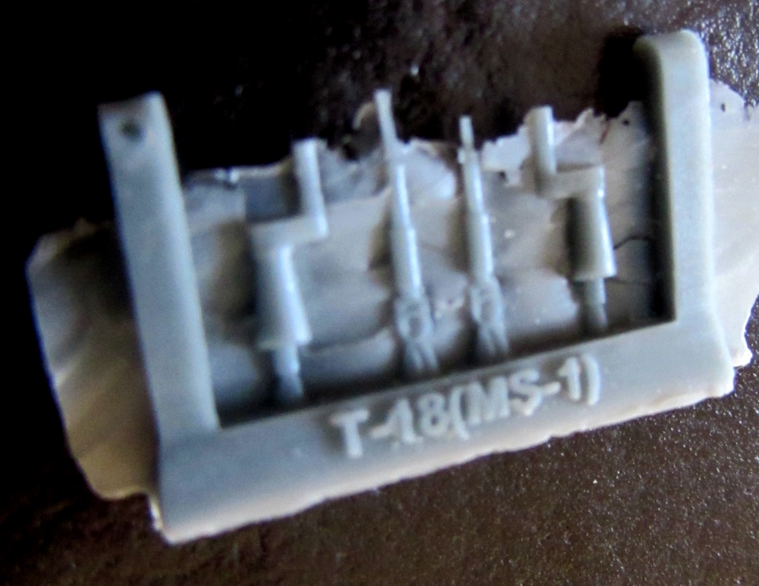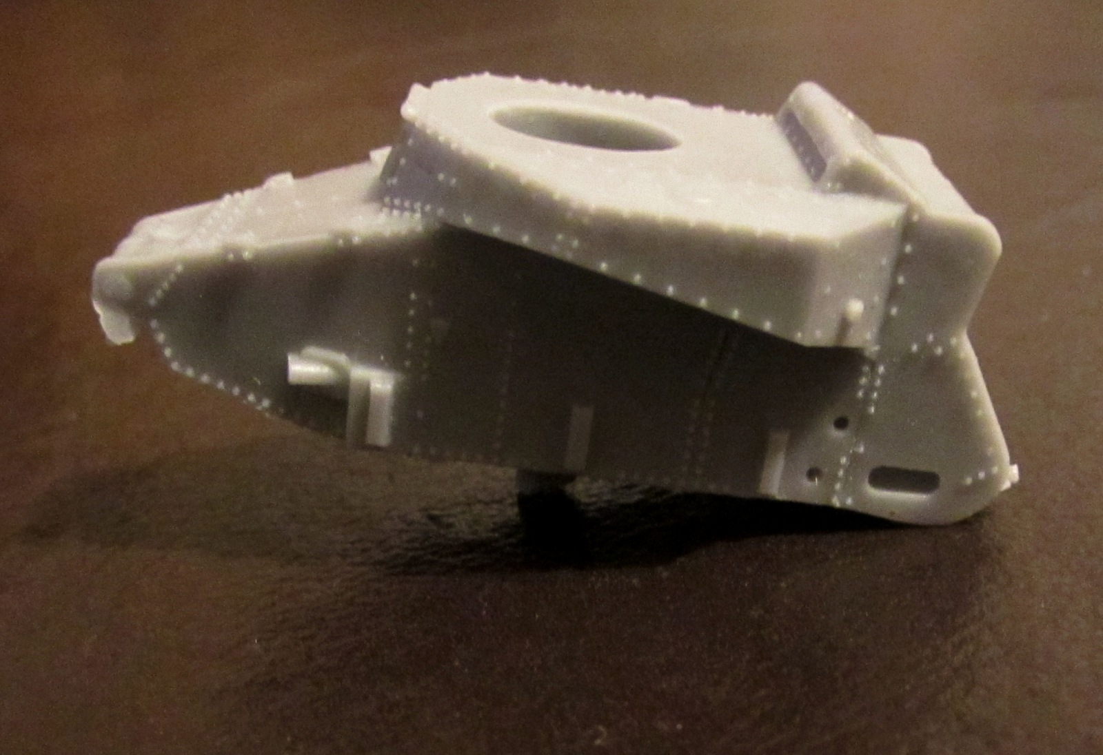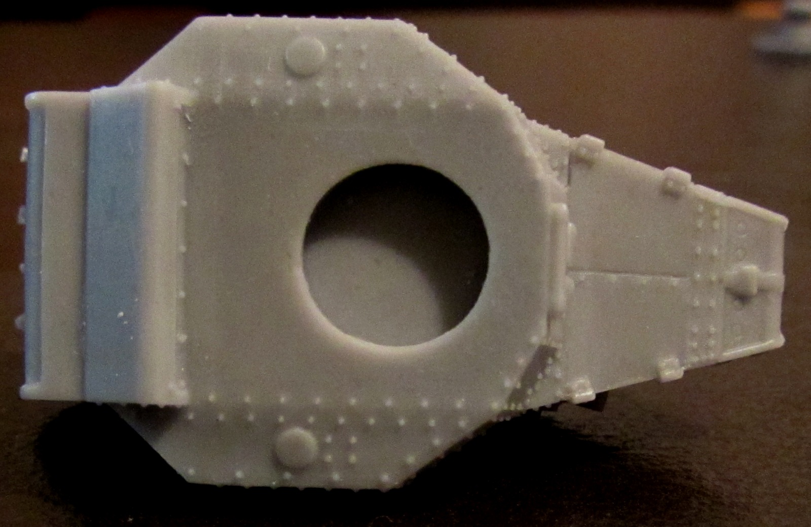 Литье приличное, хоть и с непроливом в корме. Смола светло-серая, грубоватая, и изрядным количеством облоя - причем облой очень твердый. Клепка есть, она хорошая - но в погоне за масштабностью ее сделали настолько мелкой, что боишься красить даже баллончиком (а ведь еще как-то грунтовать надо будет!).