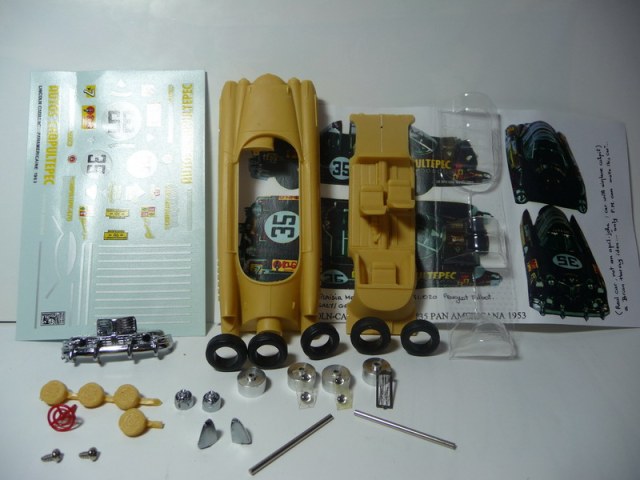 Содержание набора не отличается множеством деталей, а именно: две части корпуса (отлитые из смолы), две колёсных оси, точёные алюминиевые диски (4 штуки), 5 покрышек (от времени превратившихся в камень), тянутый из прозрачного пластика кокпит, пластиковый руль, смоляные колёсные колпаки, вылитые из прозрачной смолы фары, отлитые из металла и покрытые хромом - решётка радиатора за одно с передним бампером и подфарниками, задние обтекатели и габаритные фонари, фототравление - дворники; плюс комплект декалей.