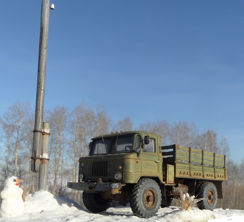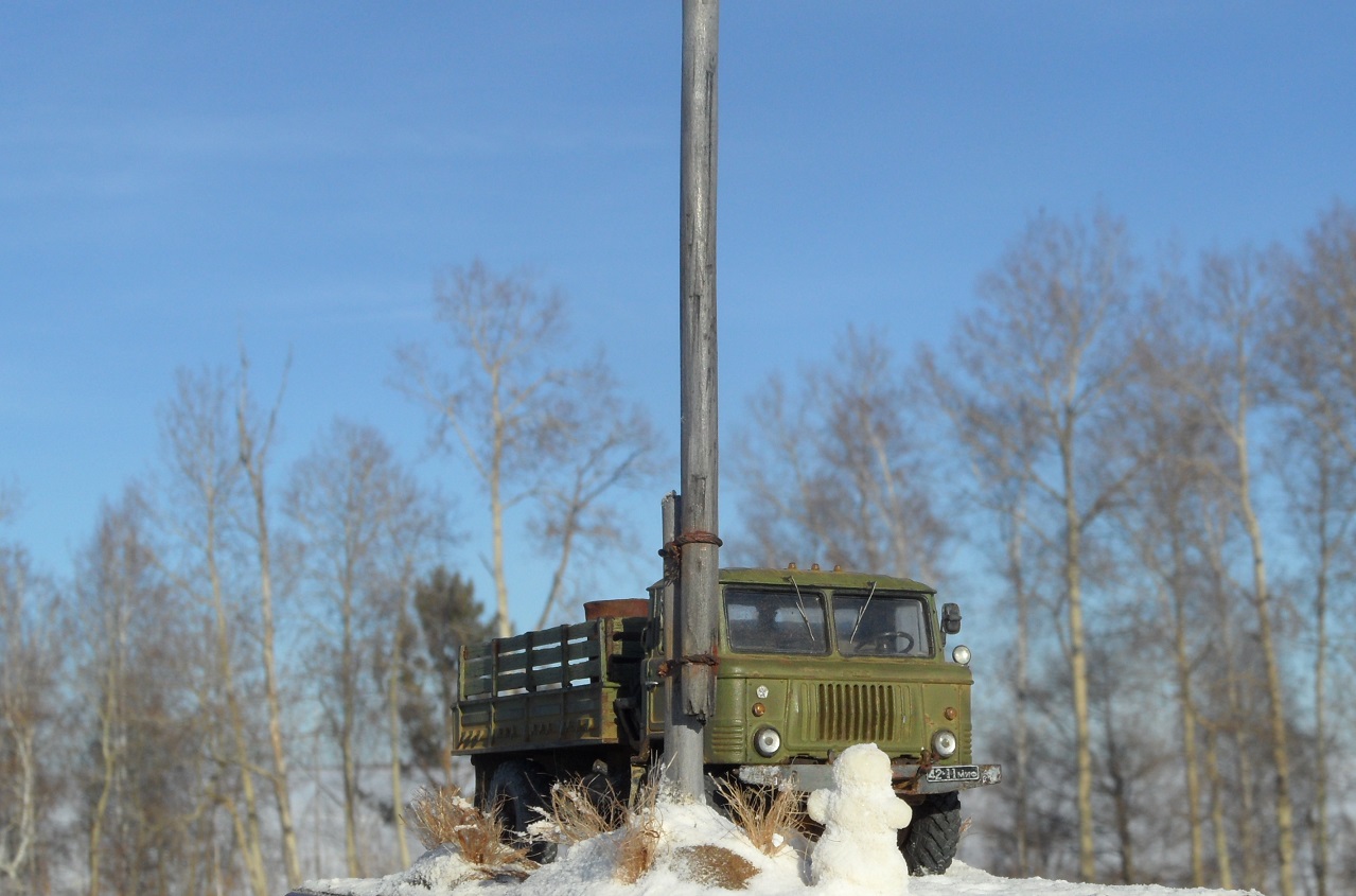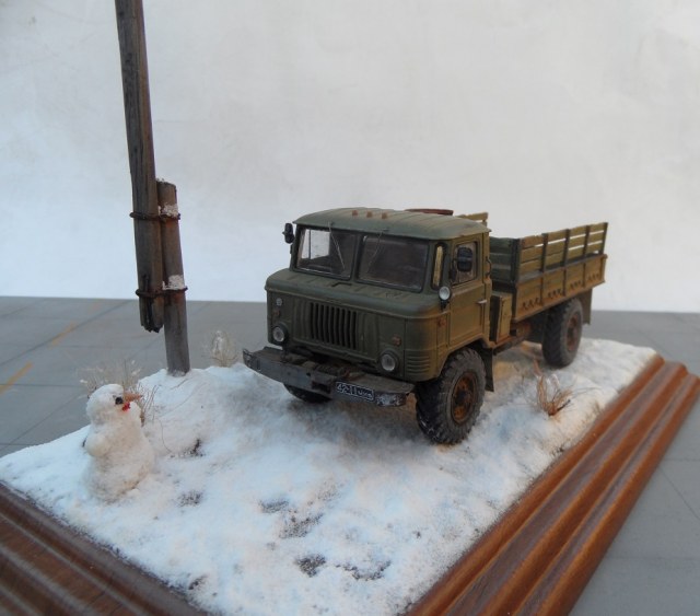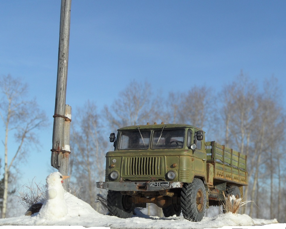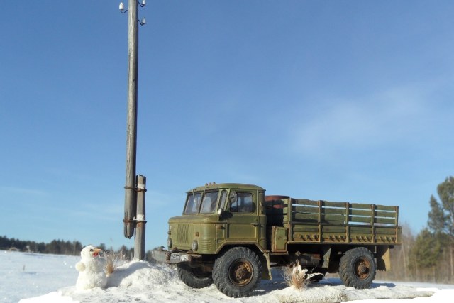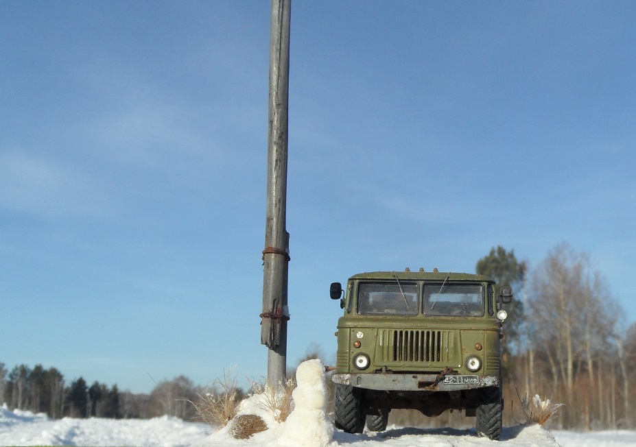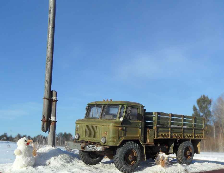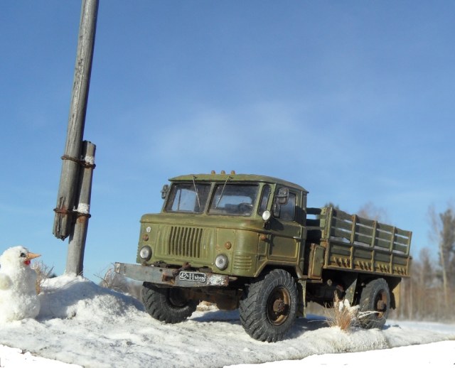 Всем привет! Сделал еще один Газик, описывать набор не стану. Из доработок резина и диски Маэстро моделс, переделаны держатели зеркал и фараискатель, сделал брызговики, знак качества- Петроград, сделал лебедку. Столб самодельный, снеговик из пластики).Окрашена Мотип хаки, тонирована пигметами Зип. Приятного просмотра!