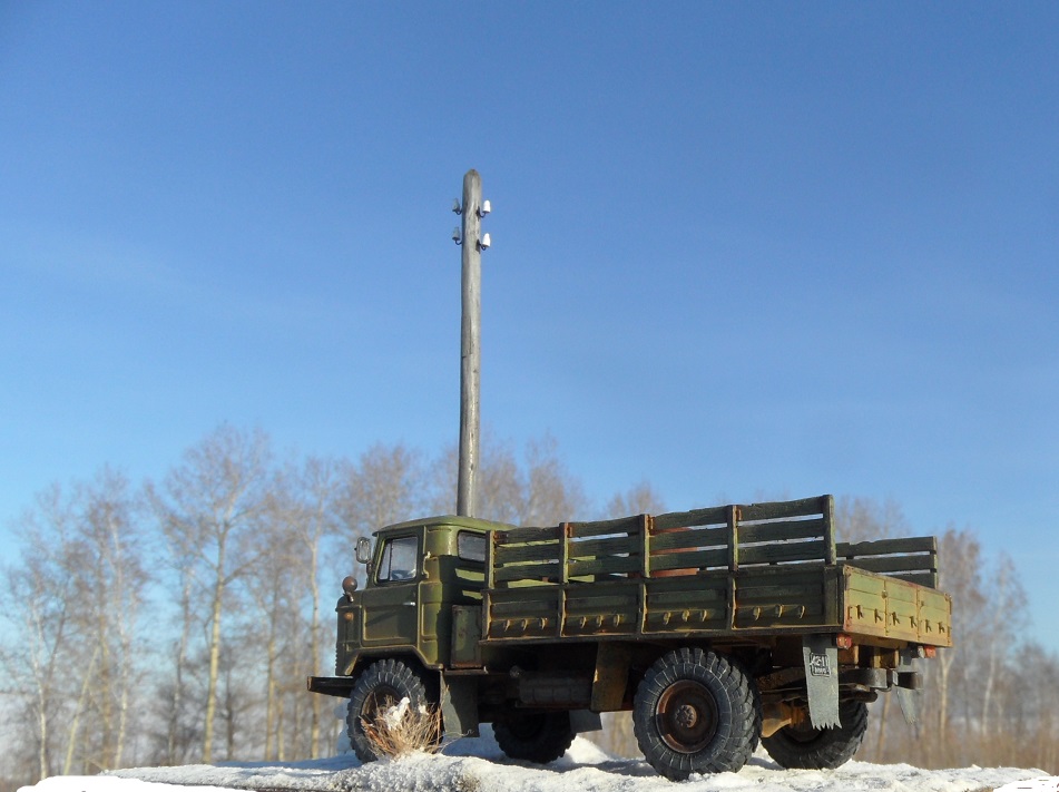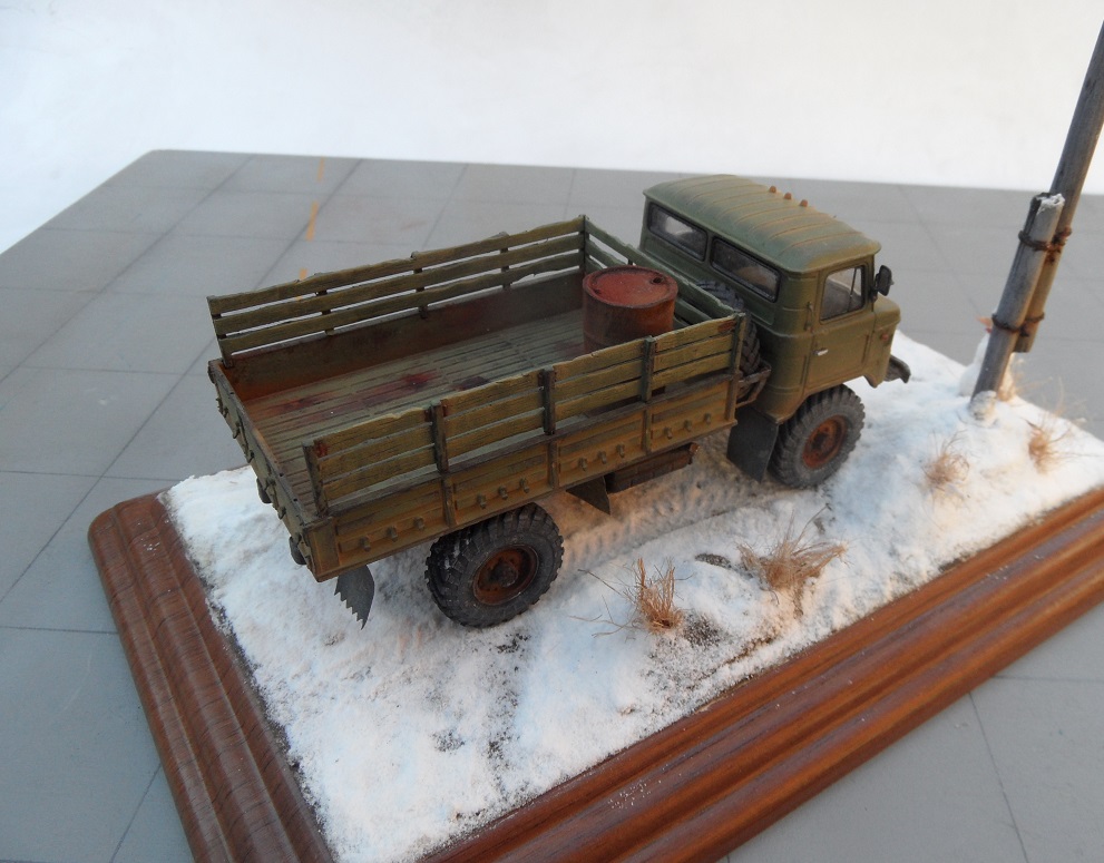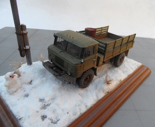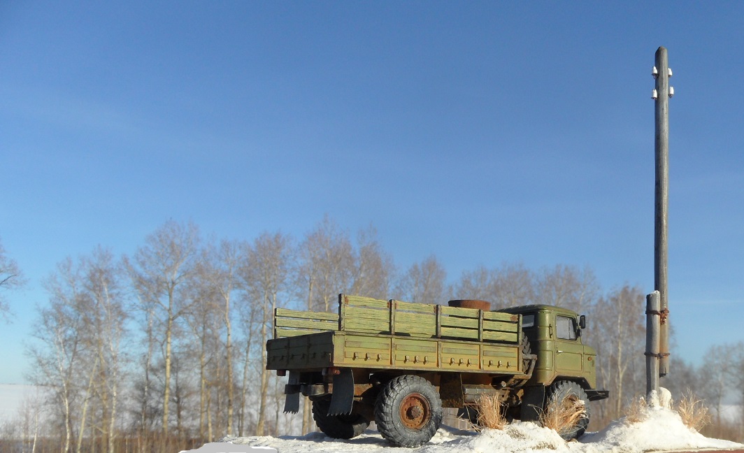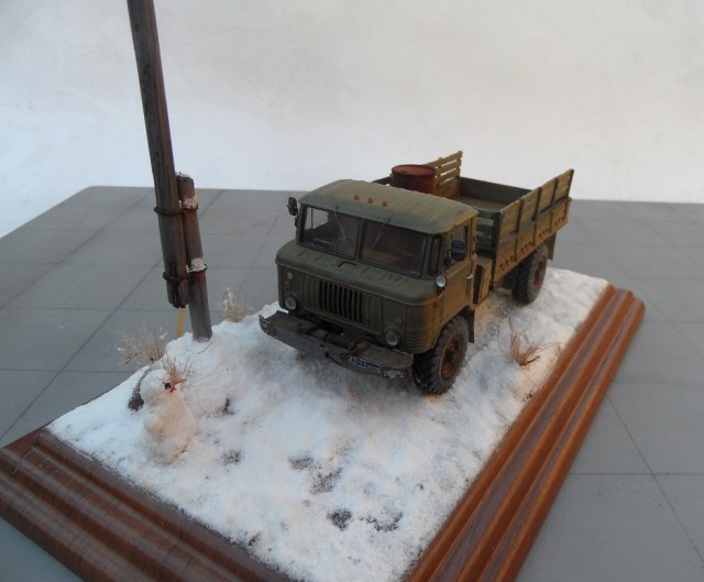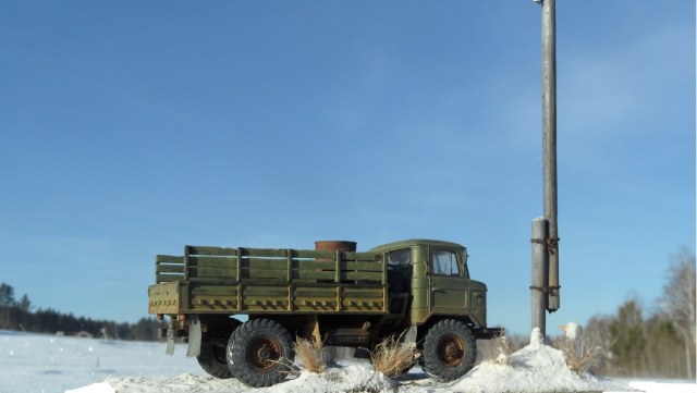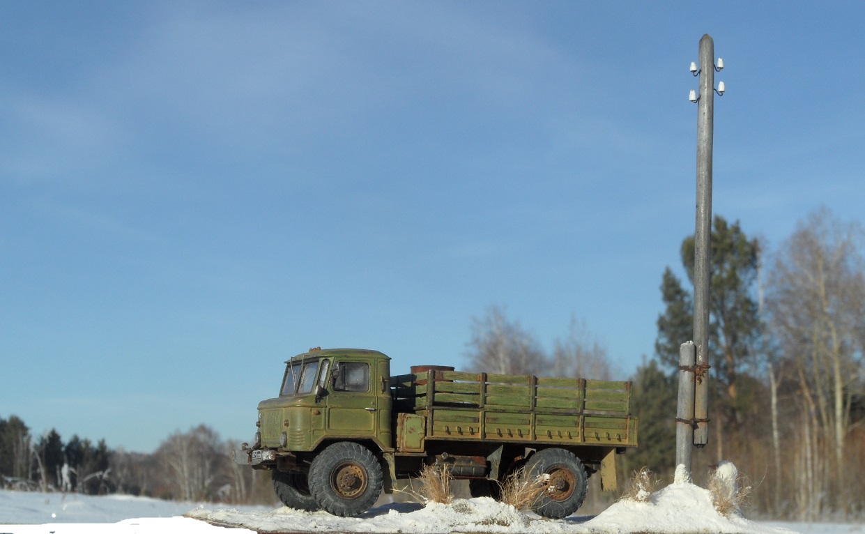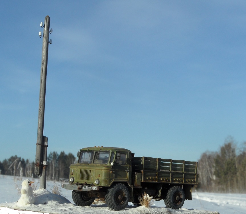 Всем привет! Сделал еще один Газик, описывать набор не стану. Из доработок резина и диски Маэстро моделс, переделаны держатели зеркал и фараискатель, сделал брызговики, знак качества- Петроград, сделал лебедку. Столб самодельный, снеговик из пластики).Окрашена Мотип хаки, тонирована пигметами Зип. Приятного просмотра!