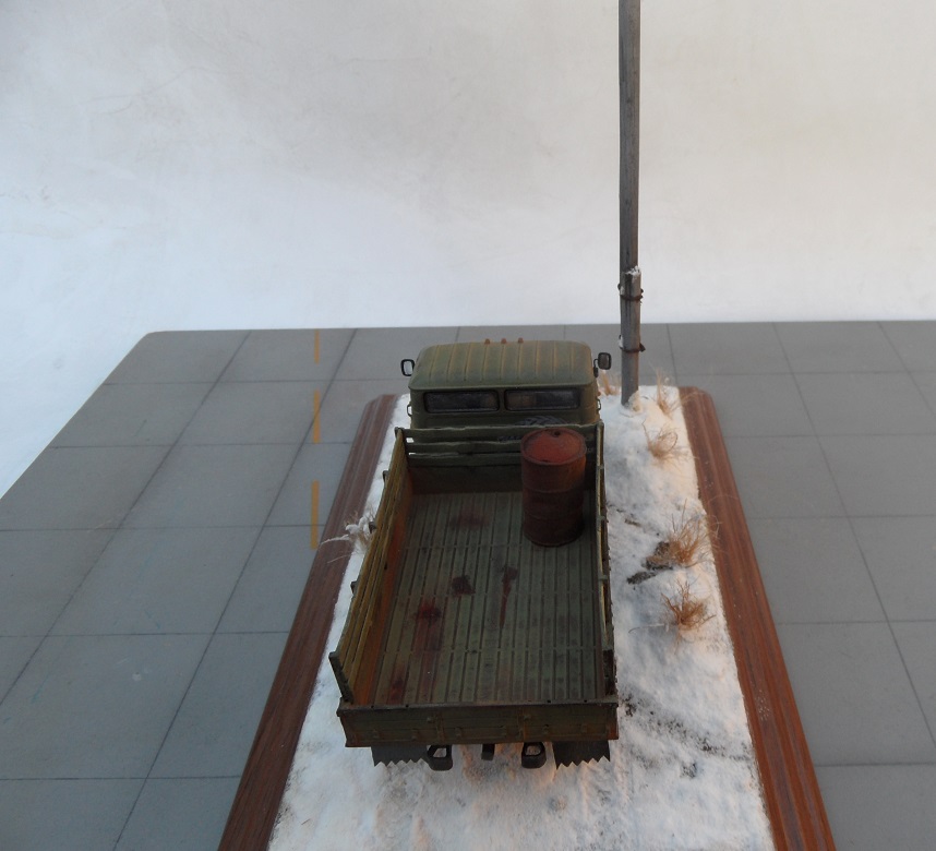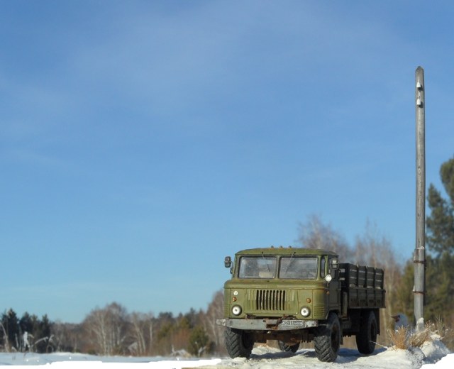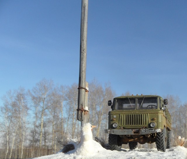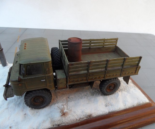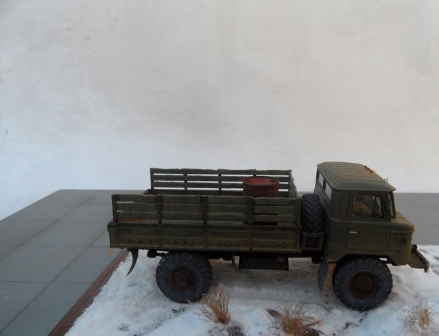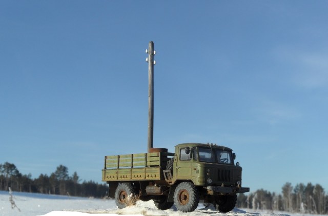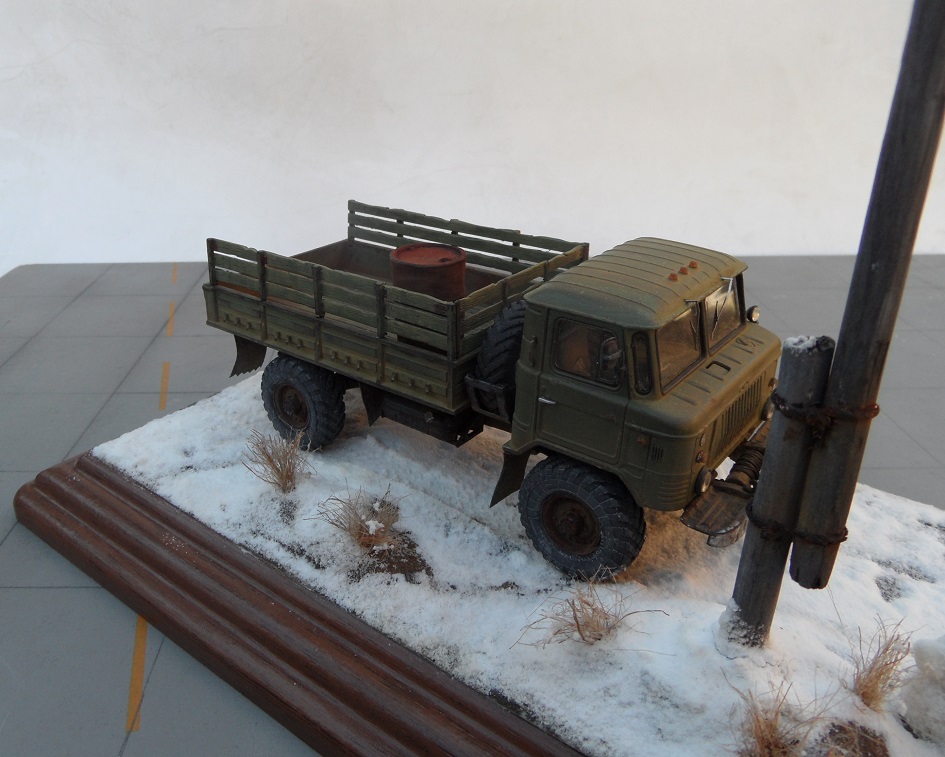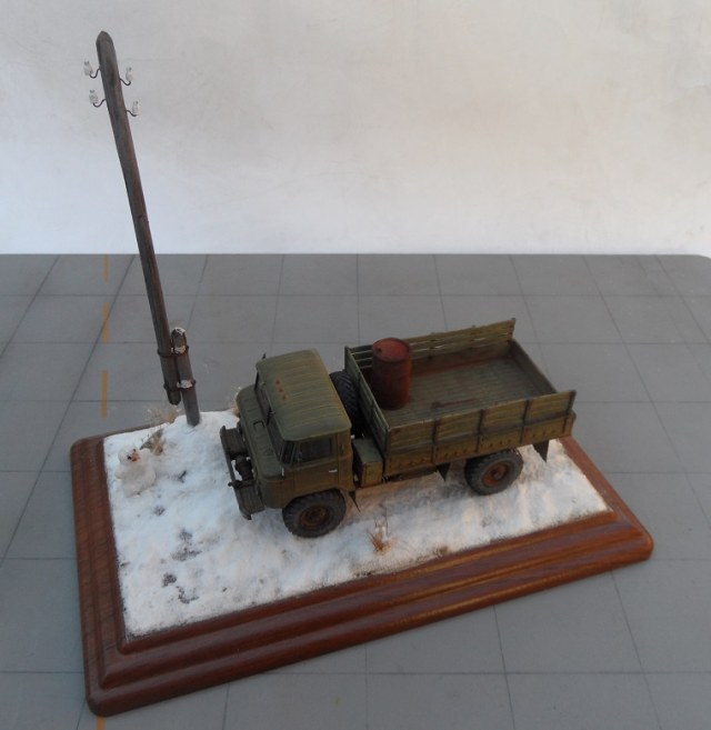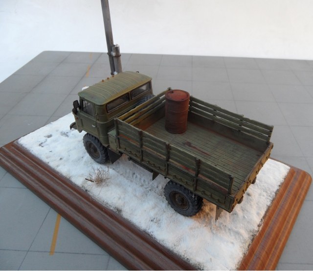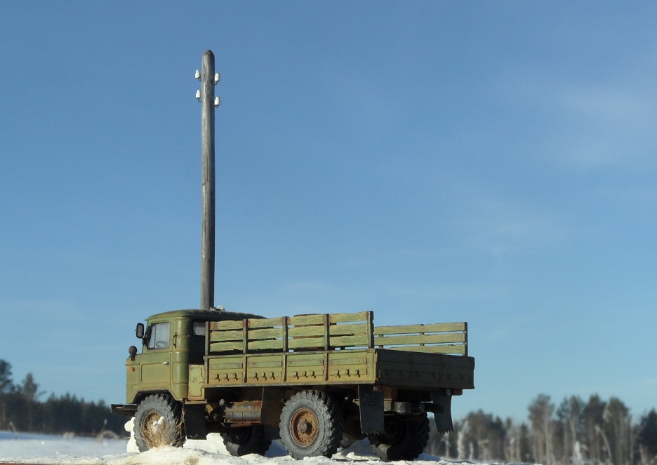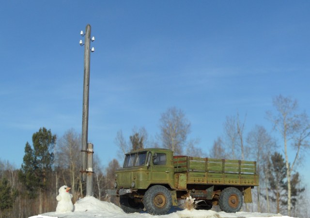 Всем привет! Сделал еще один Газик, описывать набор не стану. Из доработок резина и диски Маэстро моделс, переделаны держатели зеркал и фараискатель, сделал брызговики, знак качества- Петроград, сделал лебедку. Столб самодельный, снеговик из пластики).Окрашена Мотип хаки, тонирована пигметами Зип. Приятного просмотра!