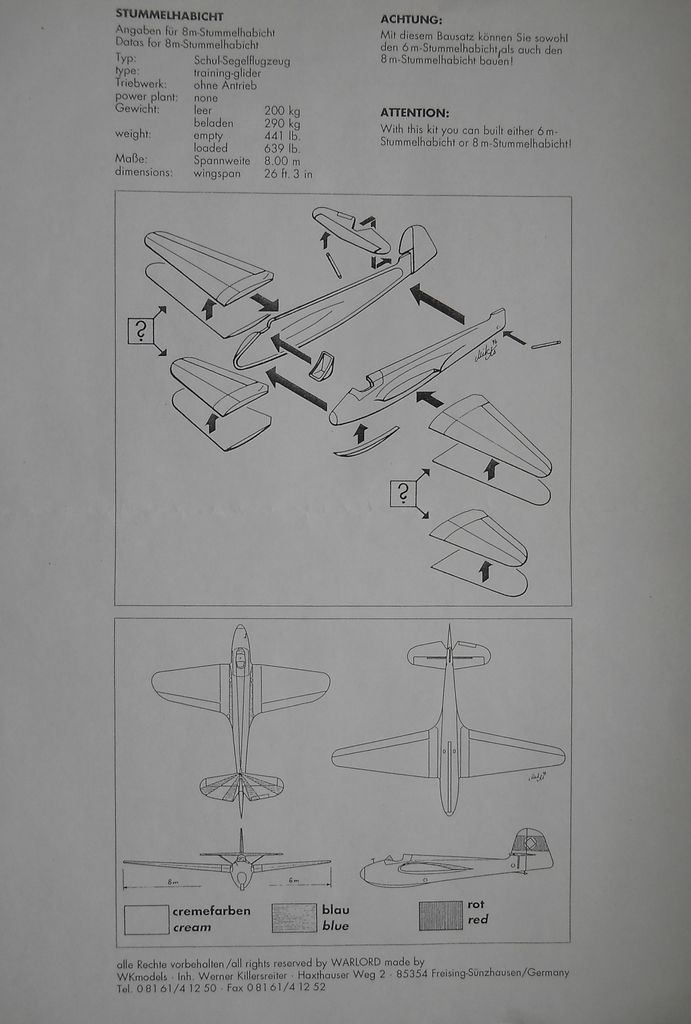 Набор от Warlord в масштабе 1/72 упакован в картонную коробку с боковым открытием и содержит две пластиковые модели: Blohm & Voss BV. 40 в версии планера -истребителя и планер Stummelhabicht, который использовался в том числе и при обучении пилотов Me163. Stummelhabicht имеет два варианта крыла на выбор. Литьё больше похоже на ЛНД, чем на ЛВД. Все детали выглядят грубовато, расшивка переразмеренна, по наружным поверхностям присутствует «песок». Интерьеры на оба планера более чем скудны. Ваку-фонарь BV. 40 посредственного качества. В моём наборе отсутствует козырёк на Stummelhabicht , хотя по комплектации он должен быть. Декаль выглядит как-то не убедительно: подложка толстовата, белый цвет с «желтинкой». Инструкция по сборке и окраске мало информативна.